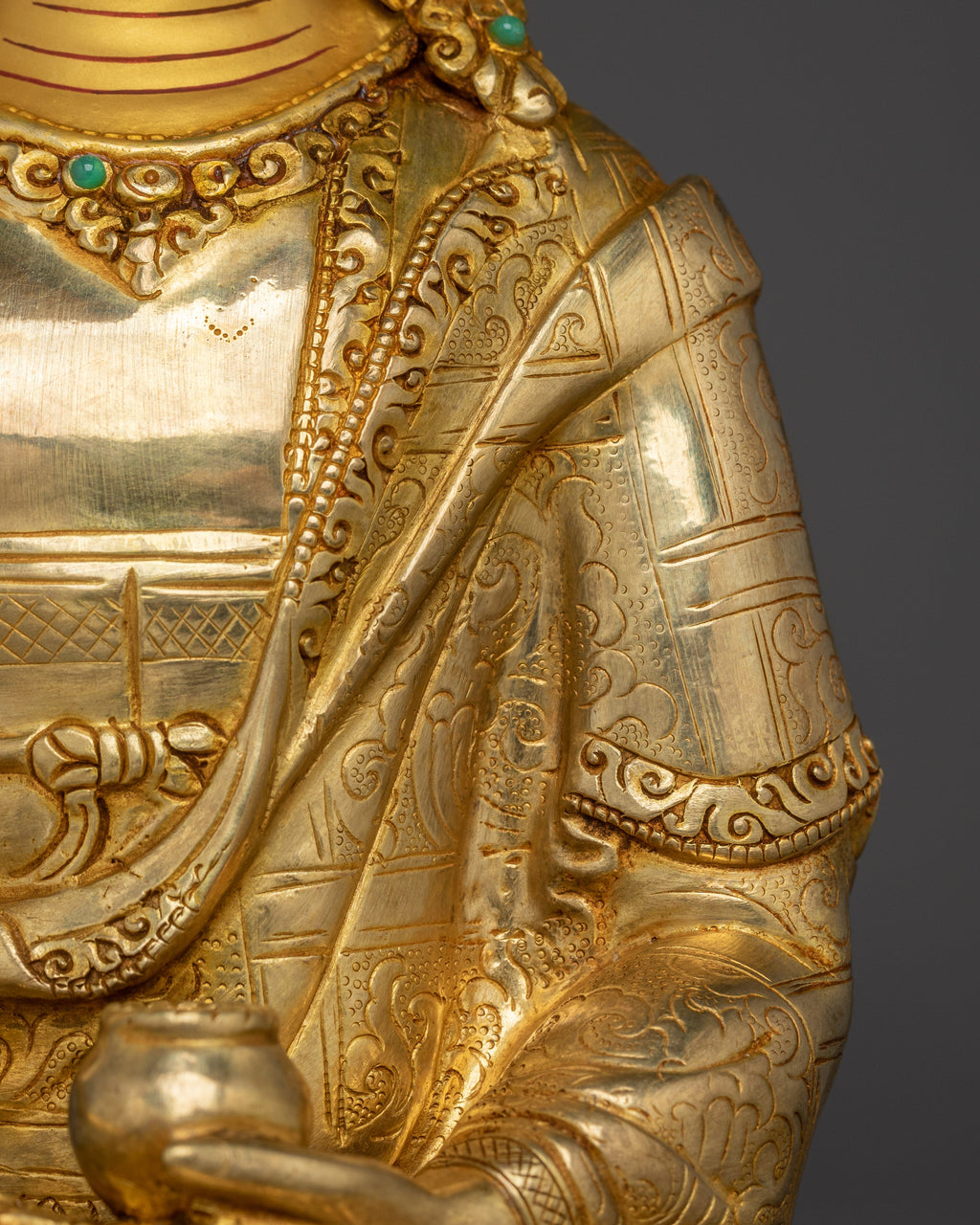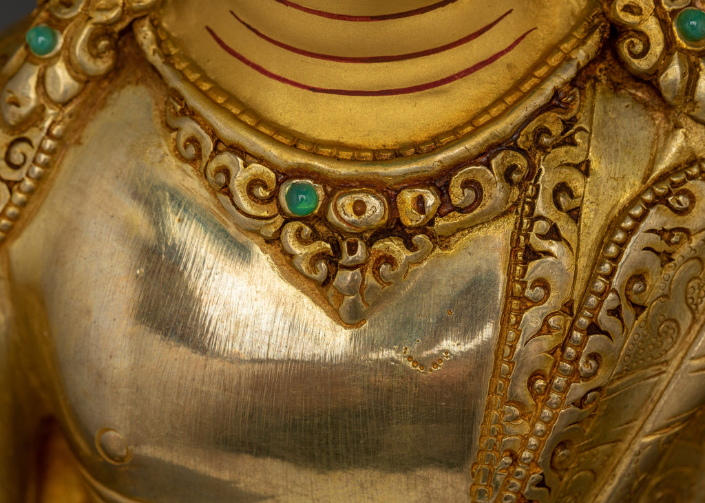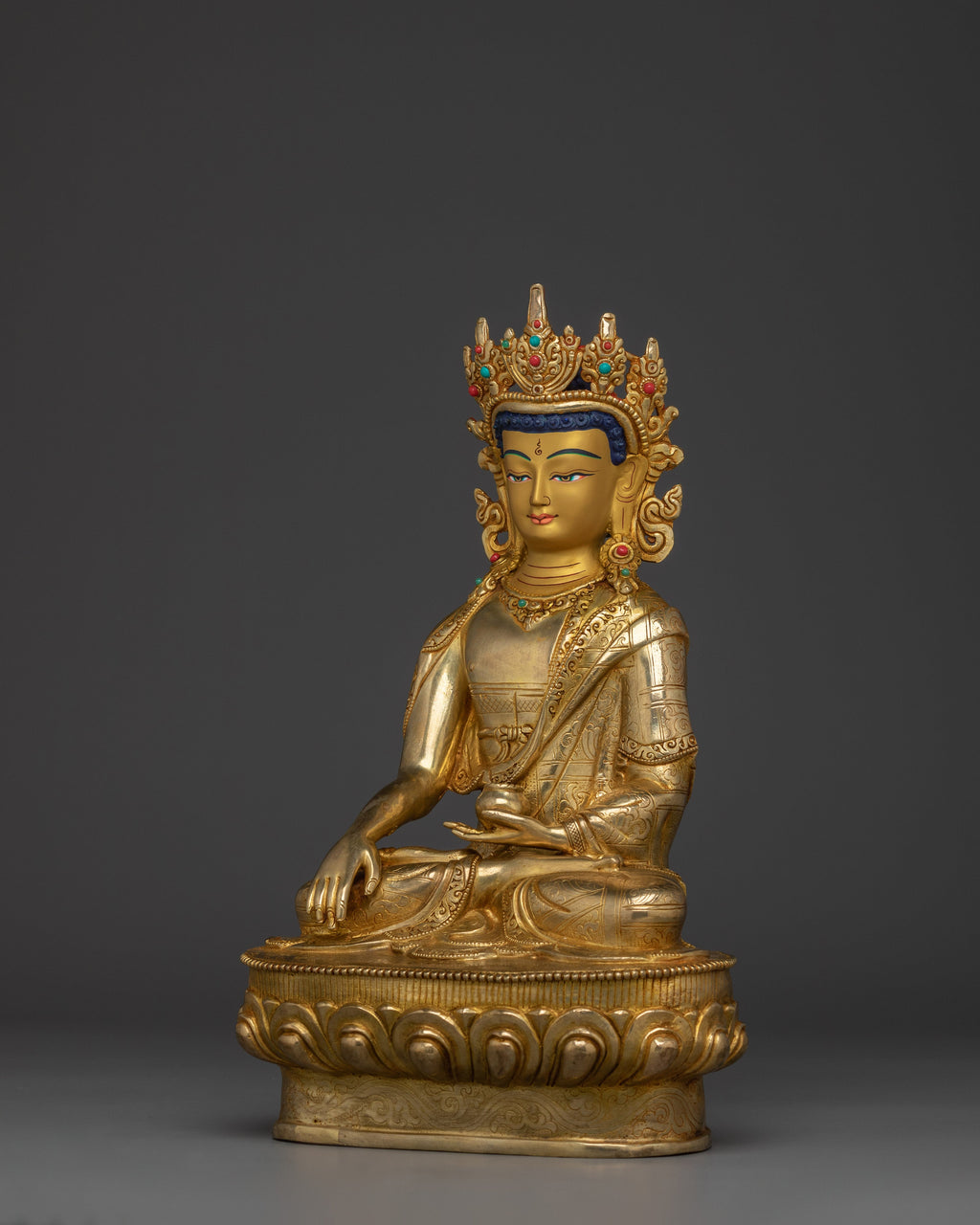 Shakyamuni Buddha is traditionally depicted seated in the vajrāsana, or full-lotus posture, symbolizing unwavering stability and deep meditation. His right hand reaches down to touch the earth in the bhūmisparśa mudrā—the earth-touching gesture—representing the moment he called the Earth to witness his enlightenment and his victory over Māra, the embodiment of temptation and illusion. His left hand rests in his lap in the dhyāna mudrā, the gesture of meditation, often holding a begging bowl that signifies renunciation and the simplicity of the monastic path. Adorning his head is a five-jeweled crown, encrusted with gemstones, which symbolizes his enlightened nature and the presence of the Five Dhyani Buddhas. His serene expression and tranquil form embody the qualities of inner peace, mindfulness, and awakening.