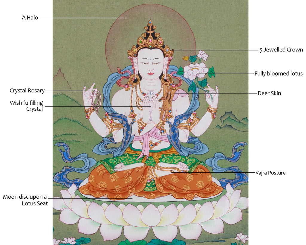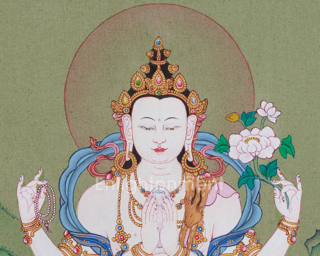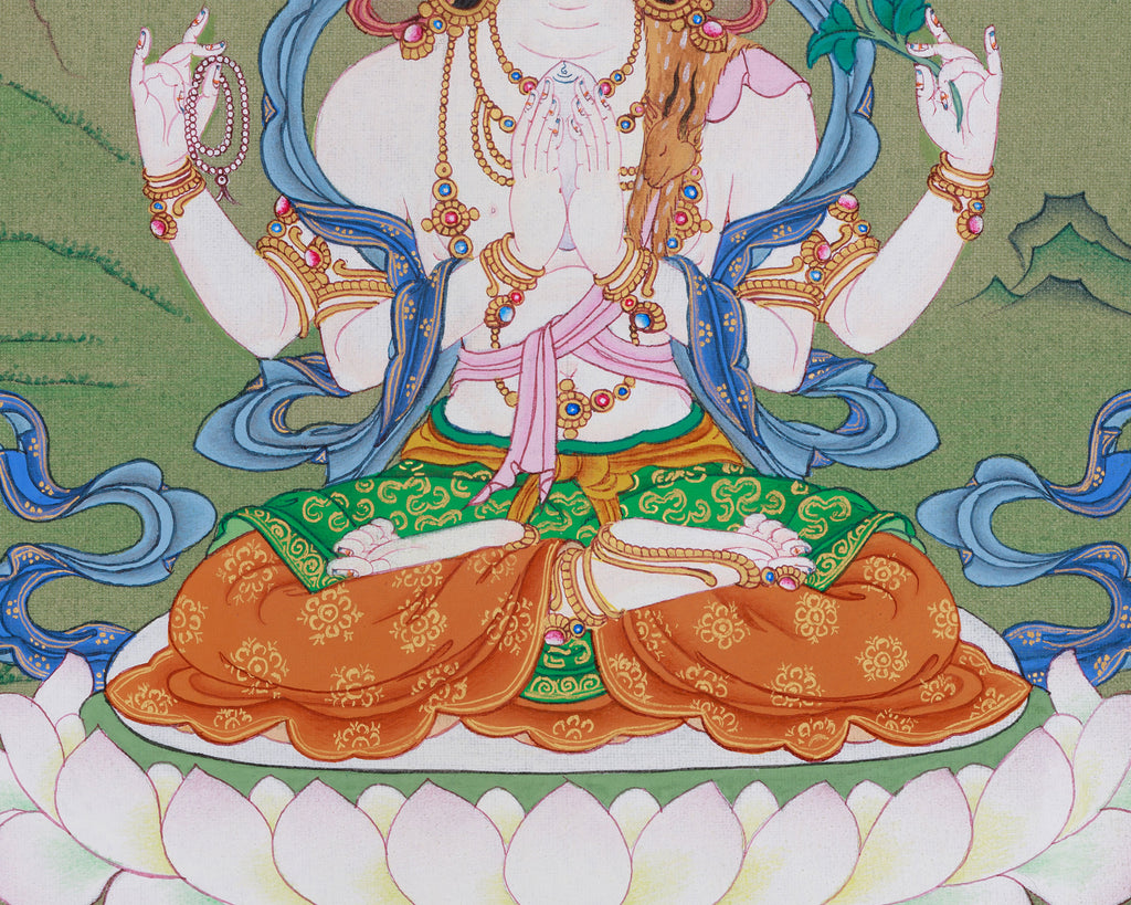 Hand-painted Beautiful Four-Armed Chenrezig Thangka | A Symbol of Compassion