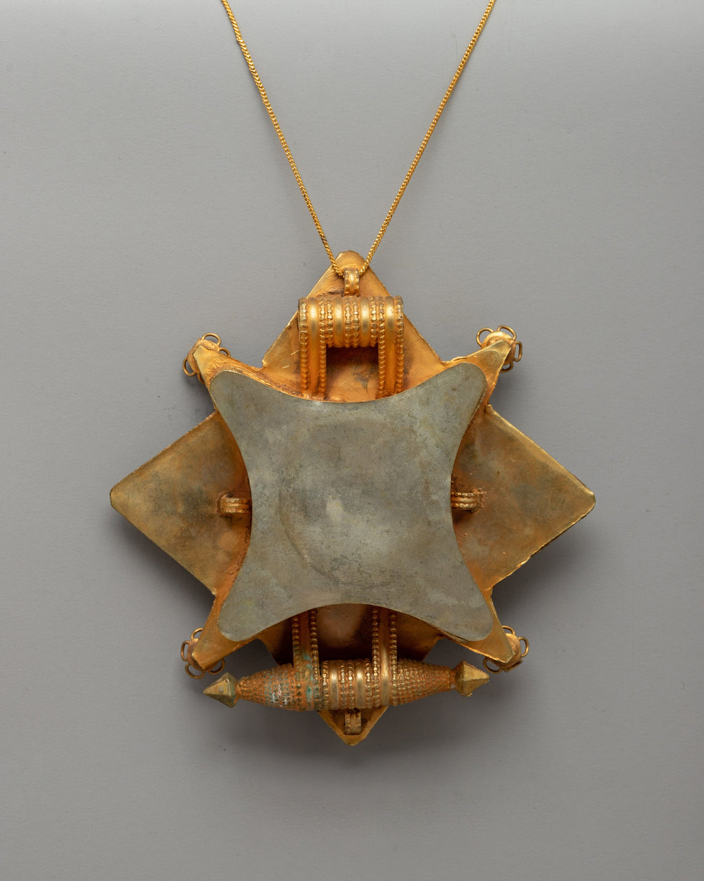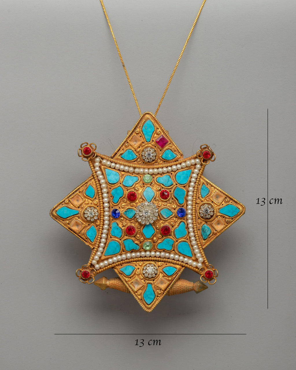 This Ghau pendant, which measures 13 cm in height and 13 cm in breadth and weighs 0.18 kilogram, is a marvel of Tibetan artistry. The meticulous workmanship and pearls and stunning jewels enhance its magnificent elegance. This protecting amulet, whether worn as a spiritual necklace, displayed on a sacred altar, or used in Buddhist rituals, carries profound spiritual significance and blessings.