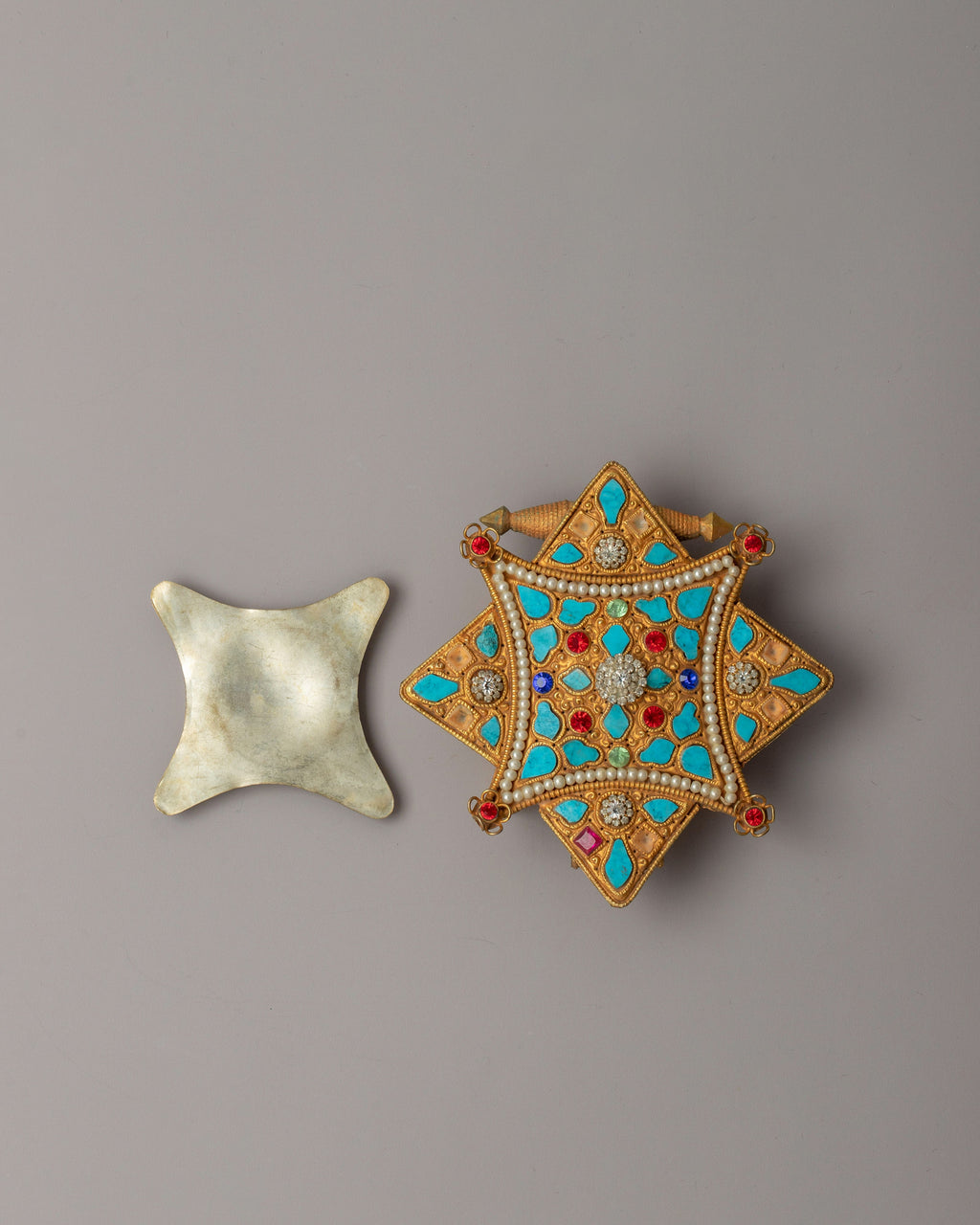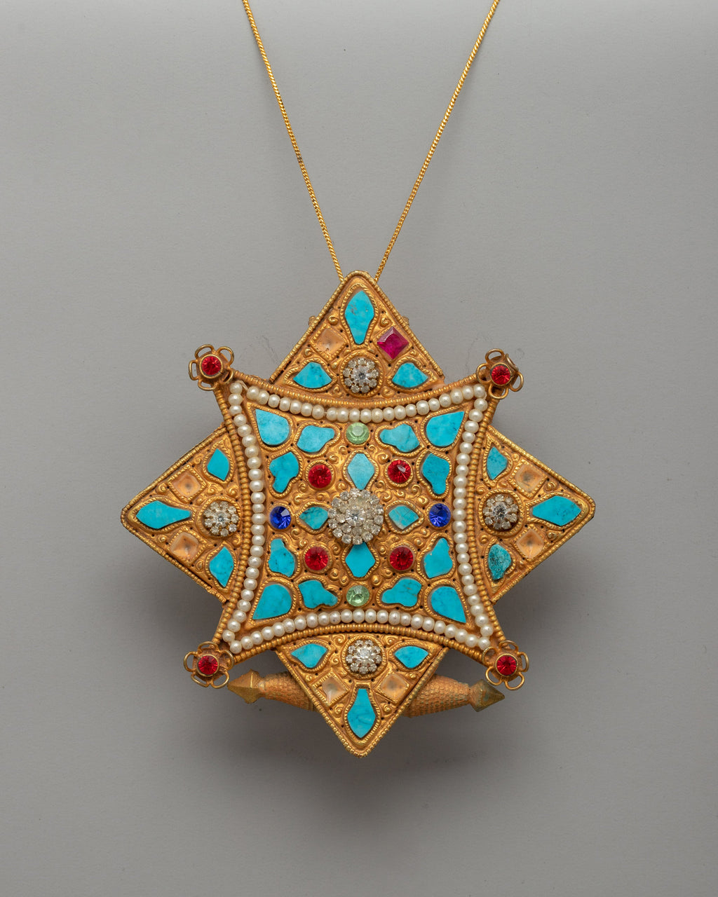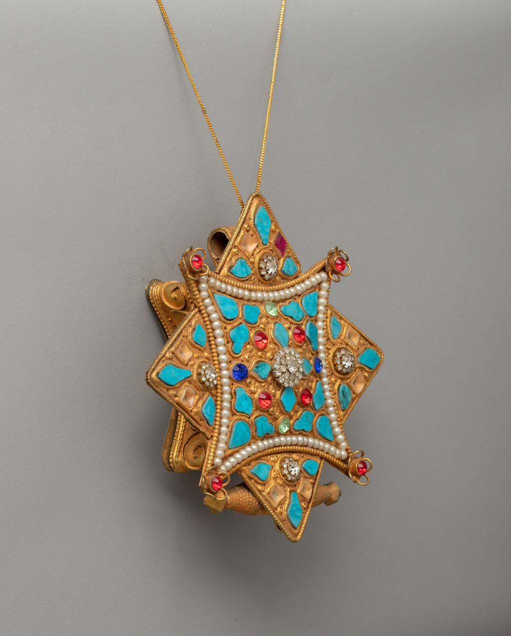 This handcrafted Beautiful Tibetan Ghau Locket is a precious Buddhist amulet that traditionally serves as a prayer box for small relics, mantras, or protective symbols. This gorgeous item, made of copper with electro-gold plating, is embellished with semi-precious stones such as turquoise and coral, representing spiritual protection, knowledge, and vitality, respectively.