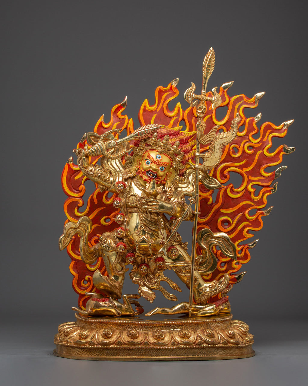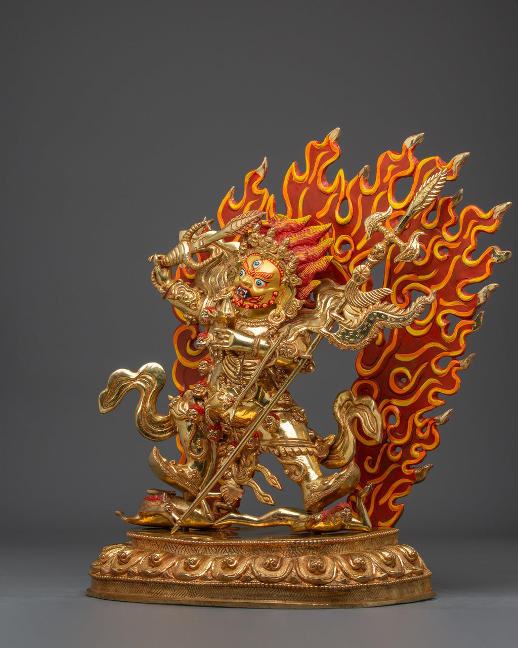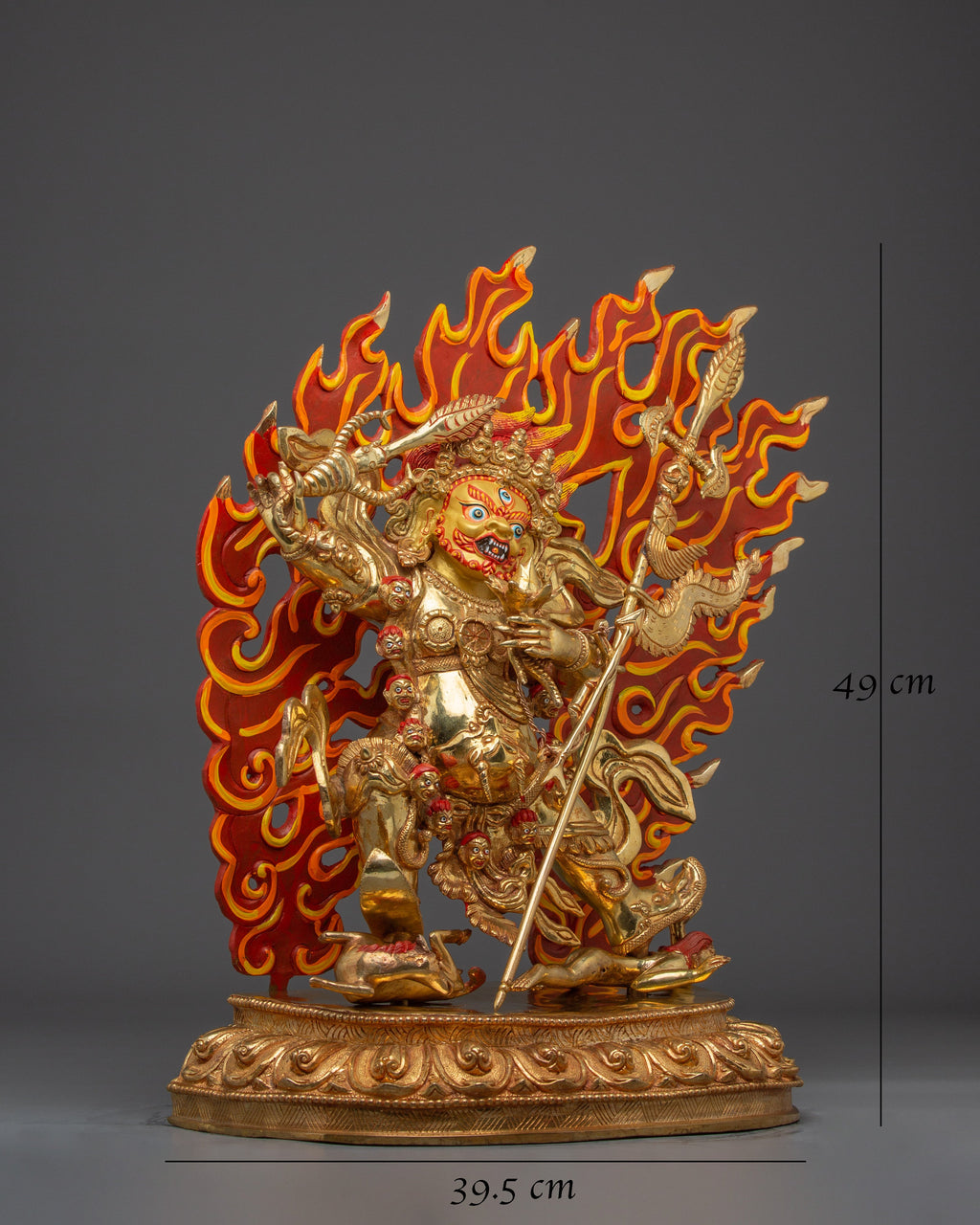 The Begtsechen Mahakala Statue measures 19.3 inches (49 cm) in height and 15.6 inches (39.5 cm) in diameter at the base. It weighs 11.26 kilograms and is crafted with 24K gold gilding, gold and acrylic paintings, and a copper body. This sculpture radiates power and sacred presence, ideal for a meditation altar or spiritual space.