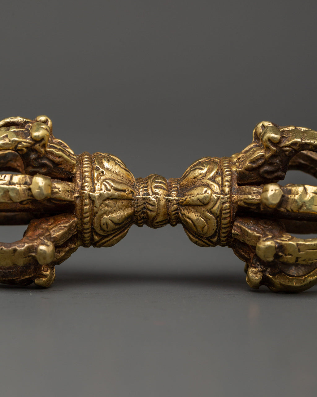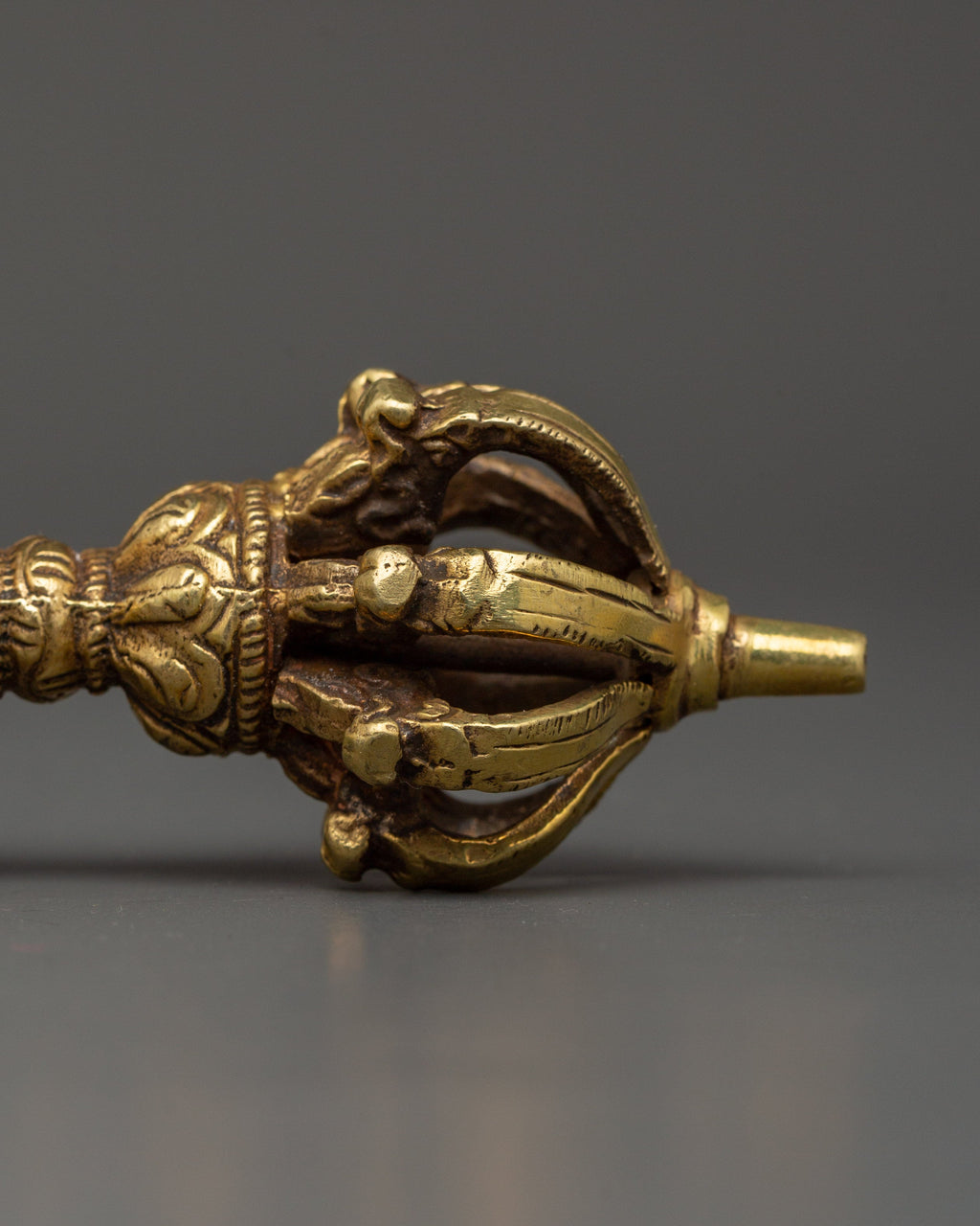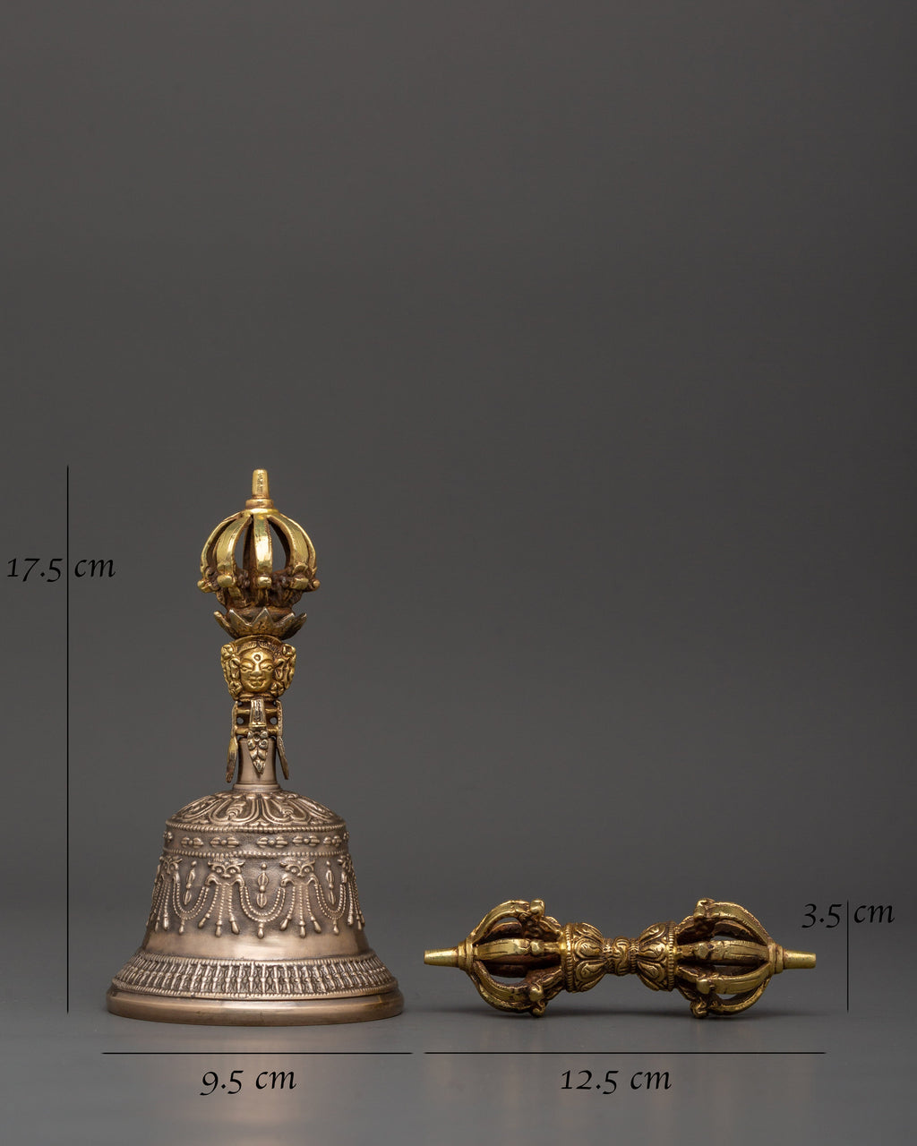 Accompanying the bell is the Vajra, a powerful and protective tool that embodies spiritual strength and indestructibility. The Vajra, crafted with ornate detailing, is a symbol of the unity of method and wisdom in Vajrayana Buddhism. Often referred to as the "thunderbolt," it represents the removal of obstacles and the firm, unshakable nature of Buddha’s teachings. Together, the bell and vajra form a harmonious set, bringing together the forces of wisdom and compassion, purification and protection.