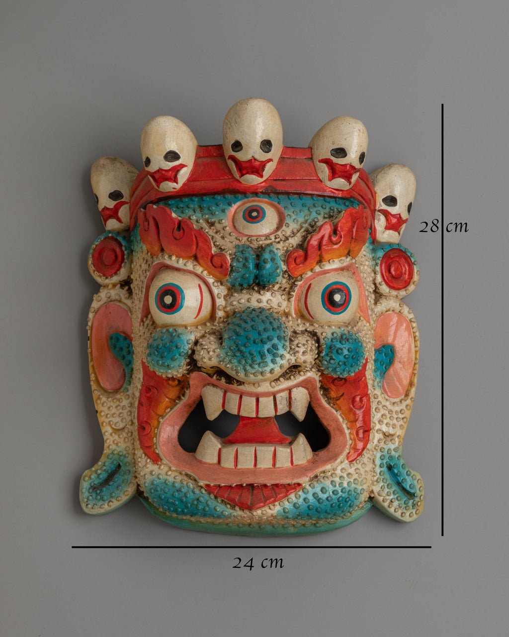 The mask showcases Bhairav’s fierce expression—wide eyes, open mouth, and powerful facial features carved with precision. These motifs symbolize heightened awareness, spiritual authority, and courage. The acrylic paintwork highlights every detail, from the expressive eyes to the ornamental headgear, creating a visually captivating and culturally rich appearance. The hand-carved wood adds texture and depth, emphasizing the craftsmanship rooted in traditional Himalayan artistry.