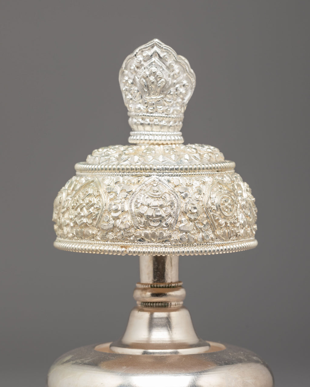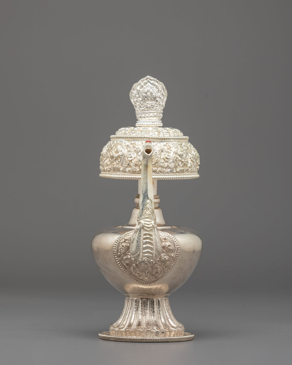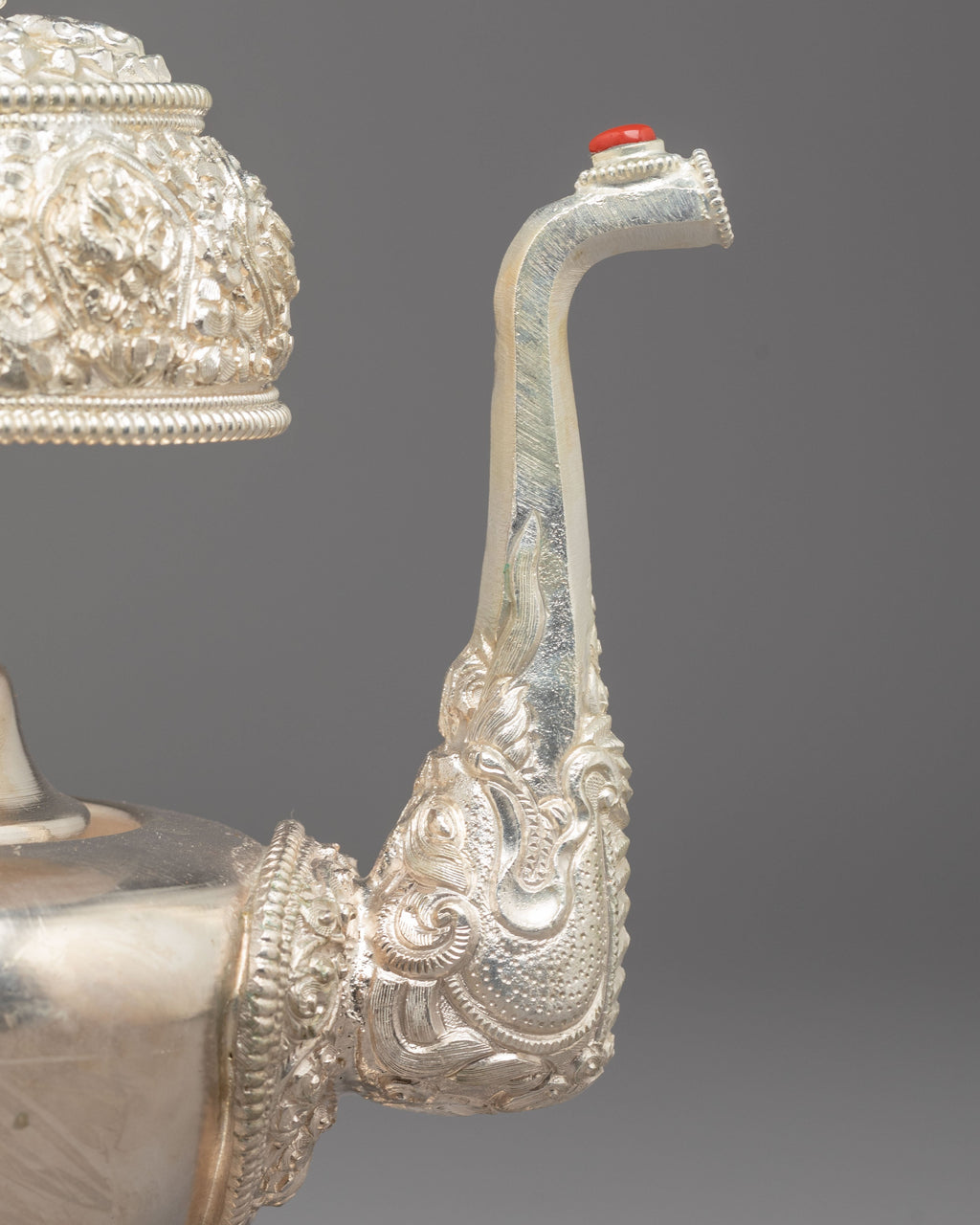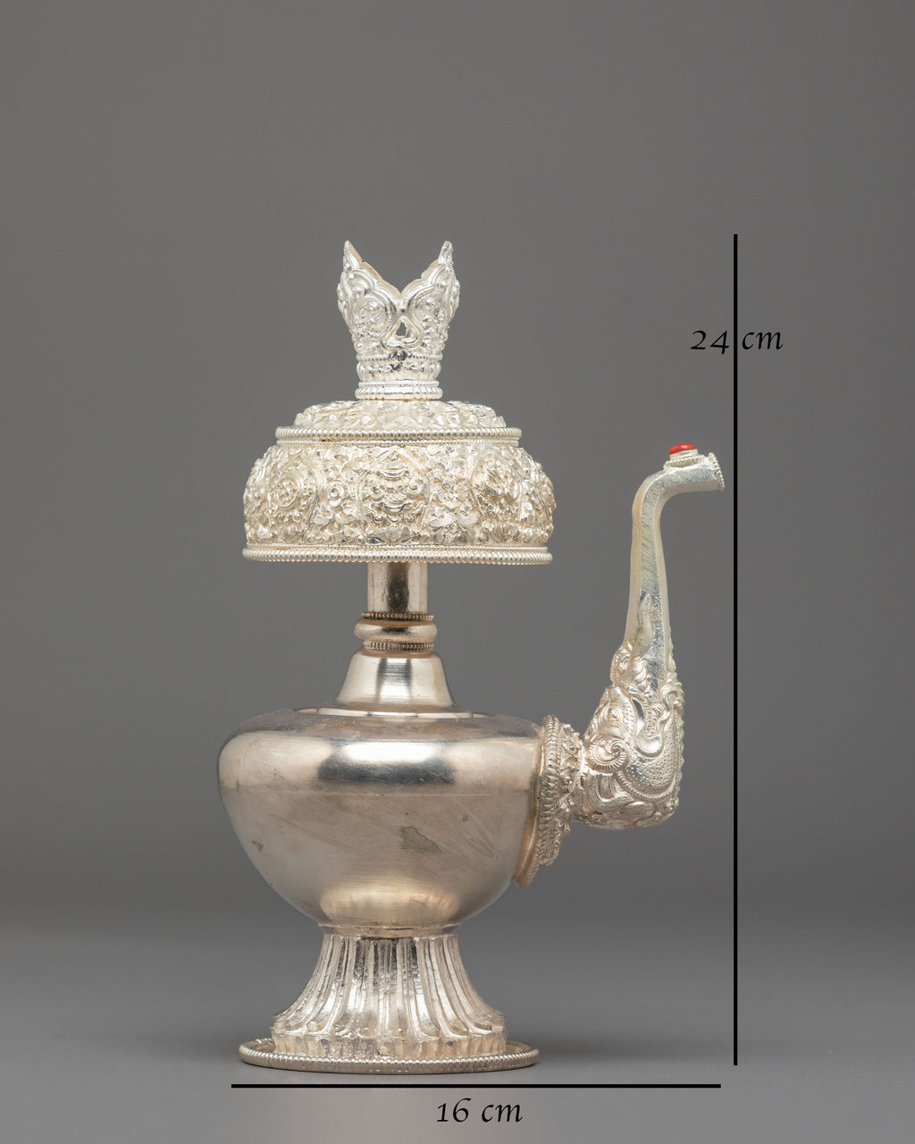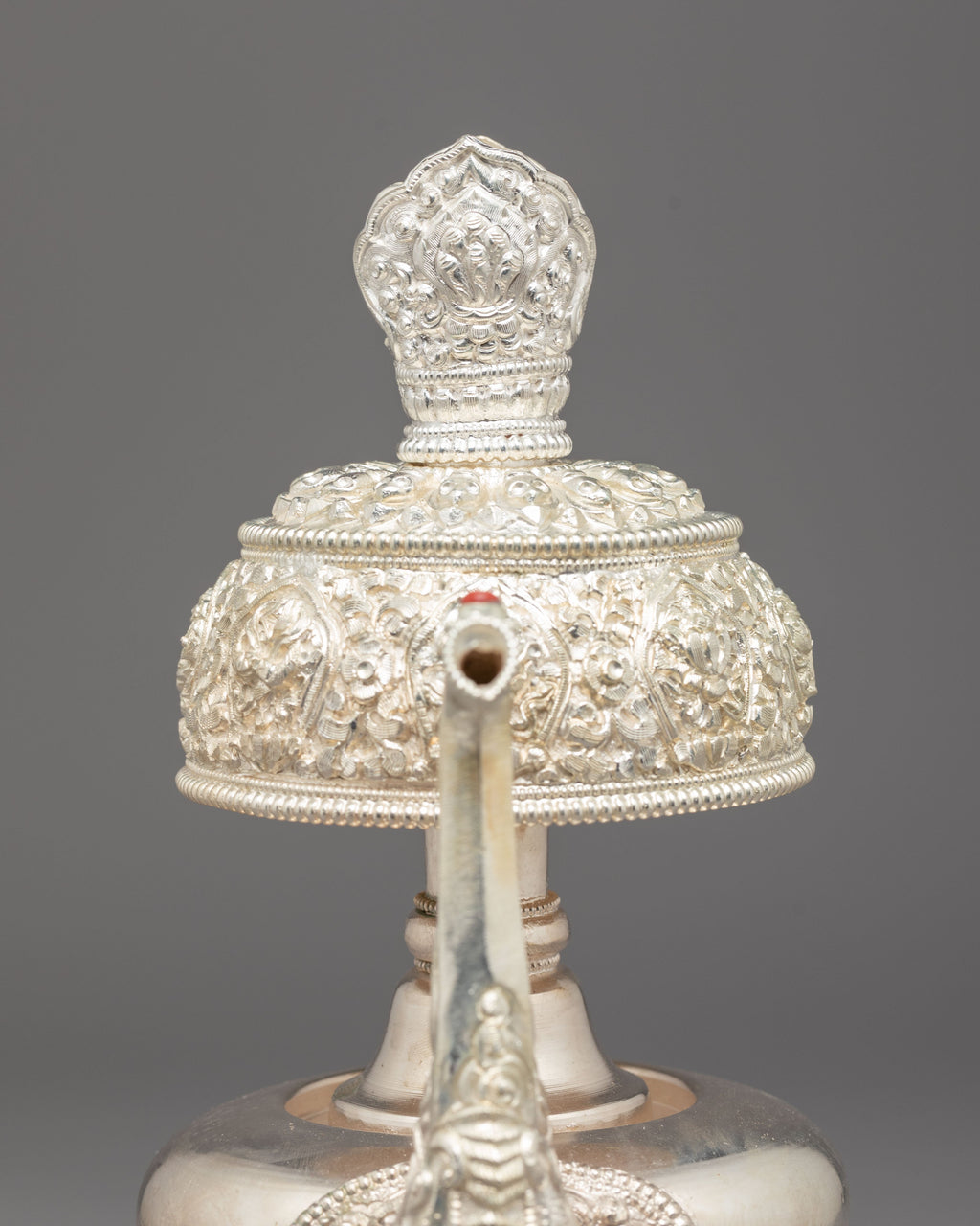 The intricate design includes a crown-like lid, symbolizing divinity and sacredness, while the spout and detailed motifs around the body add charm to the overall look. The silver-plated finish gives it a reflective, shining appearance, making it a standout piece in any spiritual space.