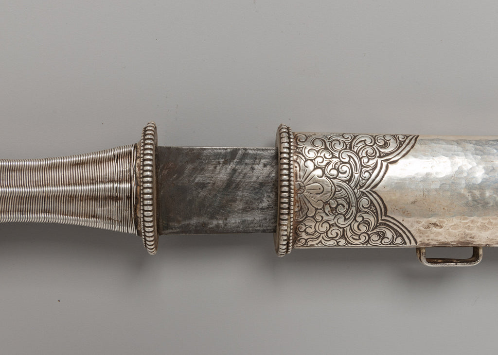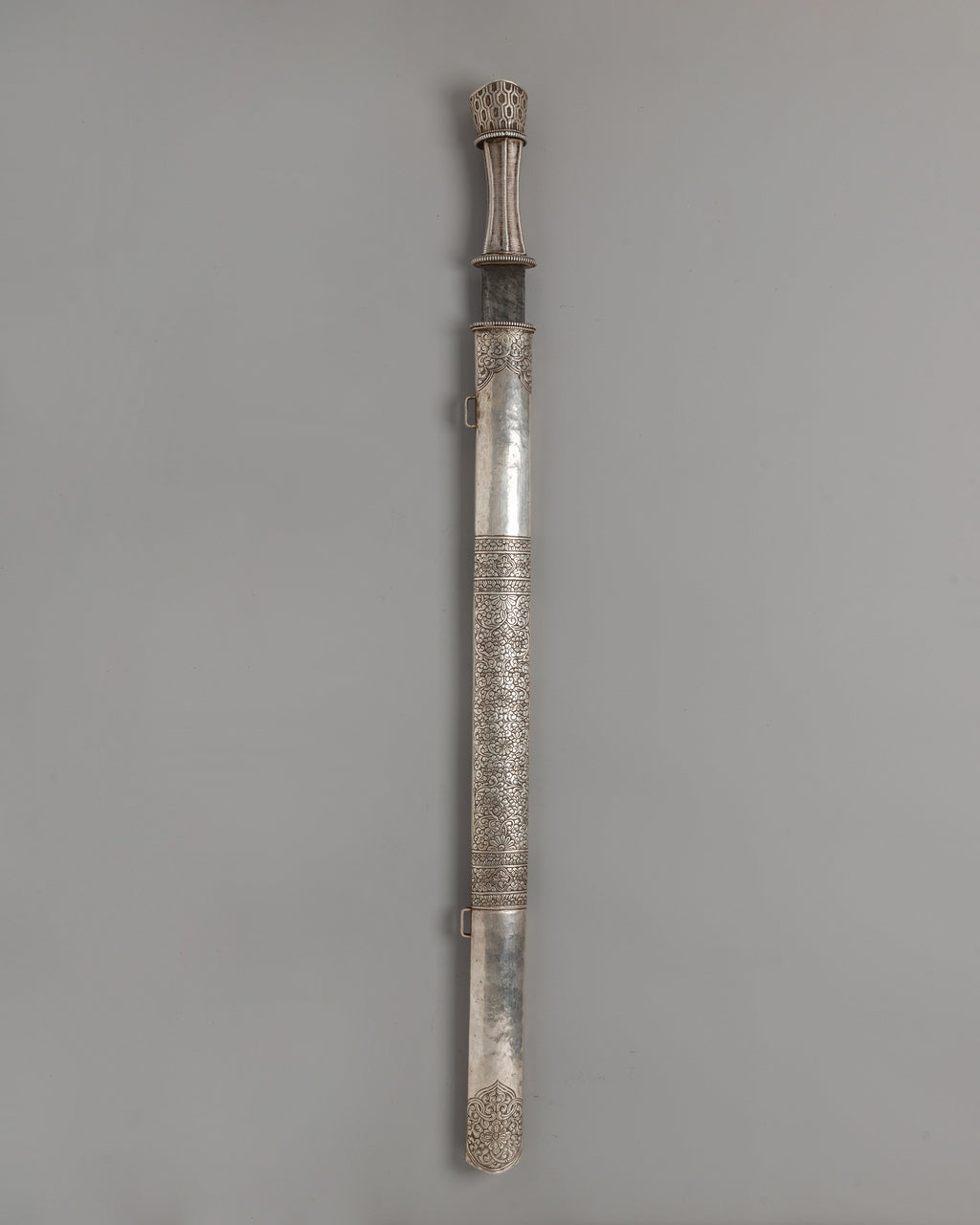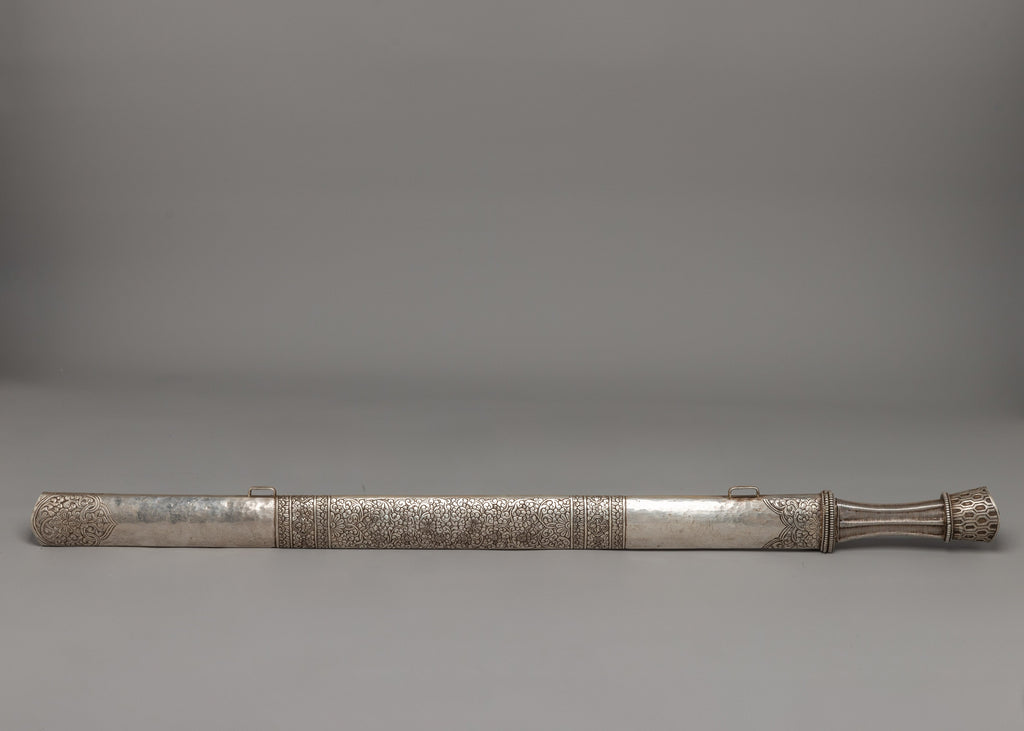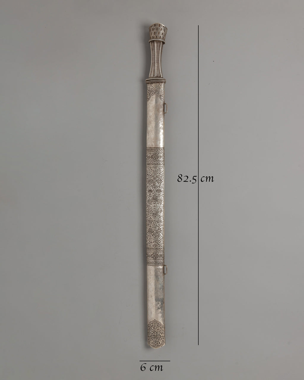 Experience the elegance and profound spirituality of Bhutanese craftsmanship by handling this handcrafted Bhutanese Silver Sword. 92.5% silver is utilized to create this ceremonial sword, 82.5 cm tall and 6 cm wide, with elaborate traditional Bhutanese-style symbols. It is a magnificent ornament and a powerful sign of protection and spiritual strength, weighing 1.76 kg.