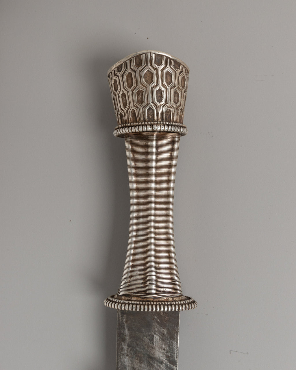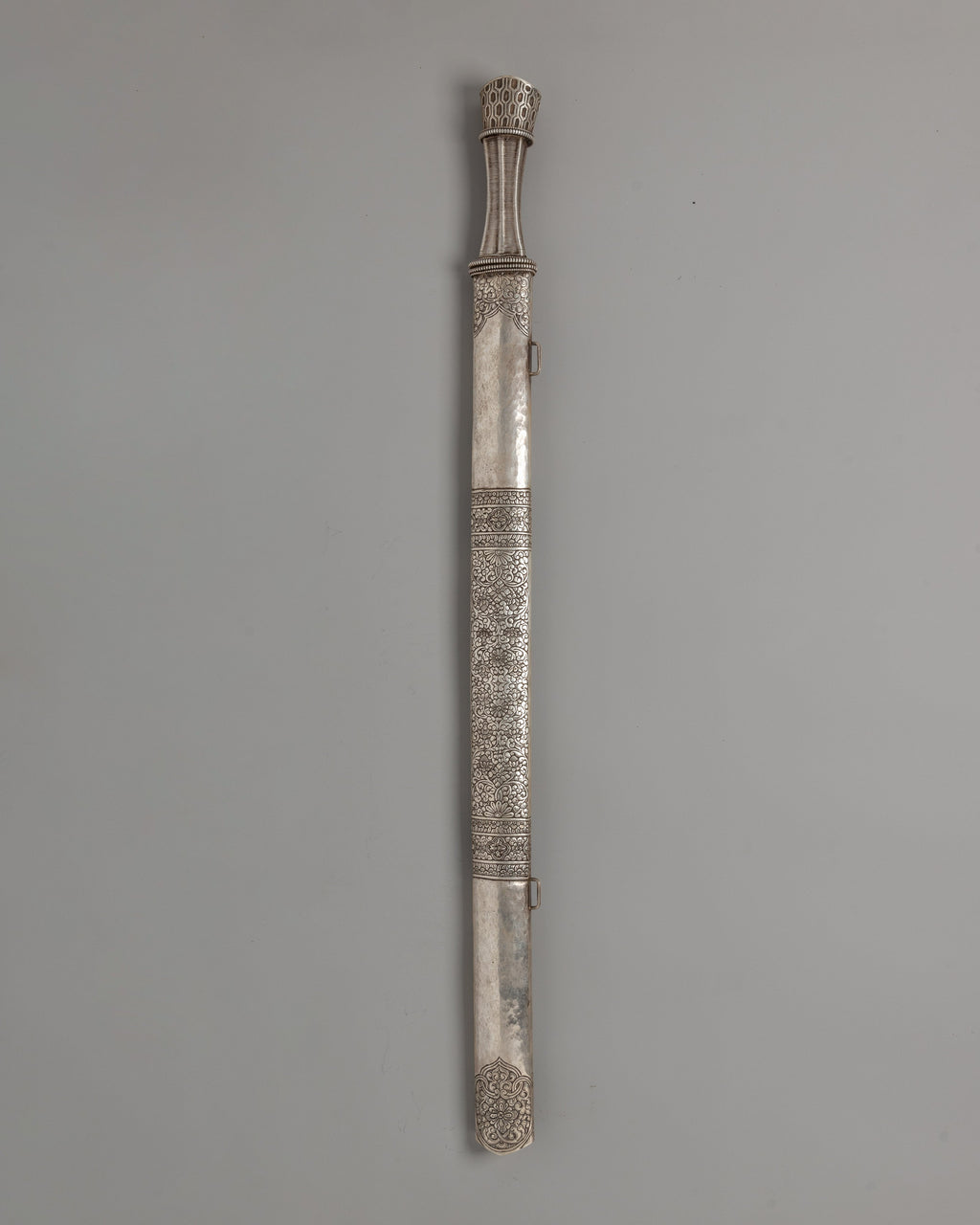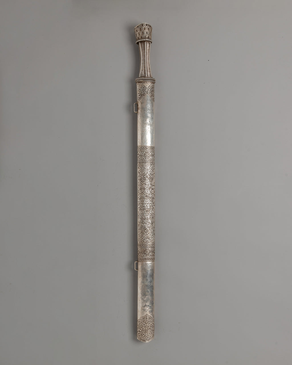 Experience the elegance and profound spirituality of Bhutanese craftsmanship by handling this handcrafted Bhutanese Silver Sword. 92.5% silver is utilized to create this ceremonial sword, 82.5 cm tall and 6 cm wide, with elaborate traditional Bhutanese-style symbols. It is a magnificent ornament and a powerful sign of protection and spiritual strength, weighing 1.76 kg.