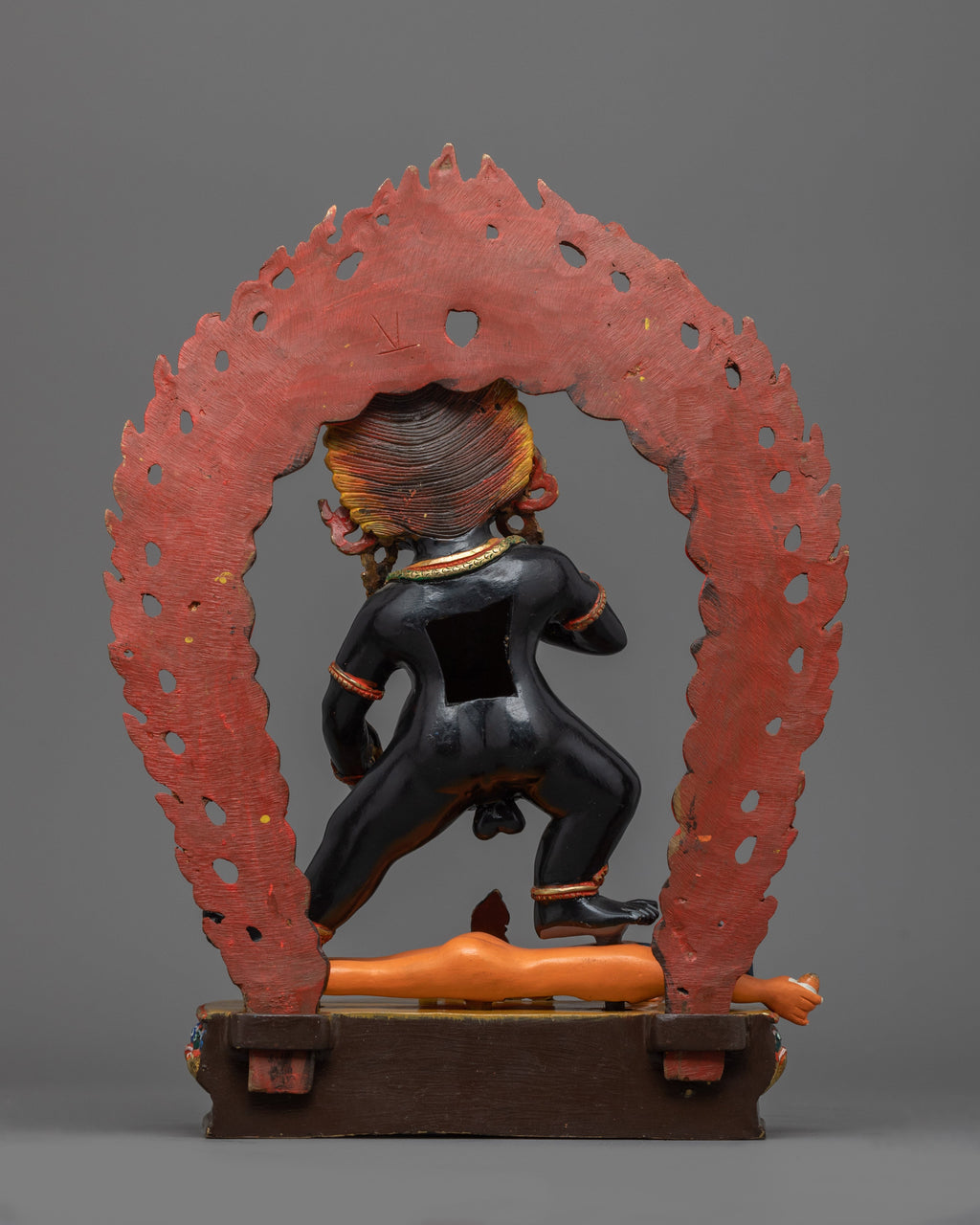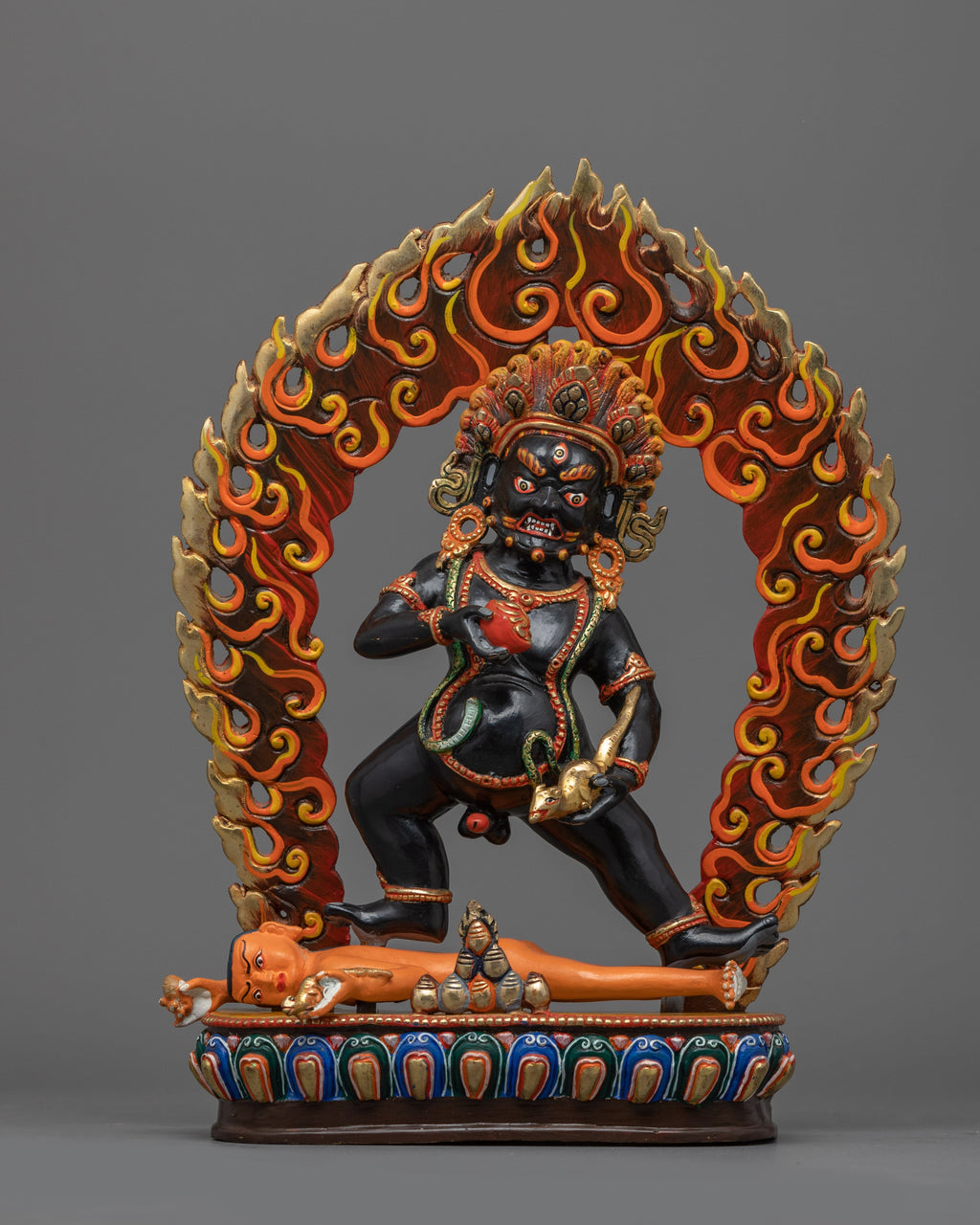 Black Dzambhala, one of Dzambhala's five incarnations, is renowned as a wealth defender and financial hurdle remover. His strong expression represents his ability to overcome adversity and attract success. Black Dzambhala is frequently invoked by individuals trying to overcome difficulties and create both worldly wealth and spiritual abundance.