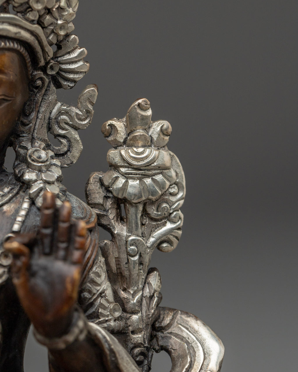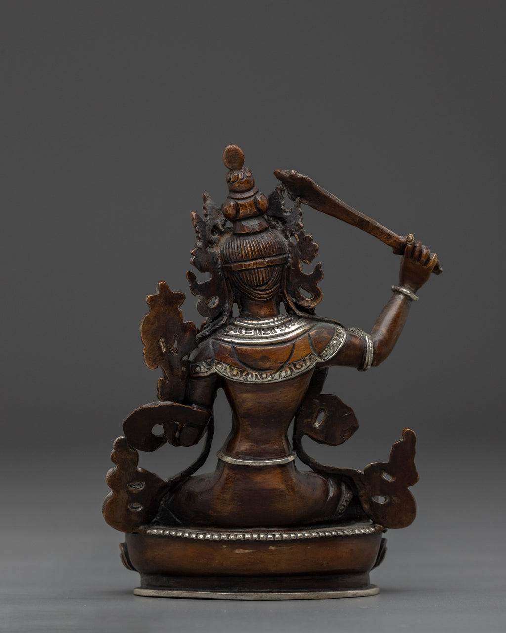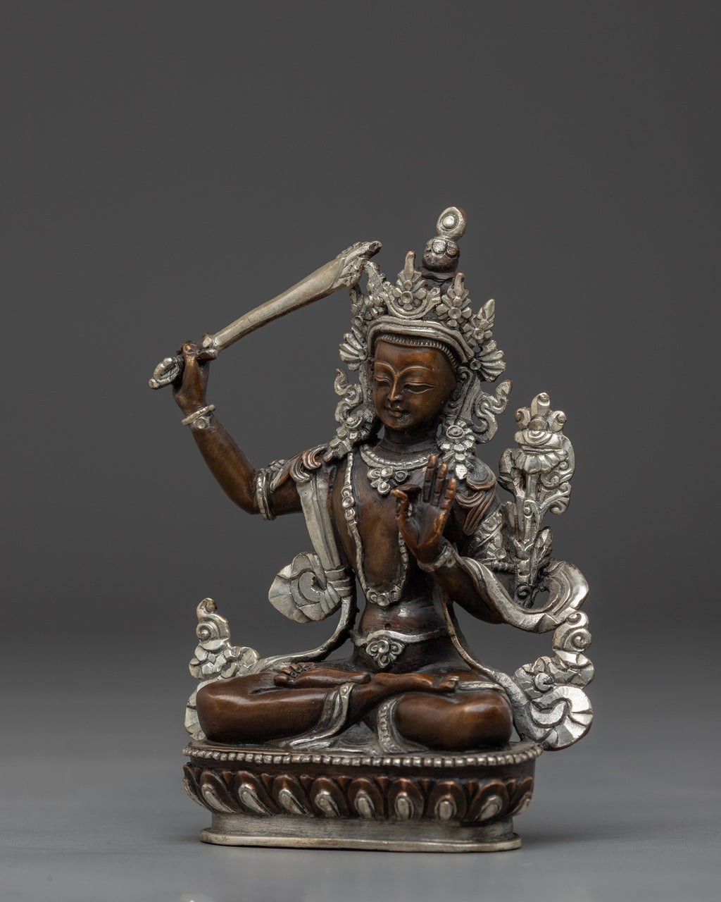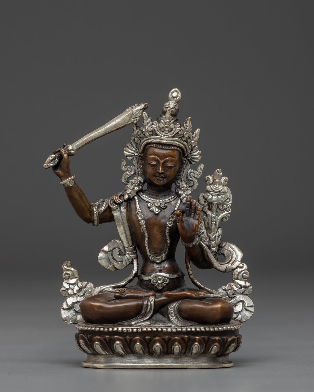 This Himalayan Black Oxidized Manjushri Statue, also known as the Bodhisattva of Wisdom, stands at 5.5”/14cm in height and 4.1”/10.5cm at the base, weighing 0.47 kg. Made from an oxidized copper body and silver-plated surface, this piece reflects a balanced contrast of dark and light tones. Expertly handcrafted by skilled Nepali artisans, it offers a compact yet striking presence, ideal for meditation spaces, study areas, or personal altars.