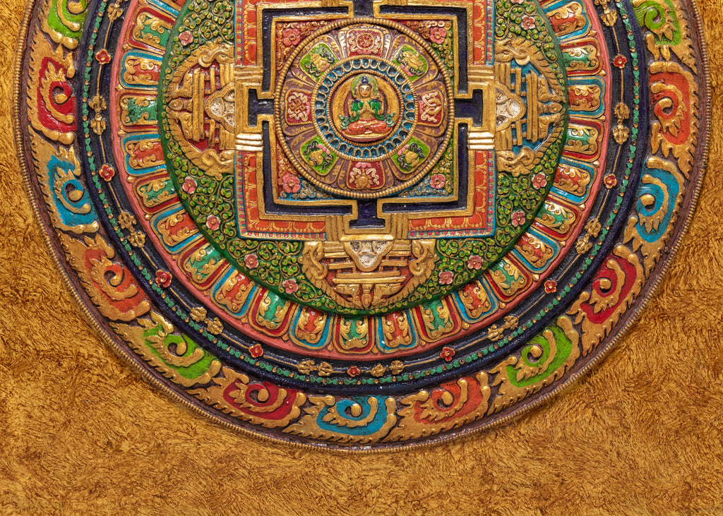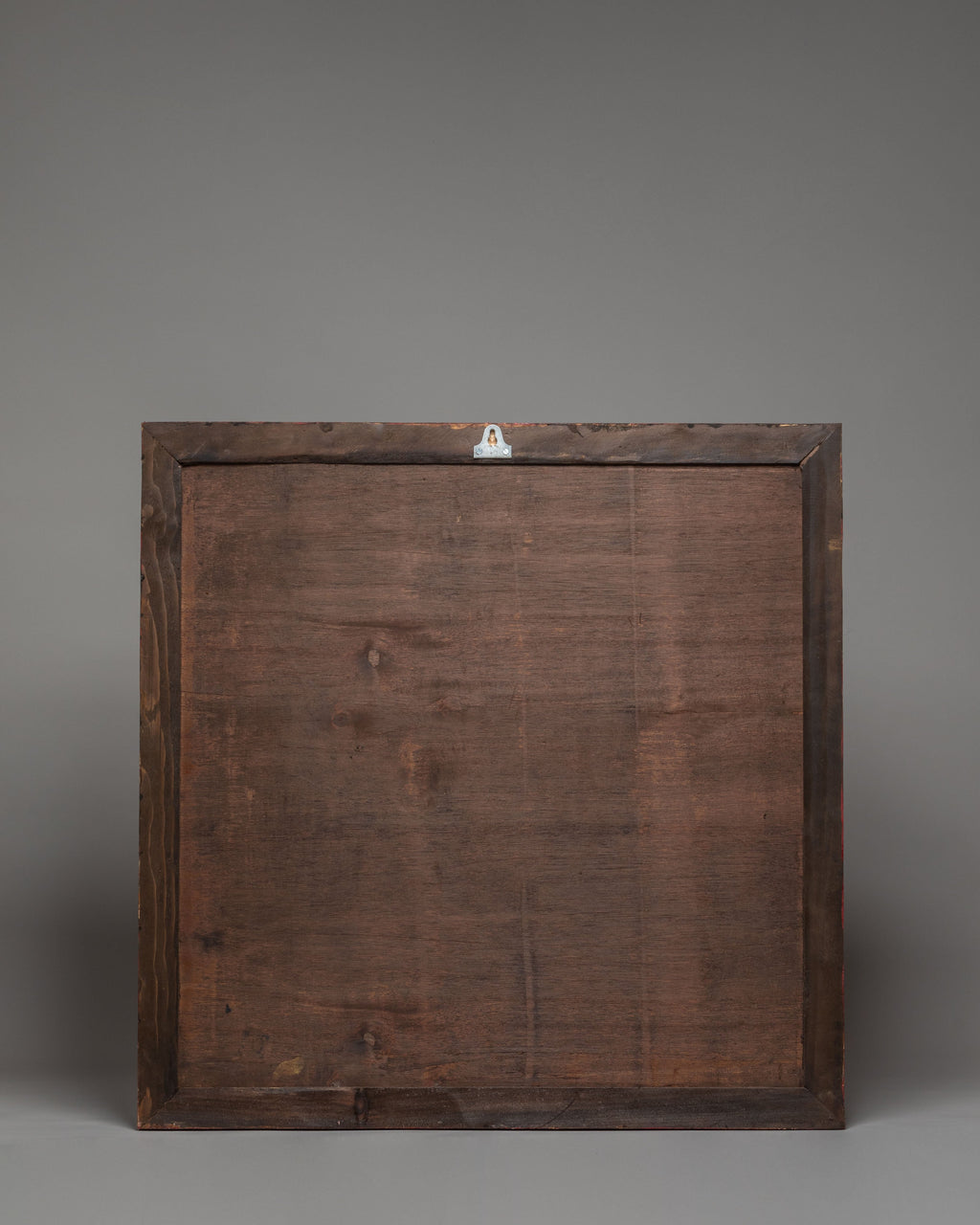 The design of the Chenrezig wall hanging features the Bodhisattva in a serene seated posture, his hands forming the classic compassionate mudra, symbolizing empathy and the ability to ease suffering. The intricate mandala design surrounding him represents the unity of the cosmos and the eternal cycle of life. Chenrezig’s 1000 arms are depicted in the artwork, each hand holding a symbol of compassion and wisdom, reinforcing his boundless capacity to offer help and blessings. The vivid colors and golden accents make the piece come alive, while the stone dust epoxy binding ensures the longevity of the craftsmanship. The wooden back provides a sturdy frame, making it easy to hang in your home or spiritual space.