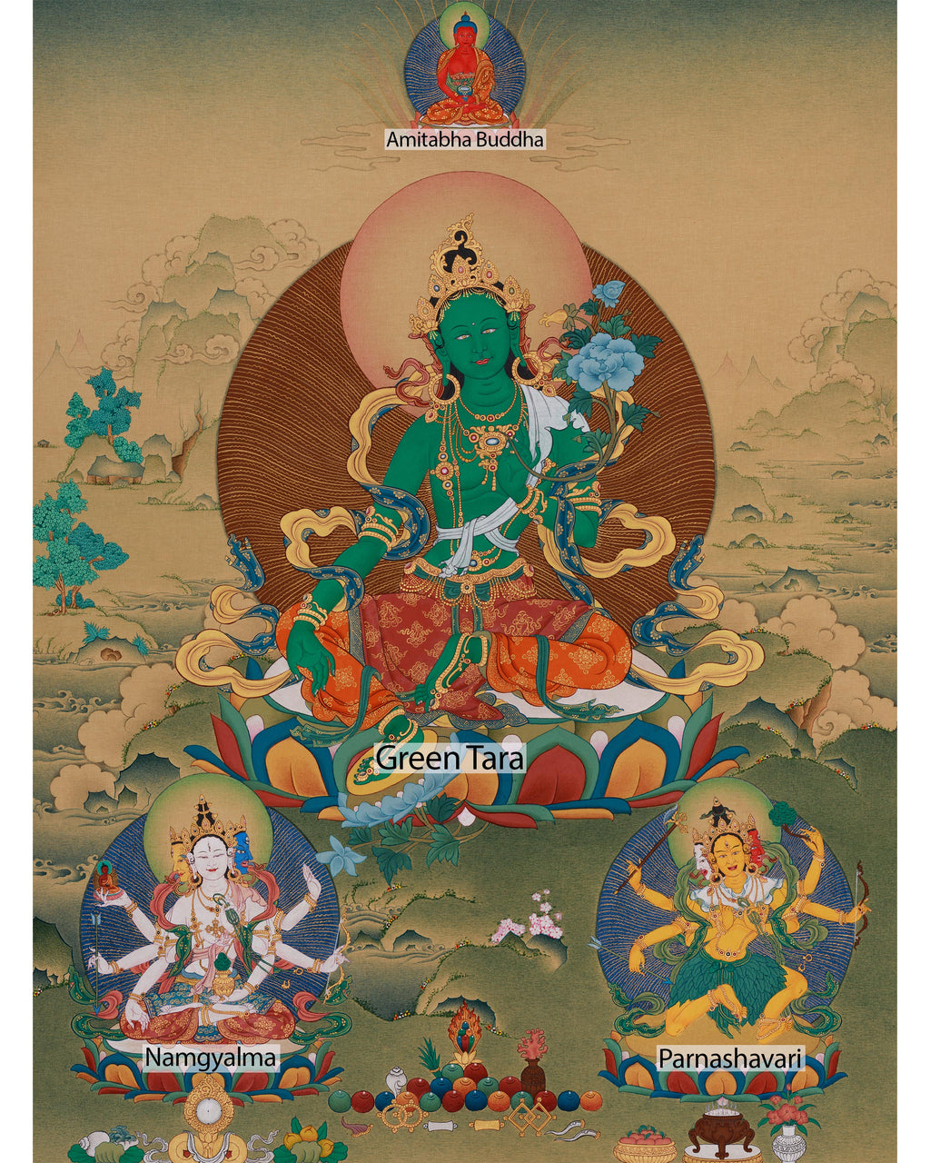 Together, these deities form a powerful spiritual mandala of protection, healing, and compassion. Green Tara offers swift aid, Amitabha grants peace and liberation, Namgyalma ensures longevity and spiritual cleansing, and Parnashavari shields against illness and unseen forces. Their presence in one thangka serves as a spiritual safeguard and reminder of enlightened beings' support.