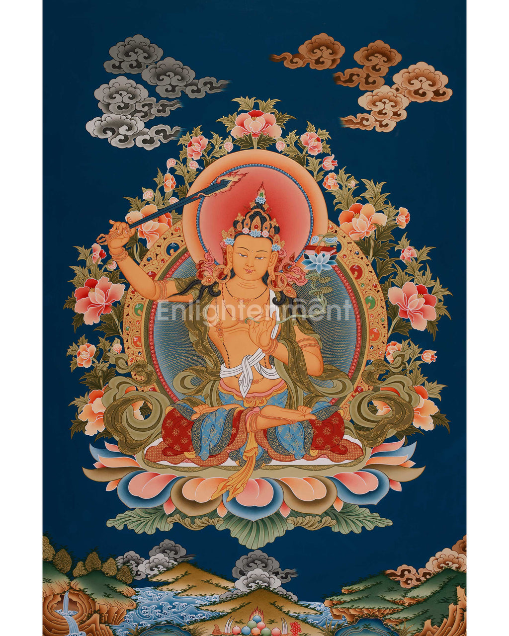 The Bodhisattva Manjushree Thangka vividly illustrates one of the most esteemed Bodhisattvas in Mahayana Buddhism, representing wisdom, insight, and enlightenment. Manjushree, the personification of wisdom, is depicted sitting peacefully on a luminous lotus throne. He wields a sword to sever ignorance in his right hand, while his left hand holds a scroll, symbolizing the extensive knowledge he conveys. Surrounding Manjushree are blooming lotus flowers, which signify purity and enlightenment.
