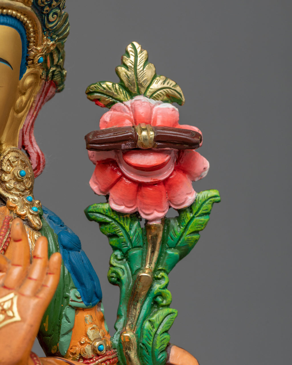 This Bodhisattva Manjushri Art Statue was traditionally crafted by the most skilled craftsmen of Nepal with flawless design. The qualities and significance of the ultimate deity were highlighted in this hand-crafted statue, which was made with a body of copper and was gilded with real 24k gold. The deity is depicted holding the book of knowledge above a blossoming lotus with his left hand, and the sword of knowledge is held above his head with his right hand. The utilization of acrylic painting emphasizes the statue further, giving it a captivating appearance. This figure may be used for various Buddhist rituals and meditation exercises, making it the ideal present for a practitioner like you.