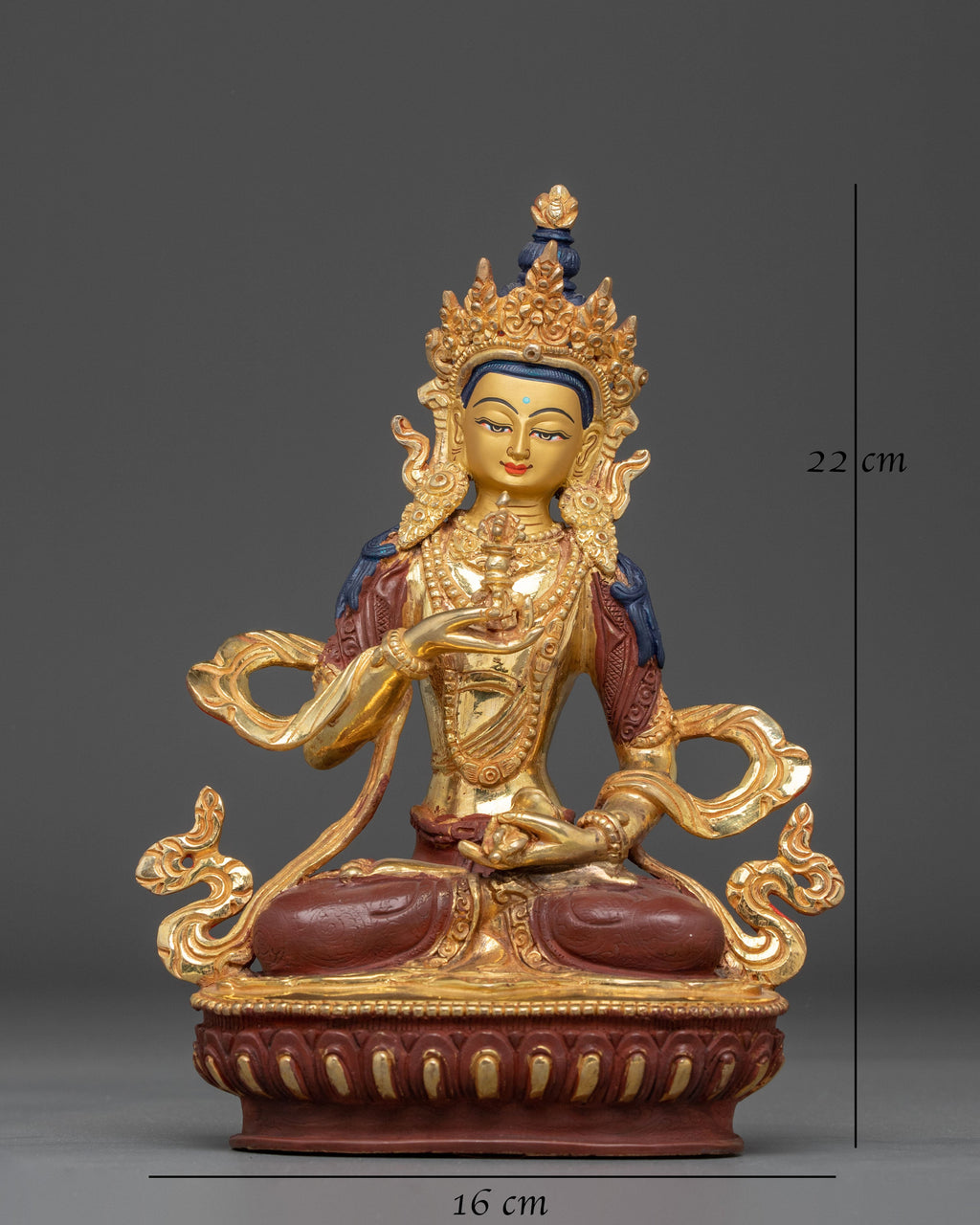The Bodhisattva of Purification Vajrasattva, is a revered deity in Tibetan Buddhism, known for his transformative ability to cleanse negative energy and remove obstacles. This gold-plated copper statue depicts Vajrasattva, the Buddha of Purification, whose chant is said to cleanse the mind, body, and soul. Standing 22cm tall, 16cm wide, and weighing 1.29kg, this statue is a strong addition to any meditation room or Buddhist shrine, offering heavenly purification and protection to its surroundings.
