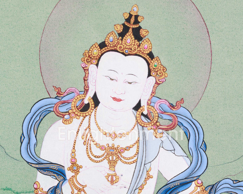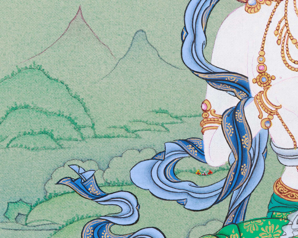 A Bodhisattva Vajrasattva artwork is meticulously hand-painted on cotton canvas utilizing vibrant acrylic colors and accented with 24K gold. The durable cotton provides a soft and smooth surface that elegantly showcases intricate details. The vivid colors animate Vajrasattva’s form, emphasizing his energetic presence. At the same time, the use of gold highlights key elements such as his crown, jewelry, and aura, giving off a gentle, spiritual shine. Gold symbolizes sanctity and highlights the traditional Karma Gadri style, known for elegance, refined proportions, and balanced harmony.