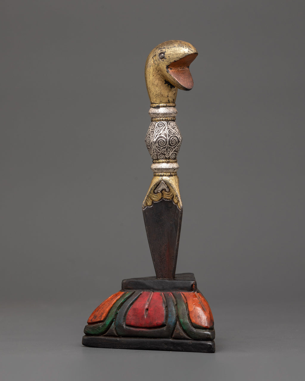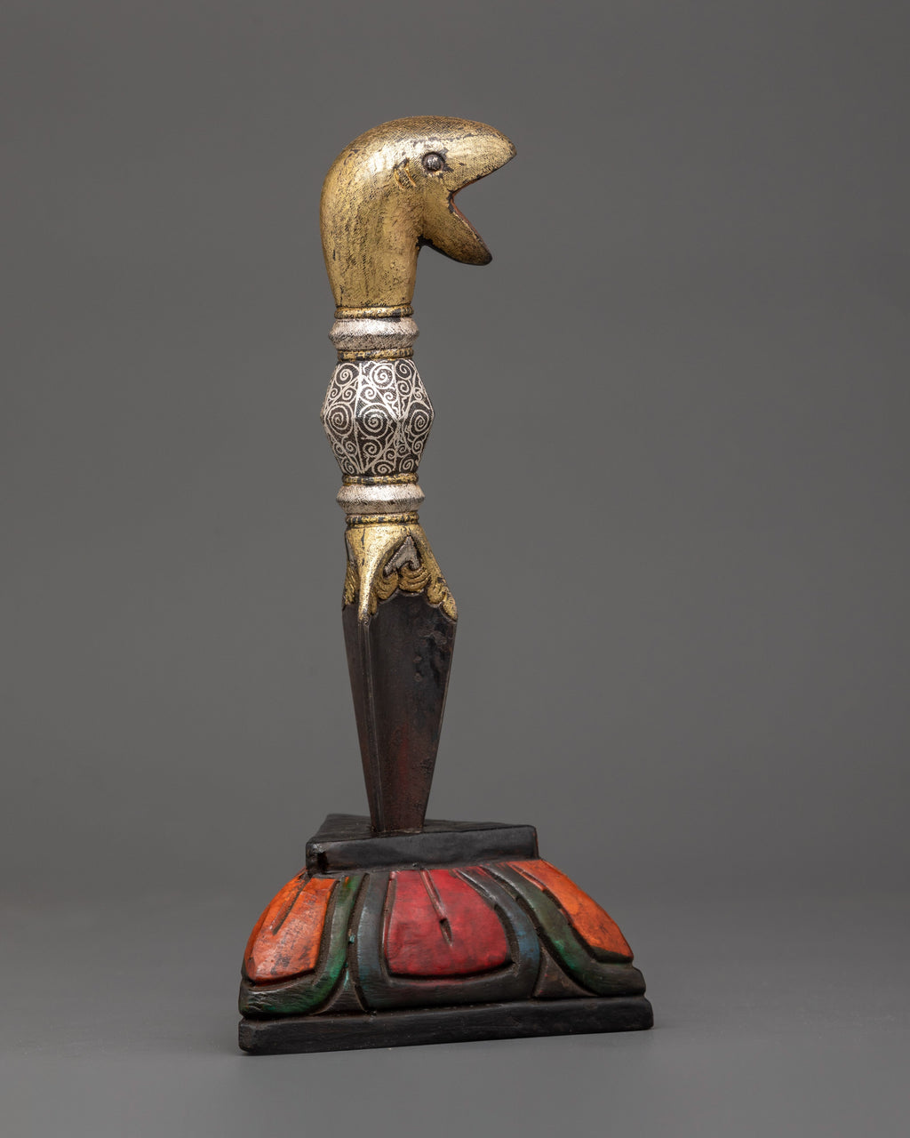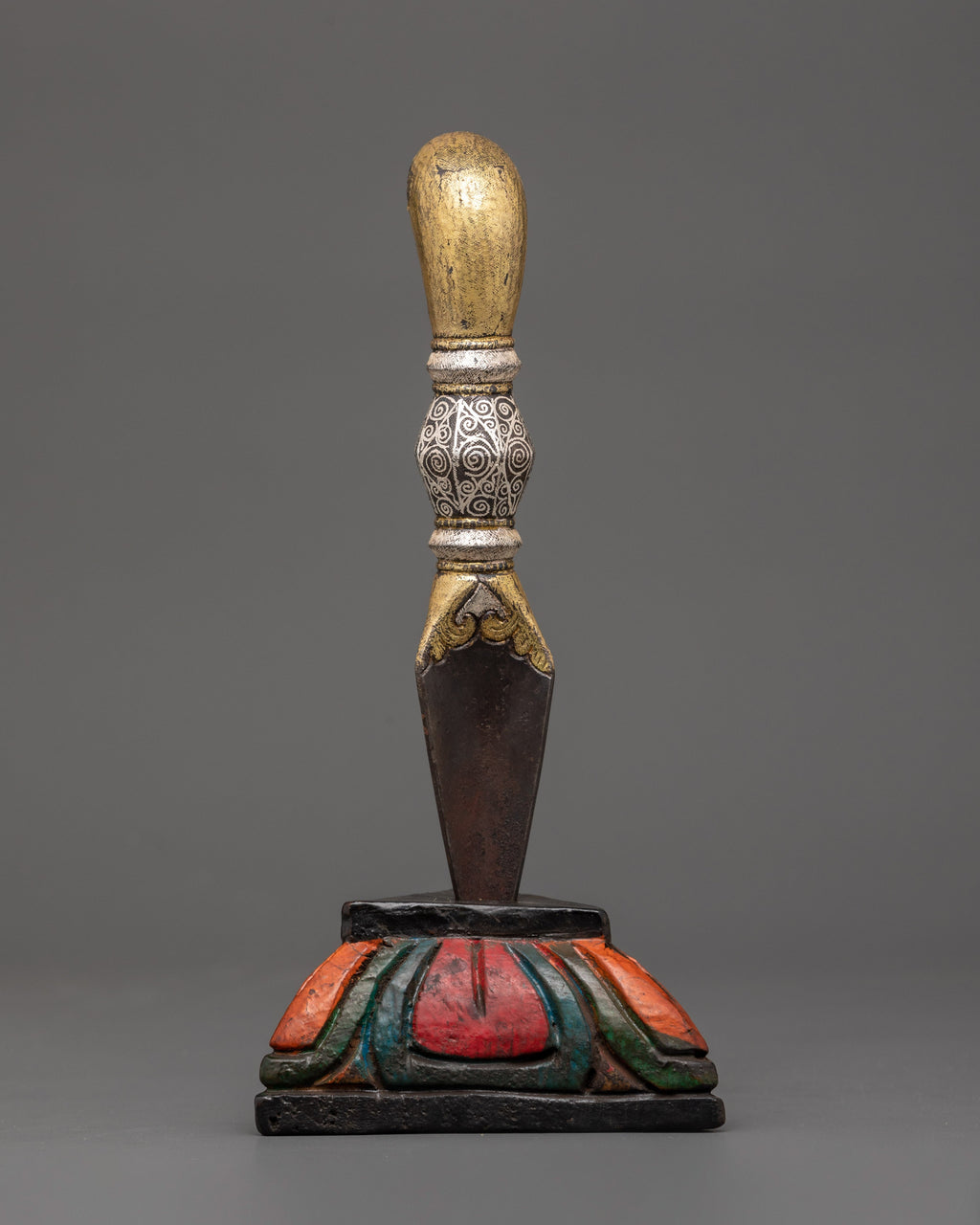 This Phurba is meticulously crafted, with inlays of iron, copper, silver, and brass, each having its symbolic resonance—iron for strength, copper for balance, silver for purity, and brass for heavenly connection. The triple-sided blade depicts the transformation of the three poisons—ignorance, desire, and hatred—to wisdom and compassion. Every detail is a tribute to expert Himalayan craftsmanship, combining beauty and force. Whether used for ritual or spiritual adornment, this Phurba adds a protecting element to any sacred area.