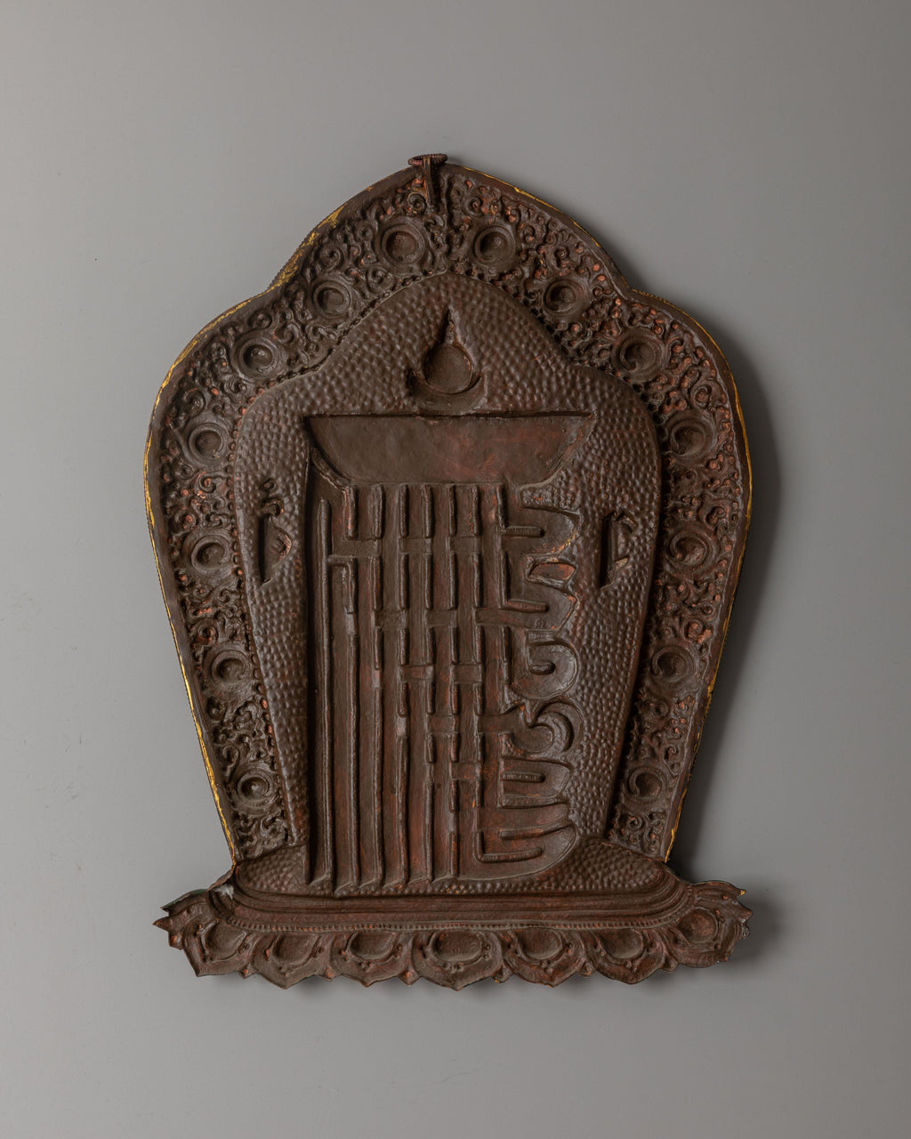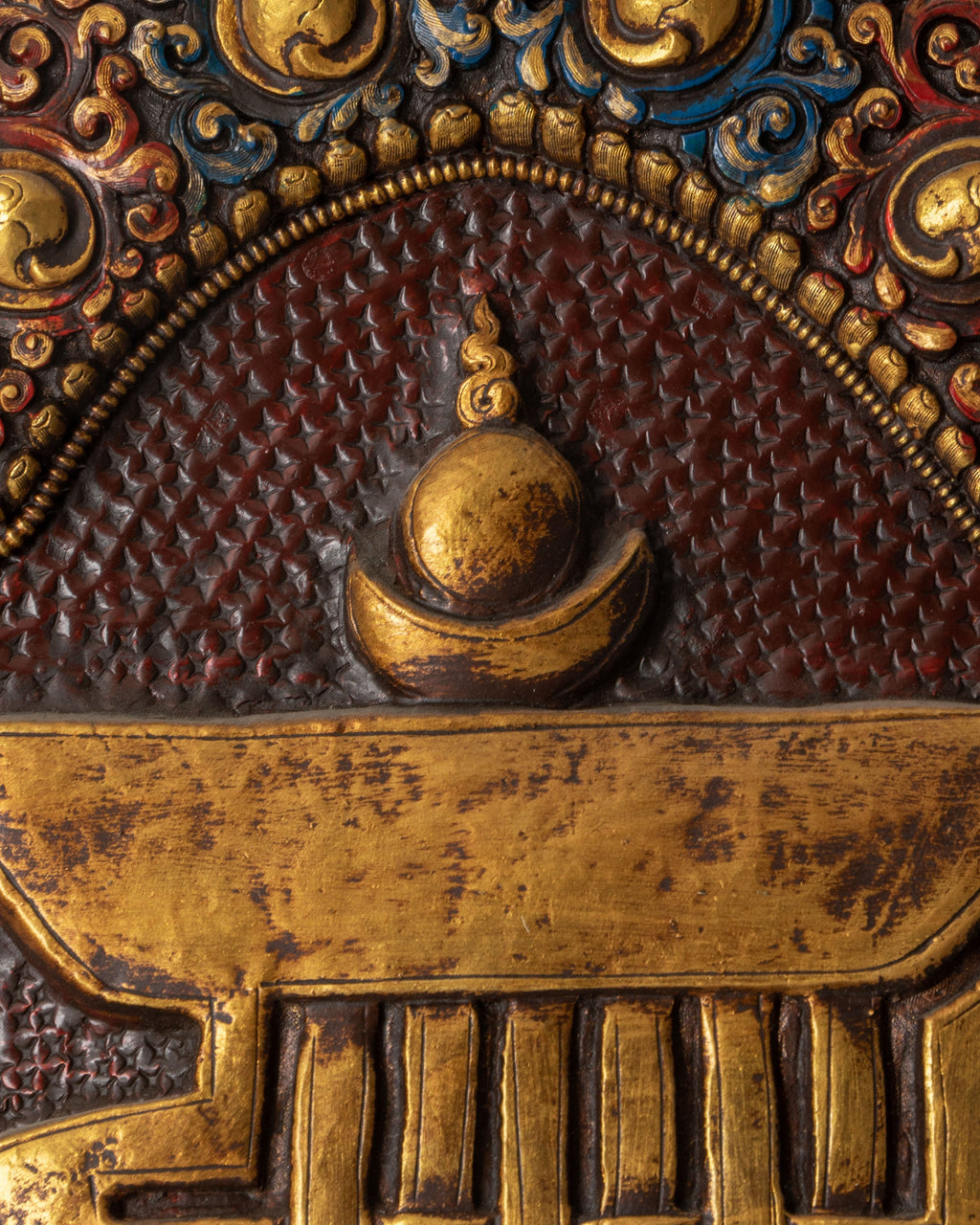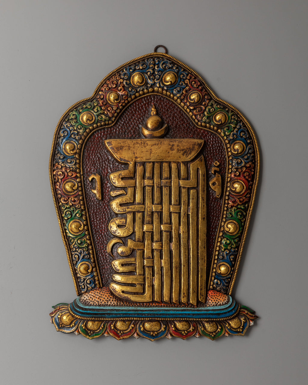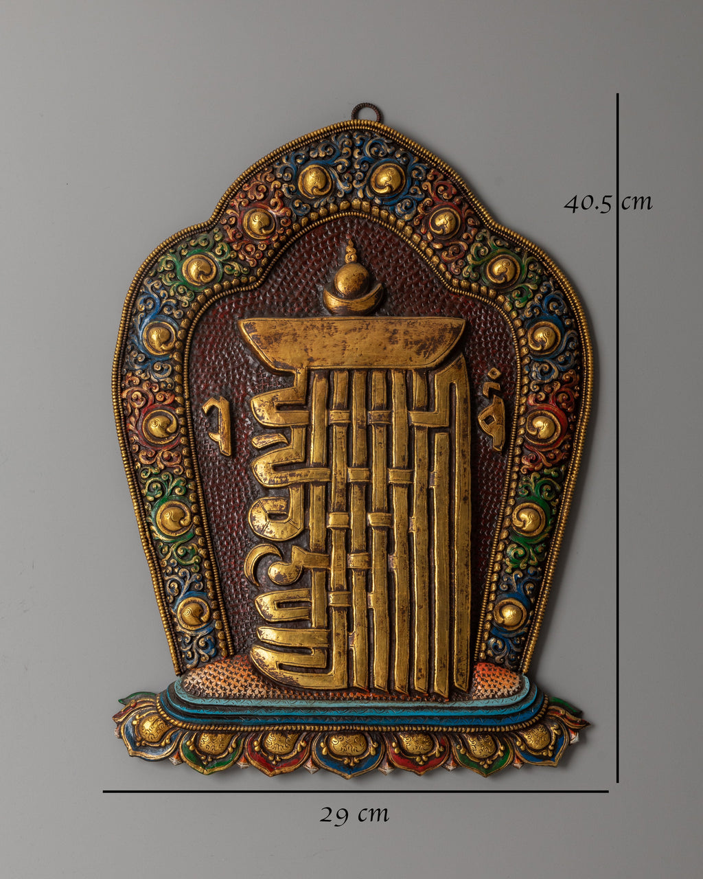 The Kala Chakra wall hanging's design is complete with symbolism and meaning. The core image, the brass Kala Chakra, is surrounded by a vibrant border of acrylic paints that reflect the balance of the elements. The precise detailing and use of brass, along with brilliant colors, capture the essence of Tibetan handicraft, combining artistic beauty with spiritual meaning. This wall hanging reminds Buddhists of the limitless nature of time, the significance of awareness, and the interconnectedness of all living species.
