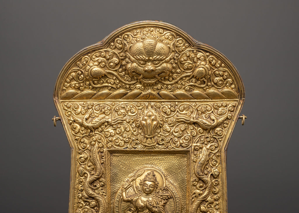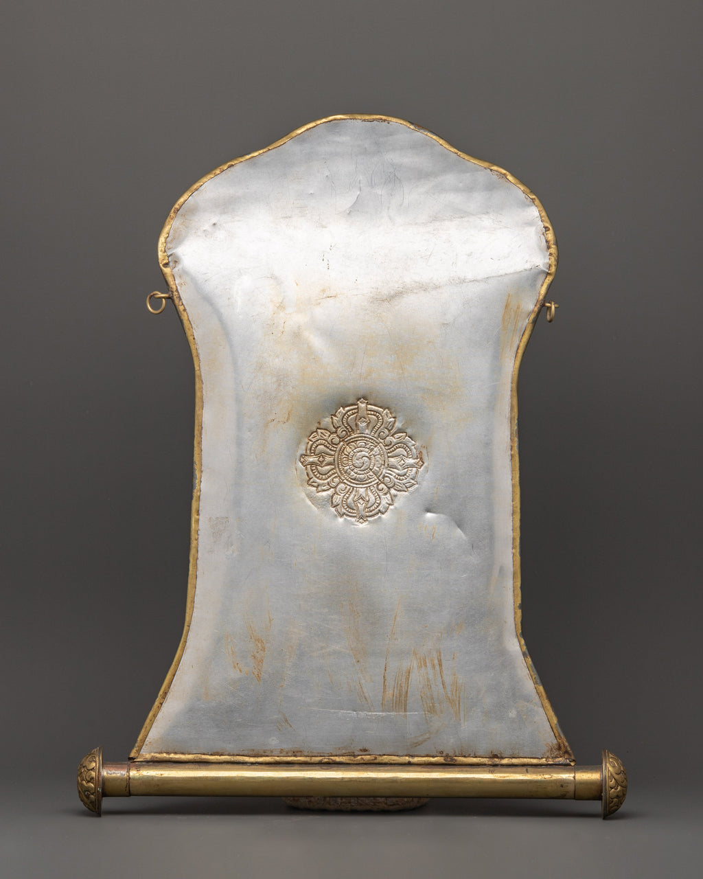 A metal thangka is a type of thangka painting that is made on a metal surface rather than on traditional canvas or paper. Metal thangkas are often made using copper, brass, or silver and are usually decorated with intricate designs and Buddhist iconography using a repoussé technique. This involves hammering the metal from the reverse side to create a raised relief image on the front. Metal thangkas are known for their durability and are often used in ritual contexts or as decorative pieces in Buddhist homes and temples. They are particularly common in Tibet, where they have been produced for centuries.
