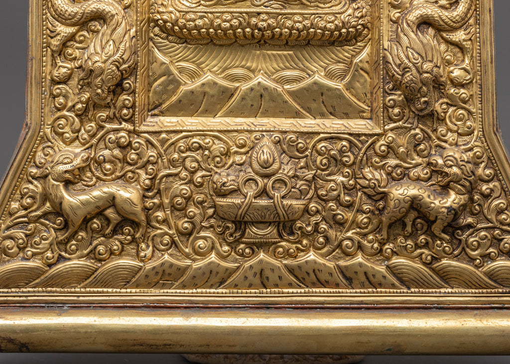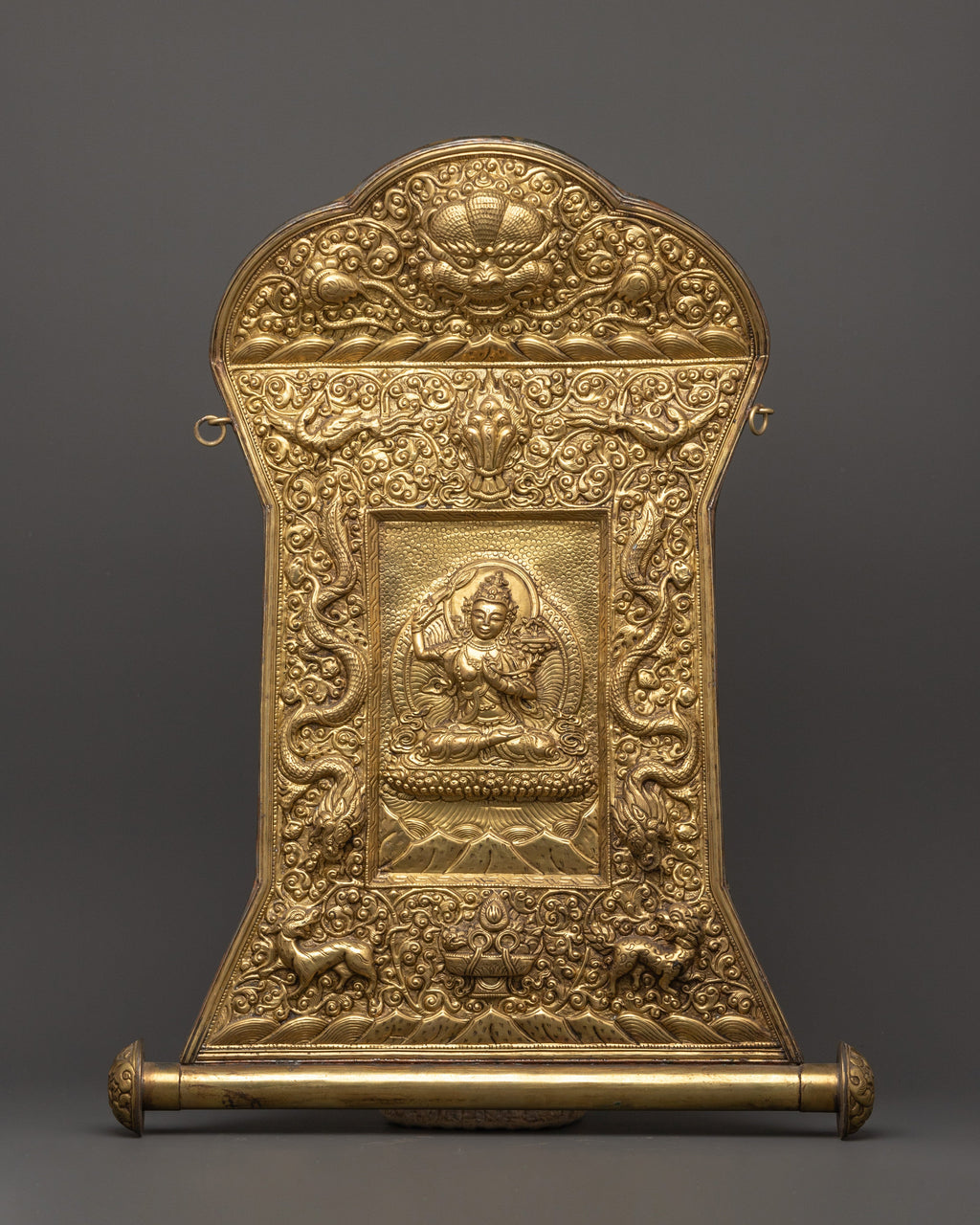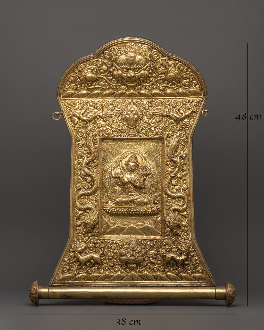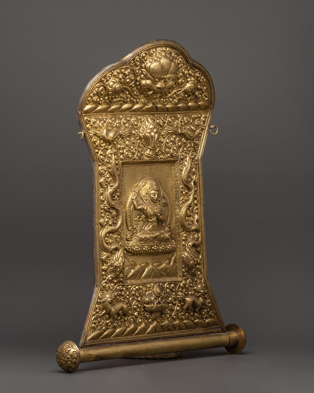 This Brass Metal Thangka includes a wonderfully crafted Manjushri figurine, representing knowledge and enlightenment in Tibetan Buddhism. This Tibetan Buddhist Thangka, measuring 48 cm in height and 38 cm in breadth, is ideal for any area and exudes calm and wisdom. The hand-carved design emphasizes the Majushri's delicate features, while the beautiful brass finish gives the artwork elegance and a golden touch. This Manjushri thangka is beautiful and spiritually significant, whether used for meditation or to decorate a Buddhist altar.