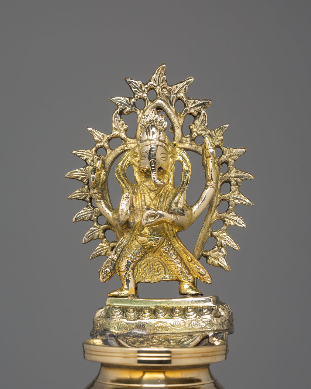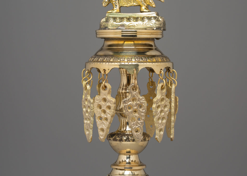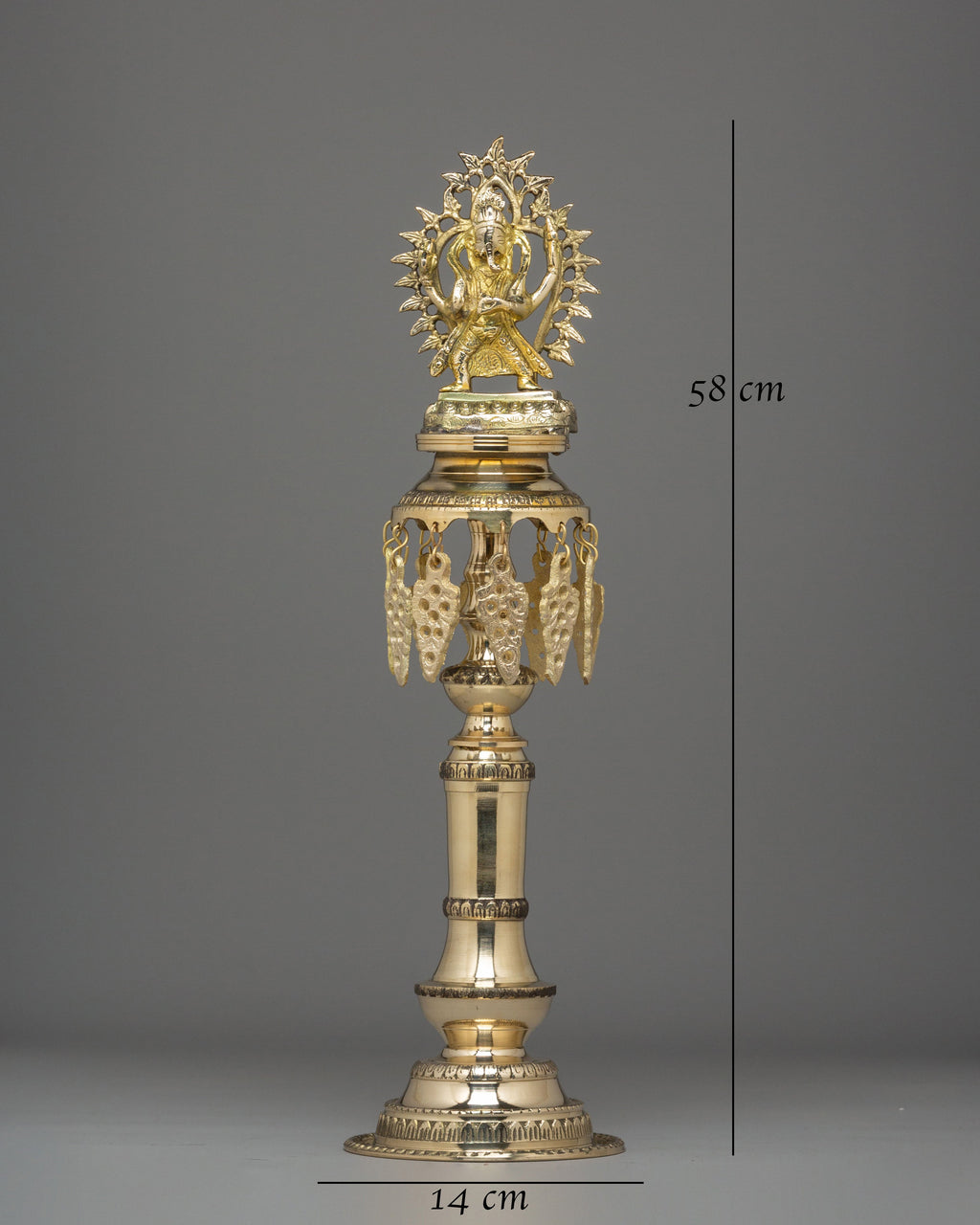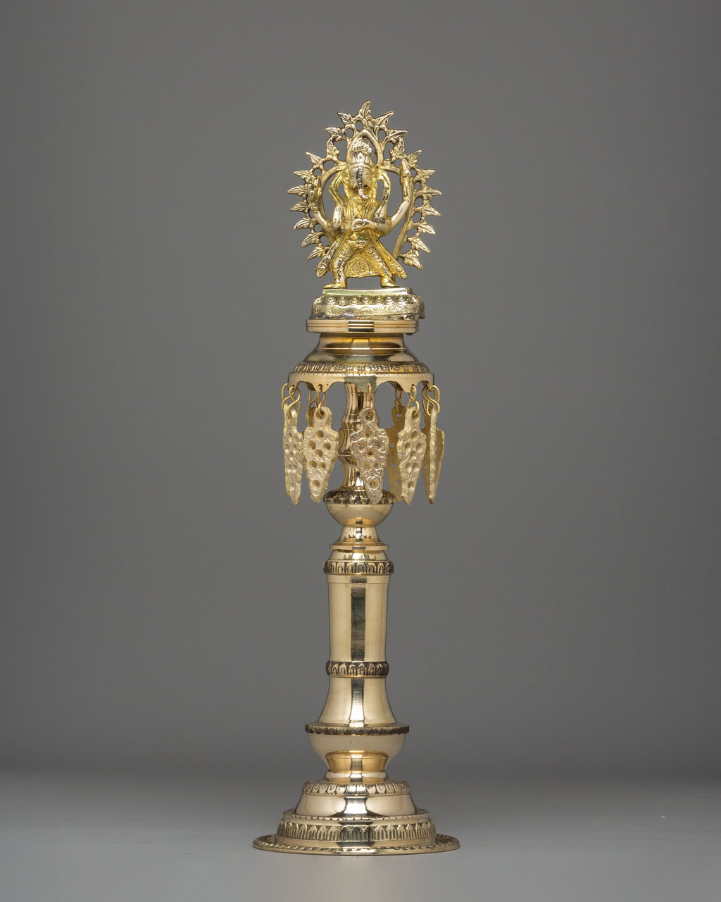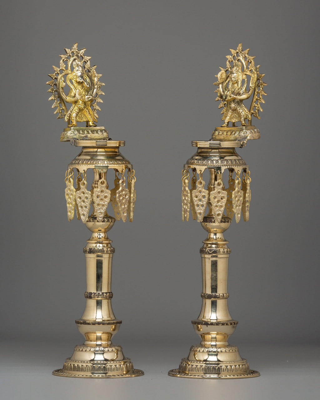 The design showcases exceptional craftsmanship, featuring intricate carvings along the bases, column sections, and the ceremonial crown that supports the deity. The figures, sculpted with expressive detail and traditional attire, represent prosperity, blessings, and the sacred power of illuminated worship. The dangling leaf ornaments echo traditional temple décor, symbolizing spiritual awakening and the flow of positive energy. These lamps are shaped with refined symmetry, giving them a graceful stance that enhances both home altars and religious gatherings.