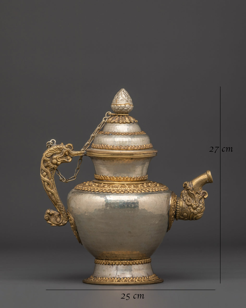 A stunning example of Himalayan craftsmanship, this brass teapot blends beauty with sacred symbolism. Standing 27 cm tall and 25 cm wide and weighing 0.99 kg, it is handcrafted from white copper with elegant brass accents throughout. The pot features a majestic motif handle and spout, which are finely sculpted and symbolically protective, with a domed, lidded top connected by a traditional ceremonial chain.