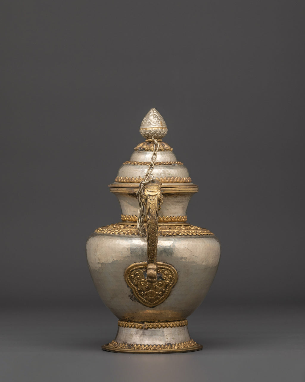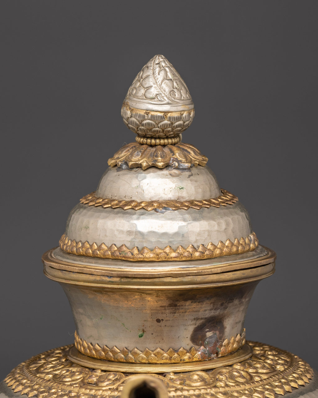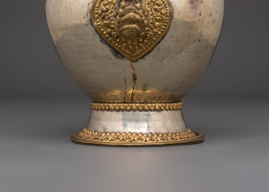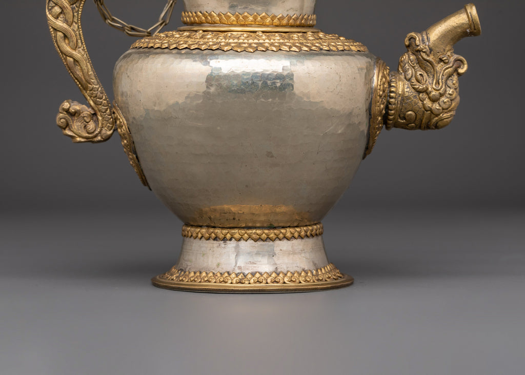 In Tibetan culture, teapots like this are used in butter tea rituals, monastery offerings, and household puja ceremonies. The use of white copper symbolizes clarity and healing, while brass signifies strength, prosperity, and sacred energy. The motif is a powerful guardian in Buddhist iconography, believed to ward off negative energy and attract abundance and prosperity. This piece is both functional and decorative, serving as a vessel for tea during spiritual gatherings or enhancing sacred spaces with its radiant presence.