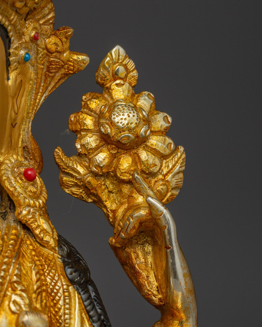 The deity sits on a moon-disc lotus seat. A crystal rosary in the upper right hand symbolizes the never-ending cycle of life, death, and regeneration. The lotus in the upper left hand represents the deity's role in assisting mankind to overcome adversity and unpleasant conditions, including hellish realms. The lower hands are gently put in a namaste motion, grasping a wish-fulfilling Jewel. The deity's gentle and calm expression symbolizes compassion and calmness.