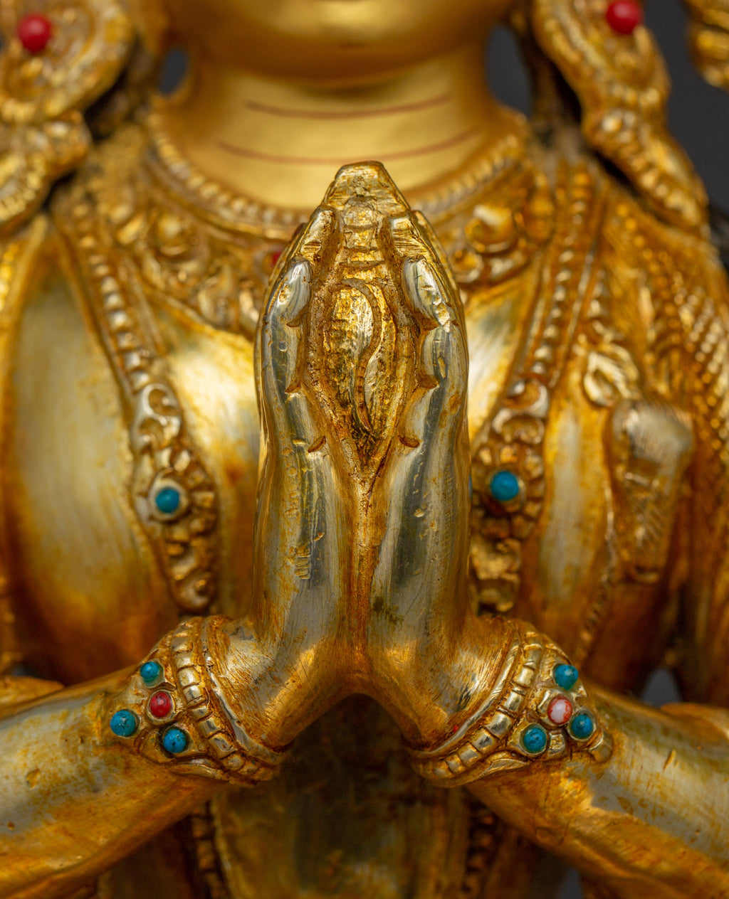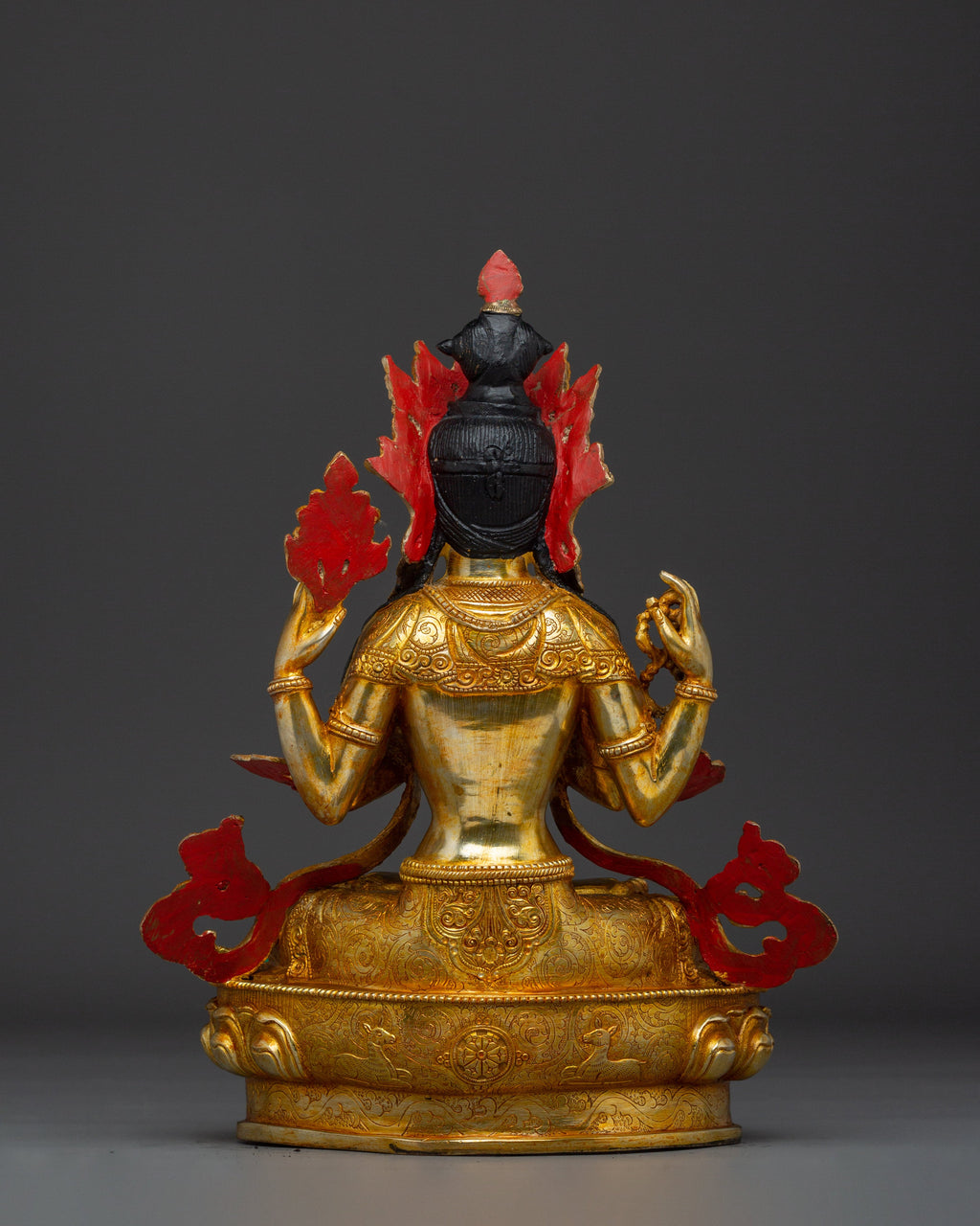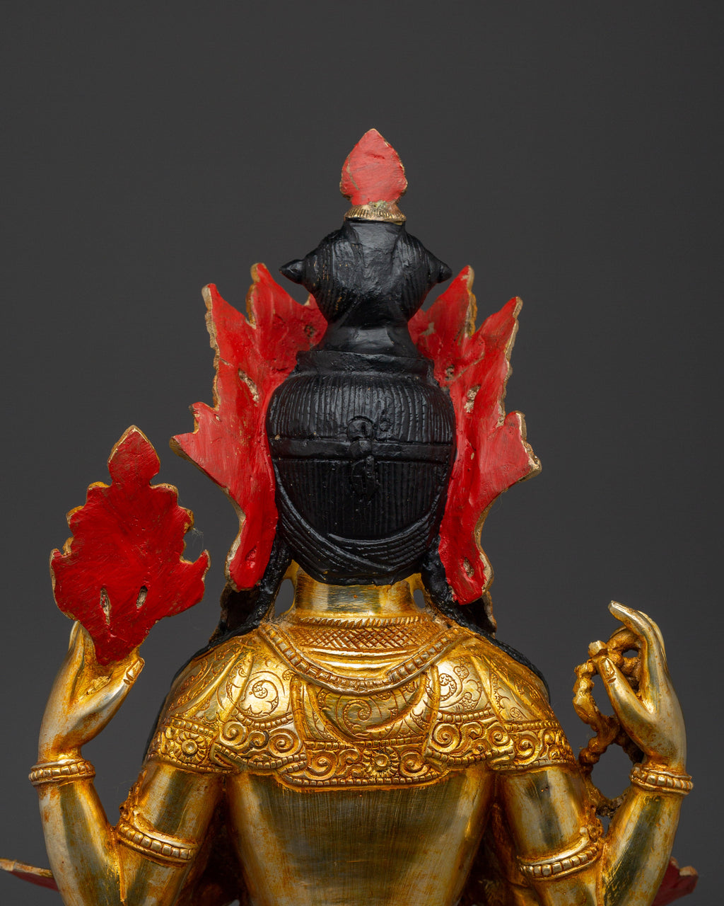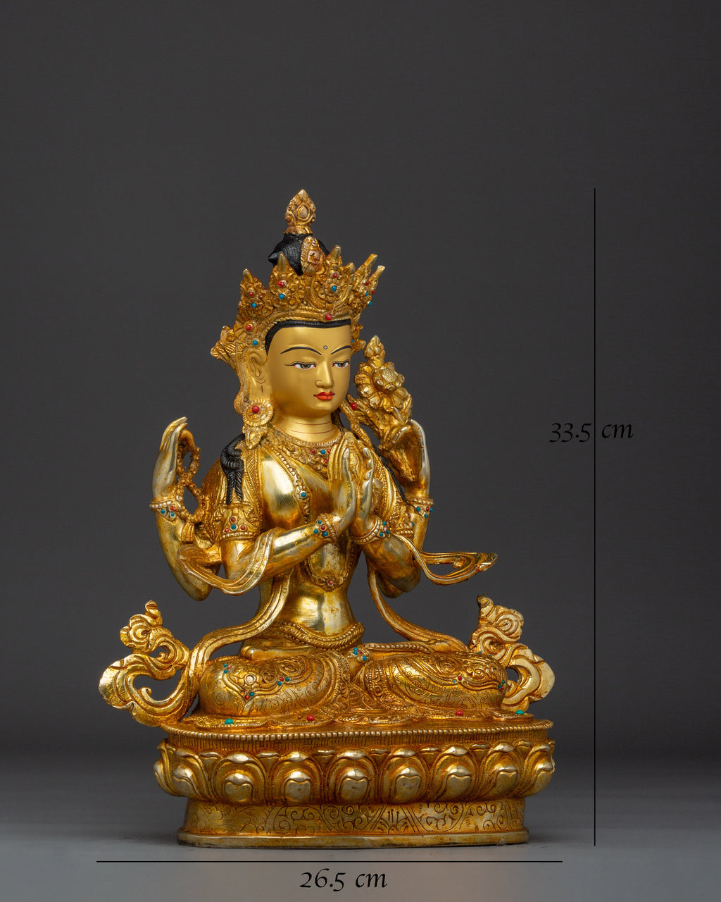 This Buddha Artwork of Chenrezig, known as the embodiment of boundless compassion, represents boundless love, peace, and the desire to alleviate the suffering of all beings. This handcrafted statue is 13.2" (Height) x 10.4" (Base) and weighs 4.4 kg. It is made of copper, adorned with 24K gold gilding, and enhanced with detailed gold and acrylic paints. This sculpture, created by expert Nepalese artisans, symbolizes the spiritual traditions of Himalayan Buddhism and makes a meaningful addition to altars, meditation places, or sacred collections.