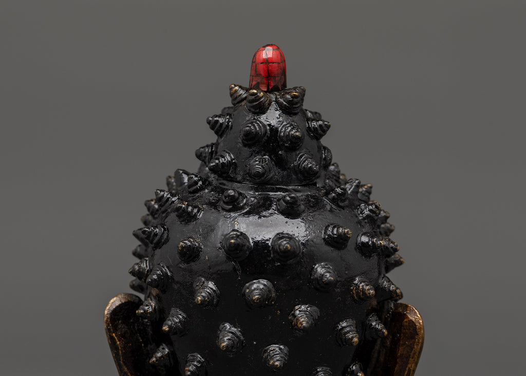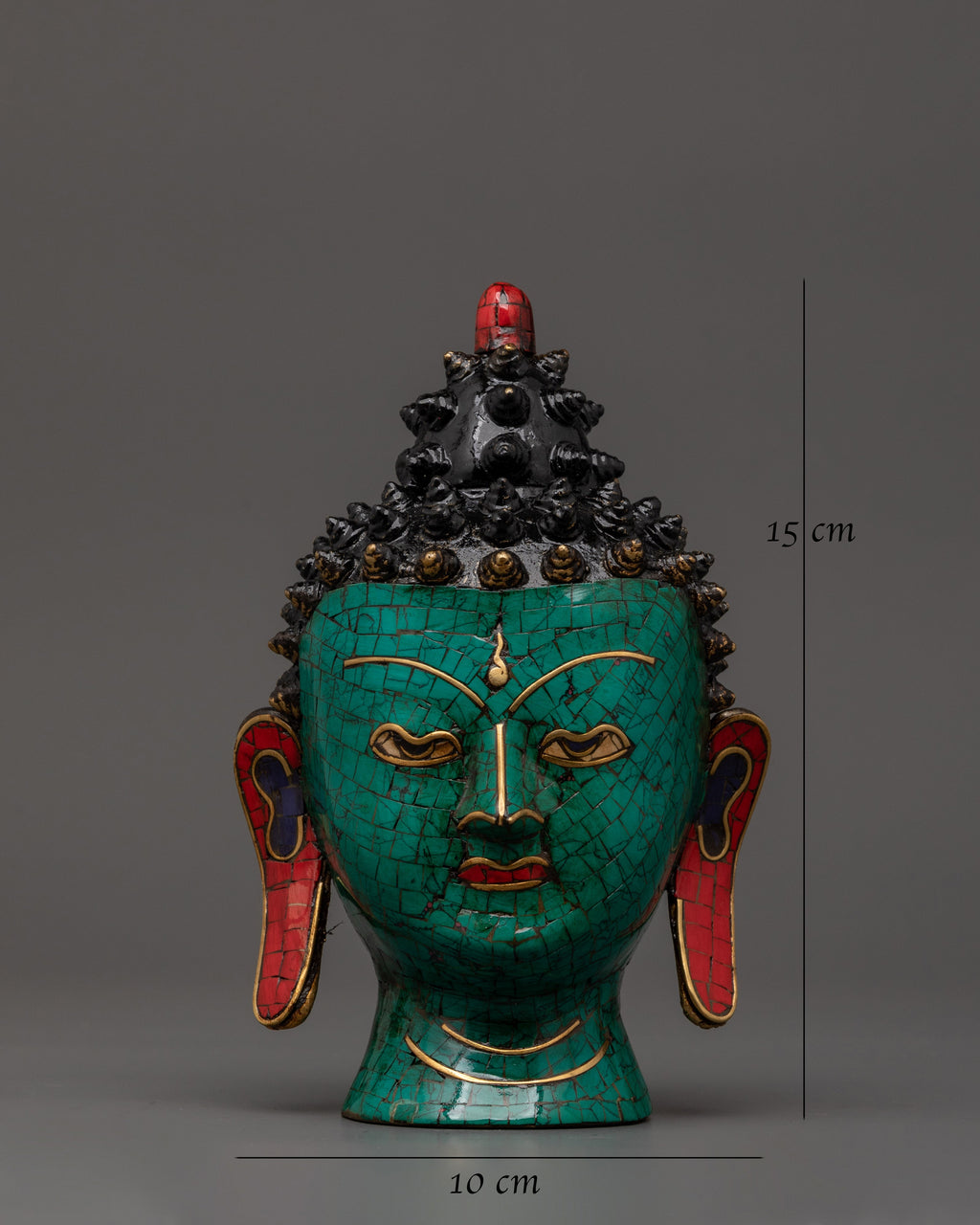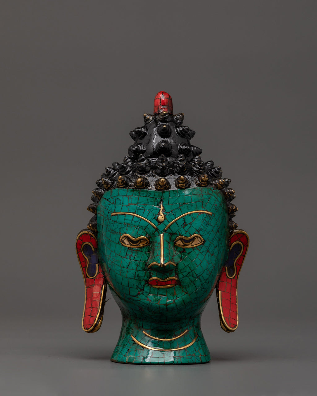 This item, which weighs 0.58 kg and is expertly created from brass with bright turquoise and coral inlays, embodies the harmony of spiritual meaning and traditional artistry. The coral provides vitality and protection, while the turquoise promotes balance and healing. This Buddha head symbolizes peace and enlightened awareness and can be used as spiritual décor or a thoughtful present.