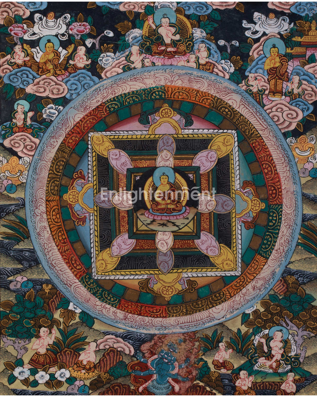 The Buddha Mandala is a representation of the cosmos and the path to enlightenment. It helps practitioners focus and achieve deeper realms of awareness during meditation through its complex circular patterns and geometric alignment. As a visual aid for mindfulness, this Thangka encourages balance, harmony, and clarity in one's spiritual path.