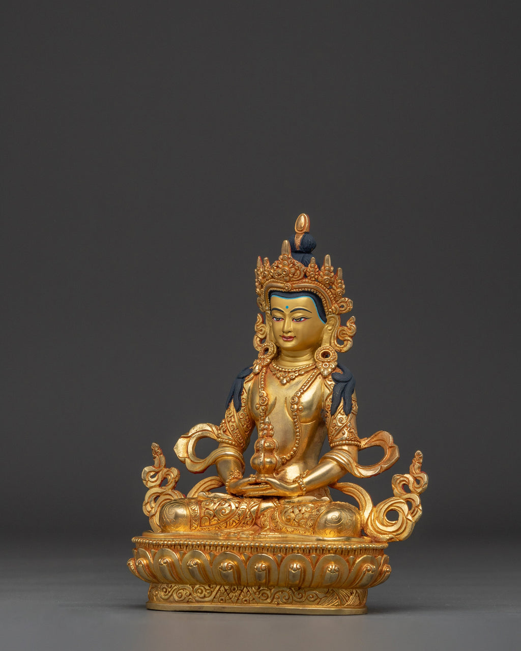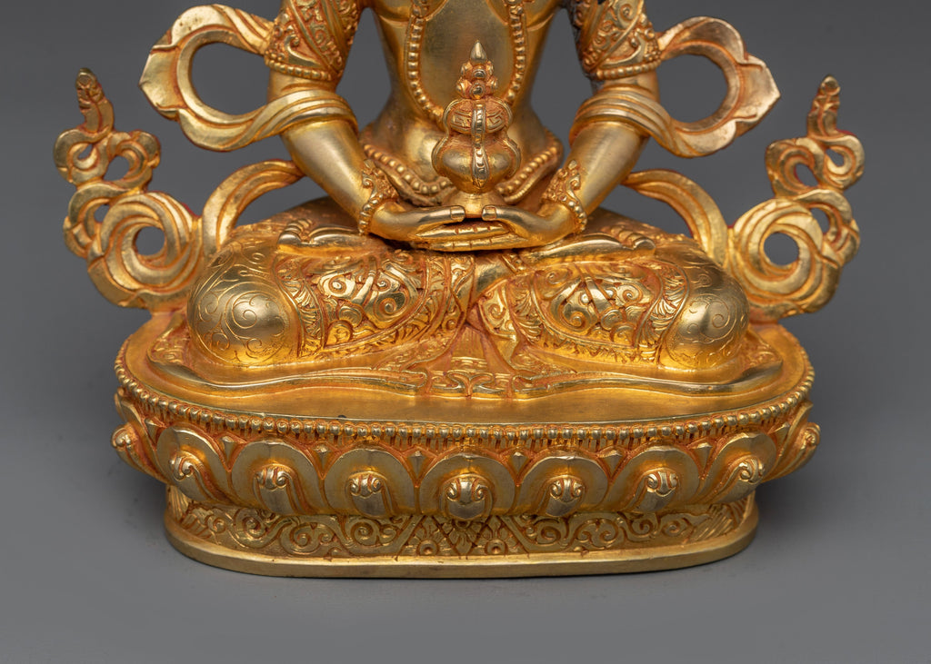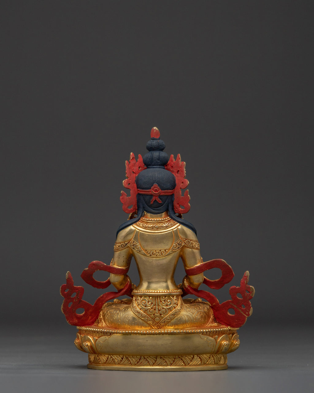 Amitayus is represented sitting in a meditative posture, indicating his vast wisdom and unwavering concentration. His hands are in dhyana mudra, holding a kalasha, a holy vase filled with the nectar of immortality representing his function as the giver of long life and energy. His calm demeanor radiates compassion and inner peace, Inspiring practitioners to practice mindfulness and tranquility.