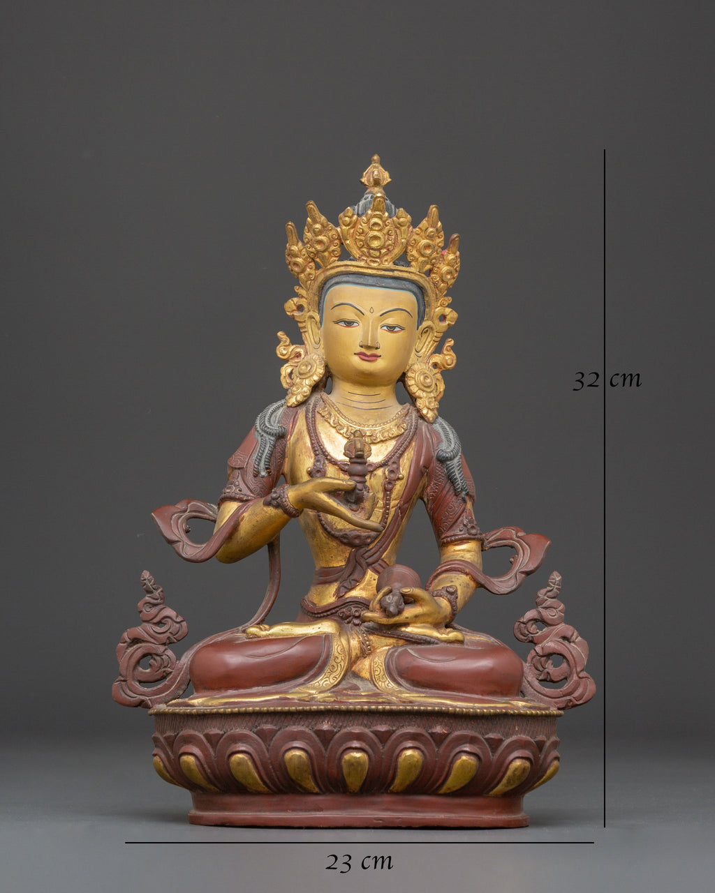 Invite clarity, spiritual cleansing, and profound transformation into your sacred space with the Buddha of Purification Vajrasattva Sculpture. This stunning representation of Tibetan Buddhist artistry stands 32 cm tall and 23 cm wide, weighing 3.67 kg, and is crafted meticulously from copper with a gold-plated finish that highlights its intricate details. Designed for meditation rooms, temple shrines, or prayer altars, this statue is more than just a decorative piece; it embodies the purification of negative karma and serves as a powerful symbol of peace, wisdom, and enlightenment. Bring the essence of spiritual renewal and elevate your practice with this exceptional work of sacred art.