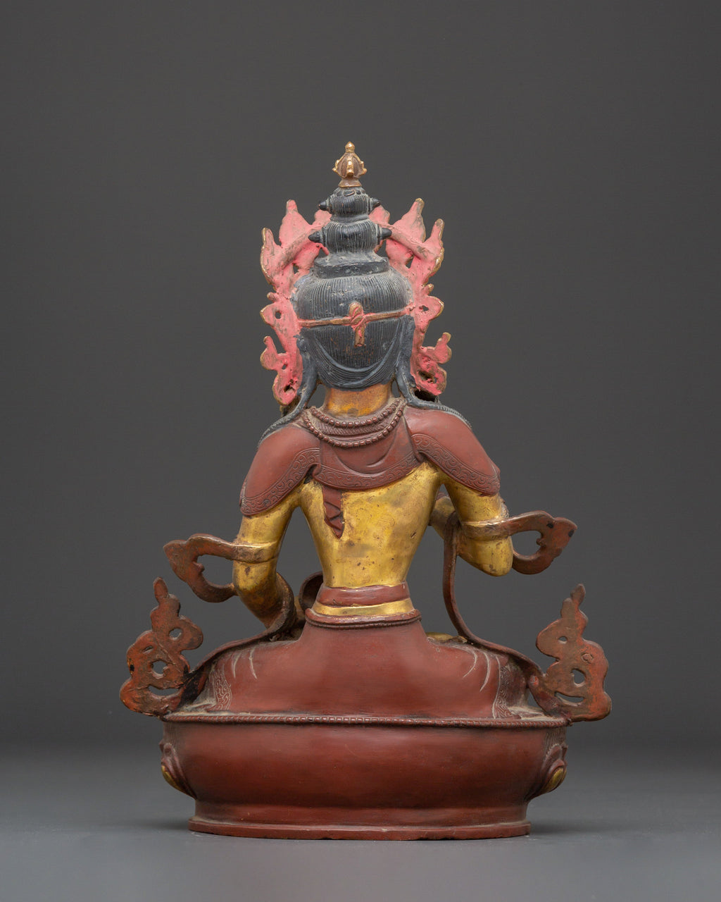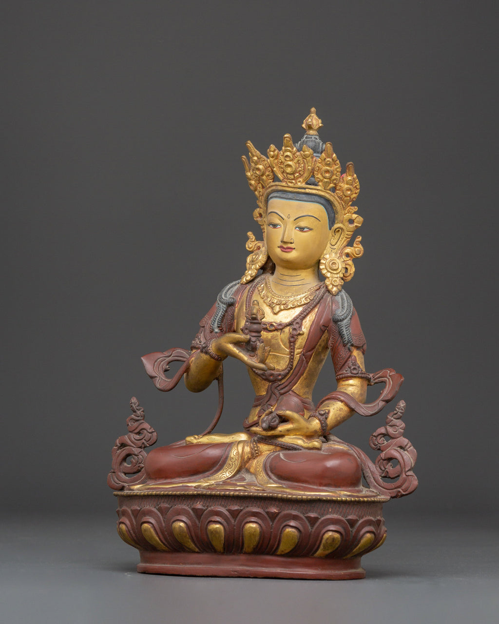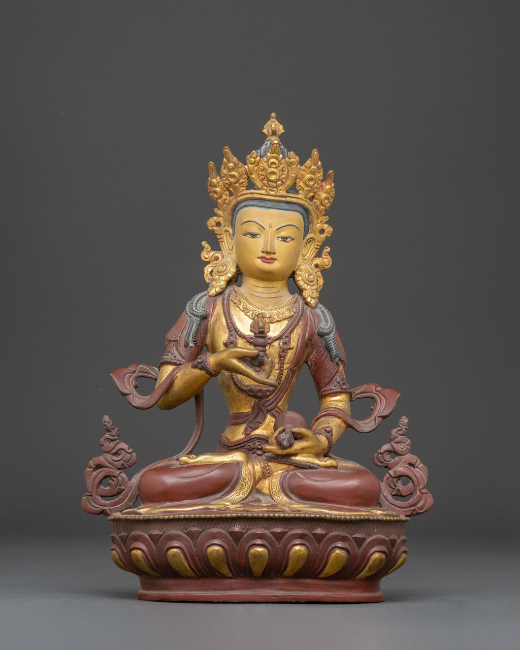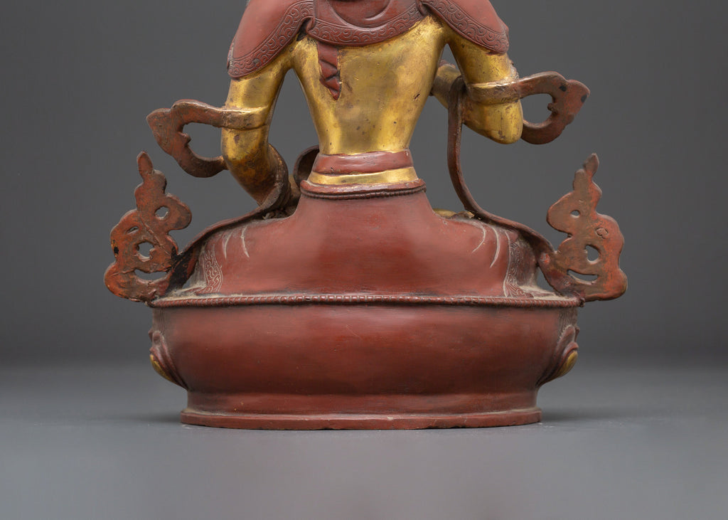 The intricate detailing of Vajrasattva’s crown, robes, and ornaments reflects centuries of traditional Tibetan craftsmanship, showcasing the skill and dedication of artisans who meticulously carved and finished this remarkable sculpture. The balanced fusion of copper and gleaming gold accents not only highlights the statue’s exquisite artistry but also enhances its sacred presence. This statue serves as both a profound spiritual object of devotion and an impressive work of art, making it an ideal centerpiece for meditation spaces or ritual environments. For practitioners seeking to deepen their meditation, cultivate inner peace, or elevate their sacred spaces, this Buddha of Purification, Vajrasattva, embodies purification, wisdom, and enlightenment to inspire and guide your spiritual journey.
