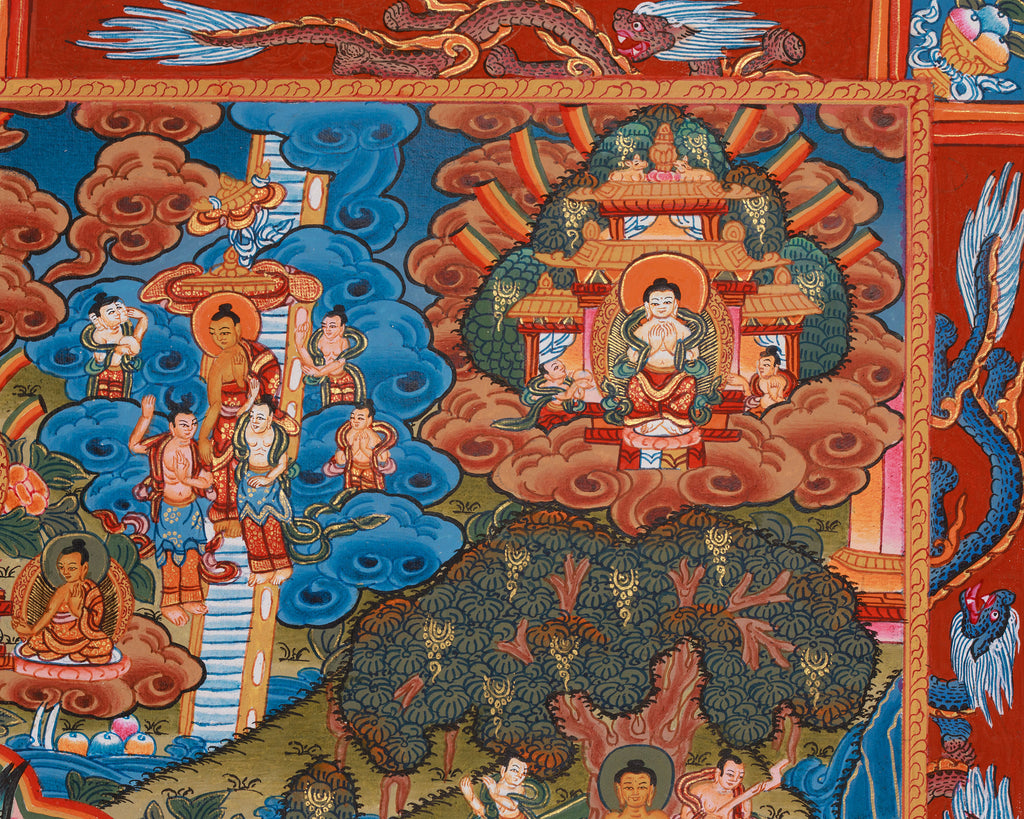 The Thangka's outer regions show a number of remarkable events, including the Buddha's teachings, his control over wild animals, and his acts of kindness to believers and heavenly beings. These scenes describe how the Buddha guided human beings on the path to freedom and propagated the Dharma. The presence of ordinary followers, monks, and deities highlights how widespread his teachings are. The scenery, which includes rivers, mountains, temples, and trees, provides a background against which the story is connected.