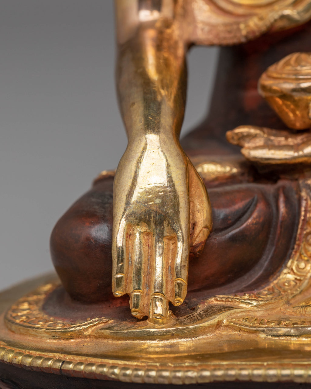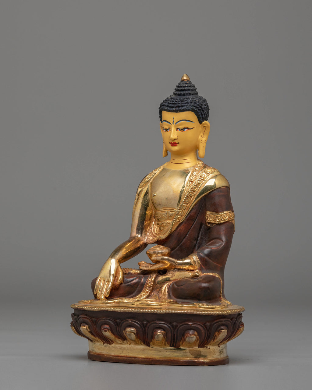 The design of the Buddha Shakyamuni statue captures the essence of Shakyamuni Buddha’s life and spiritual significance. The 24K gold plating symbolizes the sacred nature of his teachings, while the acrylic colors highlight intricate details such as the folds of his robes, the gentle smile on his face, and the wisdom embodied in his hands. Shakyamuni Buddha is shown in a peaceful seated meditation posture, symbolizing deep inner peace, mindfulness, and the path to enlightenment. This statue reflects the profound teachings of the Buddha on the impermanence of life and the importance of cultivating compassion and wisdom.