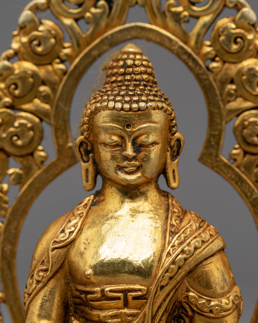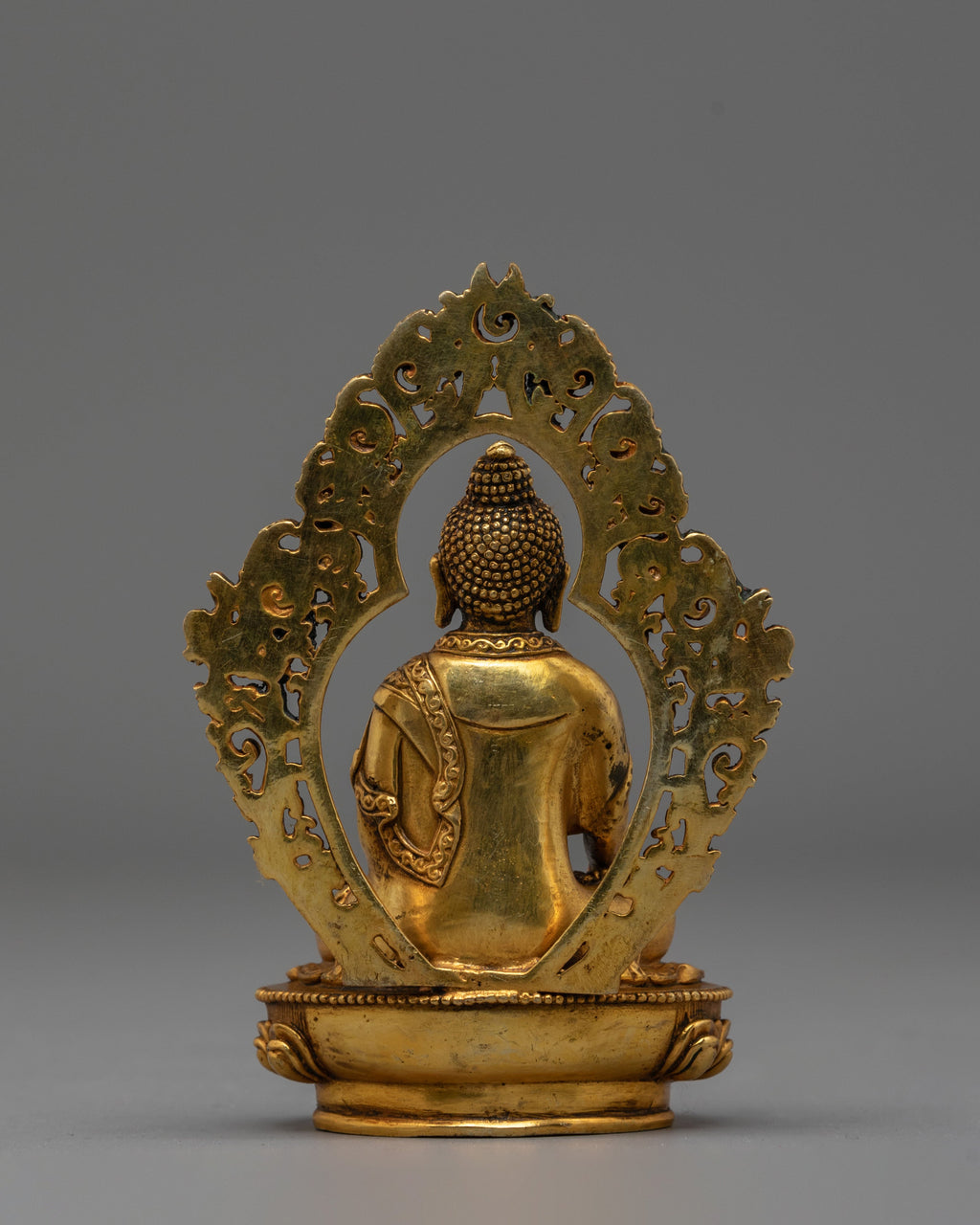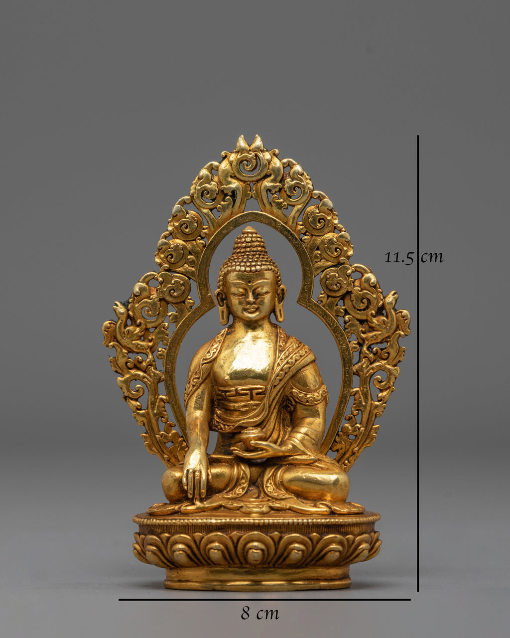This Buddha Shakyamuni Handmade Statue captures the Buddha's peaceful essence and profound wisdom. Standing at 11.5 cm tall and 8. cm wide, this statue is thoughtfully designed to radiate a calm, serene presence. Expertly handcrafted from a gold-plated copper body, it exudes an elegant and spiritual aura. The seated Buddha, with its gentle and composed posture, invites tranquility and reflection, making it a beautiful addition to any space. The fine detailing of the robe and the Buddha’s serene expression evoke a sense of inner peace, while the lotus pedestal symbolizes the journey to enlightenment.
