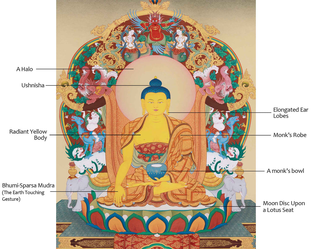Premium Thangka of Buddha Shakyamuni with Brahma and Indra | Seated on Mythical Lotus Throne with Two Disciples