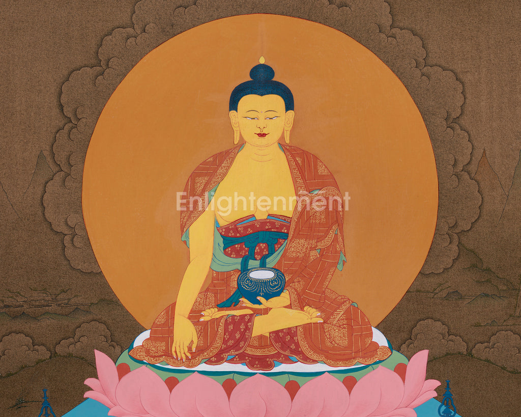 Experience the Buddha Shakyamuni with Disciples, meticulously hand-painted on cotton utilizing acrylic paints and 24K gold. Crafted in the esteemed Karma Gadri style, it features the serene Buddha alongside his disciples, rendered with intricate details, vivid colors, and luminous gold accents. This artwork is ideally suited for meditation chambers, shrines, or as a spiritual focal point, embodying wisdom, compassion, and the teachings of the Buddha.