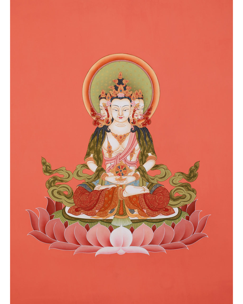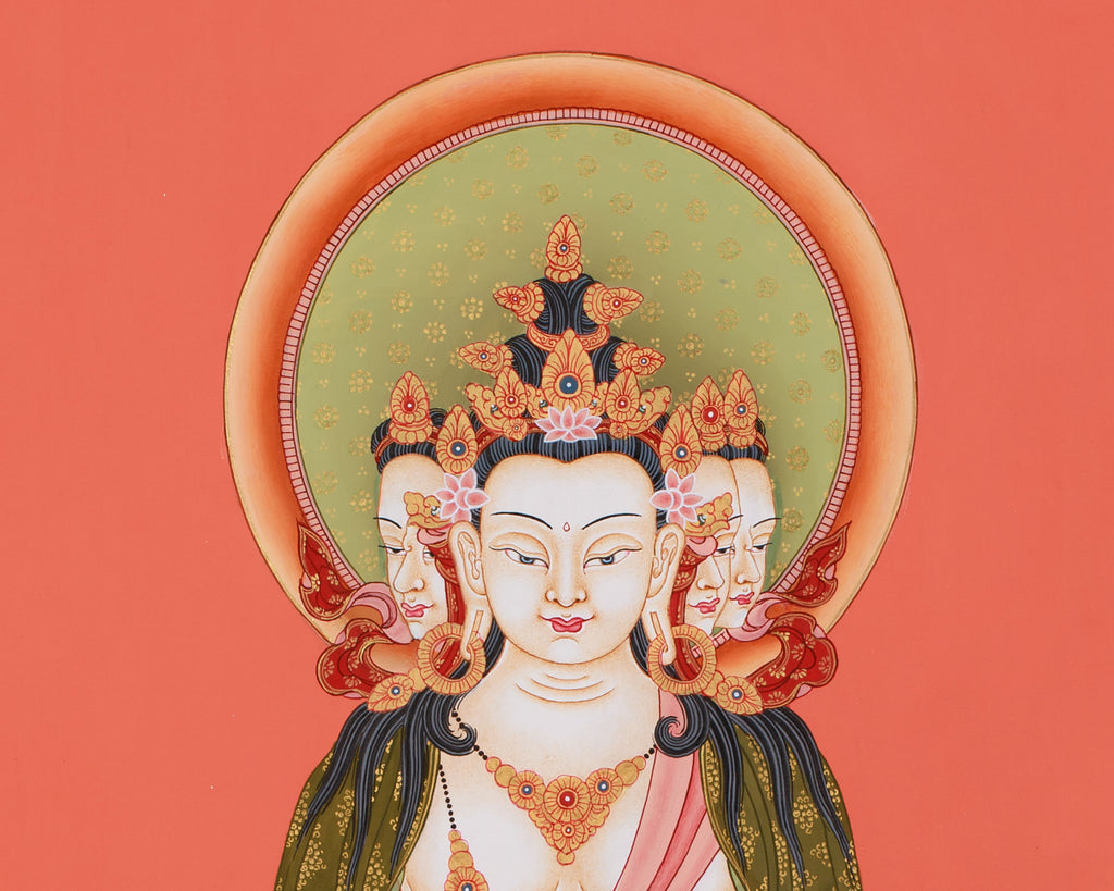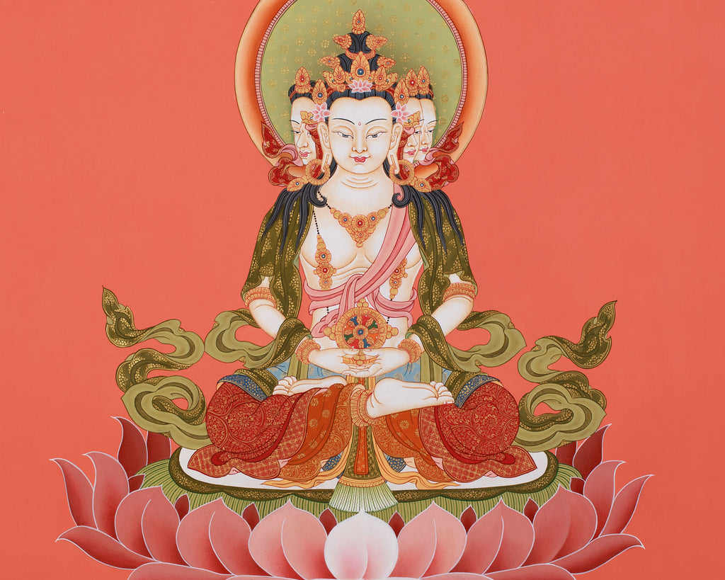 At the center of the work is Buddha Vairochana, the primordial Buddha from whom all others originate, representing universal wisdom. He is depicted with four serene faces, symbolizing his omnipresent awareness and compassion. Seated on a lotus throne, holding a dharma wheel, which embodies the turning of the Wheel of Dharma and the universal spread of enlightened teachings.