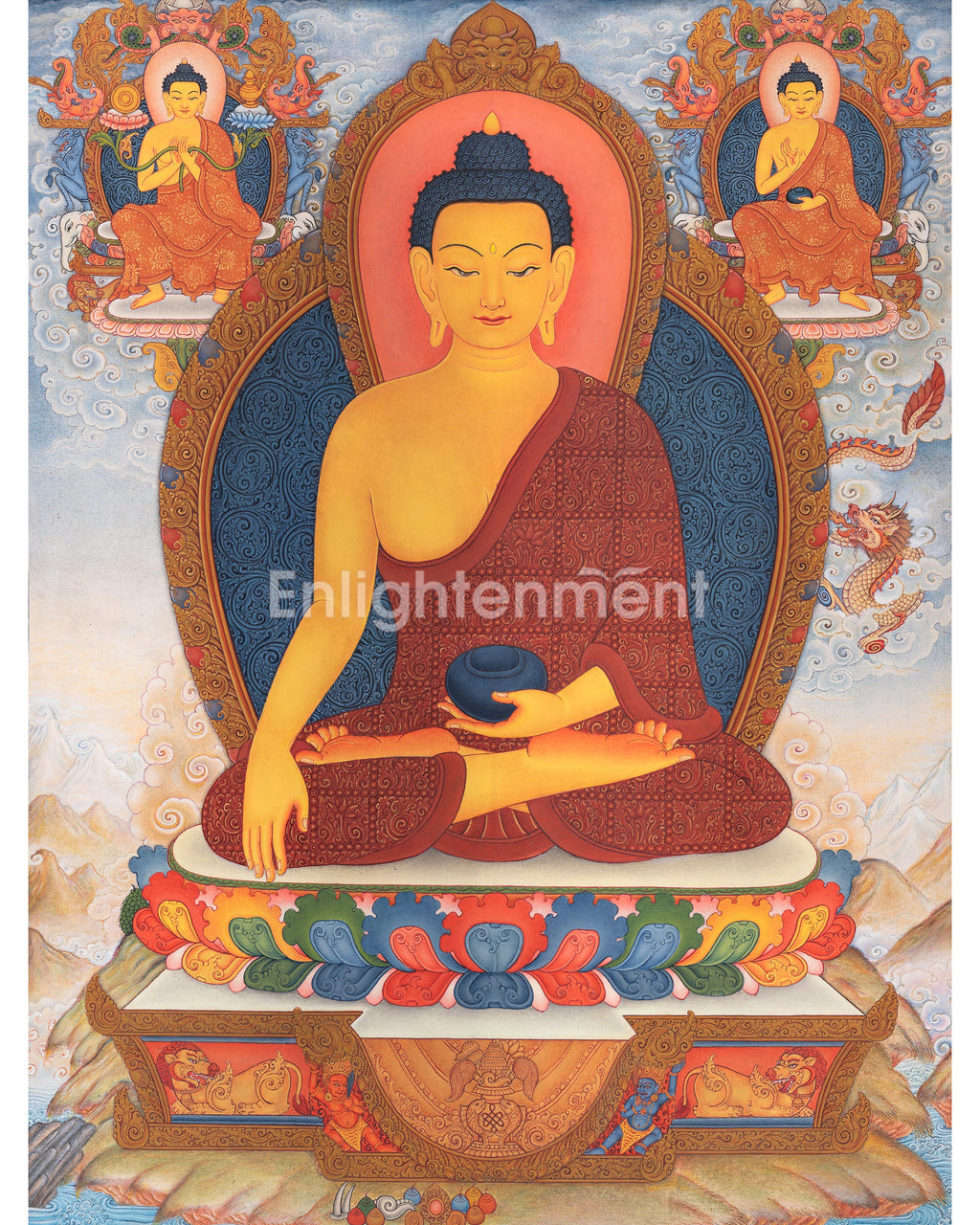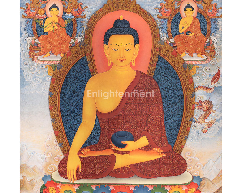 The Buddhas of the Three Times Thangka is a unique hand-painted masterpiece that honours the three primary Buddhas of time: Dipankara, Shakyamuni, and Maitreya, who represent the past, present, and future. This beautiful artwork promotes profound spiritual thought and mindfulness while instilling a timeless sense of serenity and continuity. Each Buddha figure is depicted sitting in traditional positions on a lotus throne, representing wisdom, compassion, and enlightenment, against a backdrop of bright scenery and shimmering 24K gold detailing.