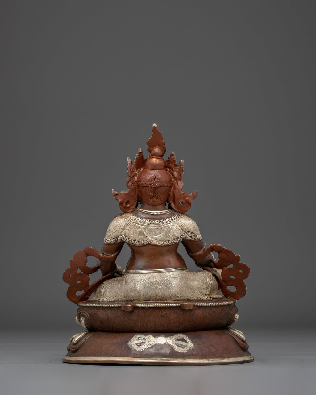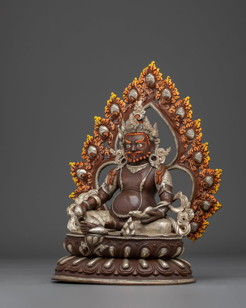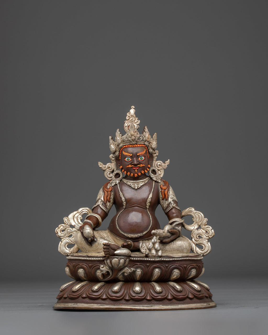 Buddhist Abundance Deity Dzambhala statue is crafted from an oxidized copper body, silver plating, and detailed acrylic paintings. Measuring 11.6”/29.5cm in height and 9.4”/24cm at the base, it weighs 2.82 kg. Revered as the Buddhist deity of wealth and prosperity, Dzambhala is believed to attract abundance and remove financial obstacles. This beautifully detailed statue is a meaningful addition to any altar or spiritual space seeking blessings of prosperity and good fortune.