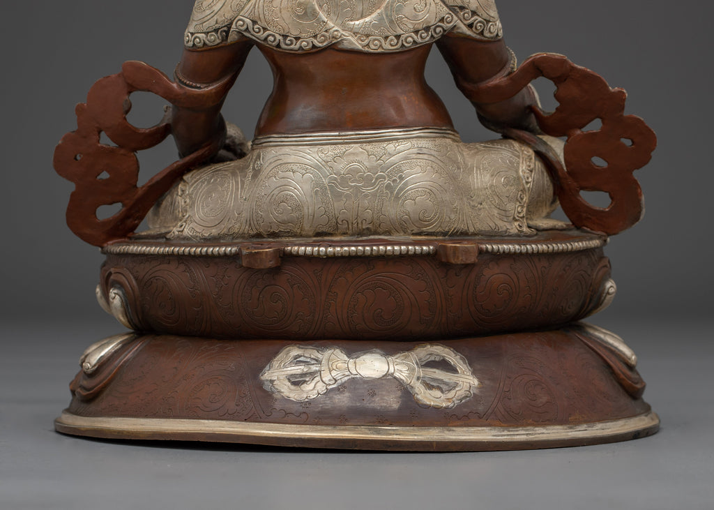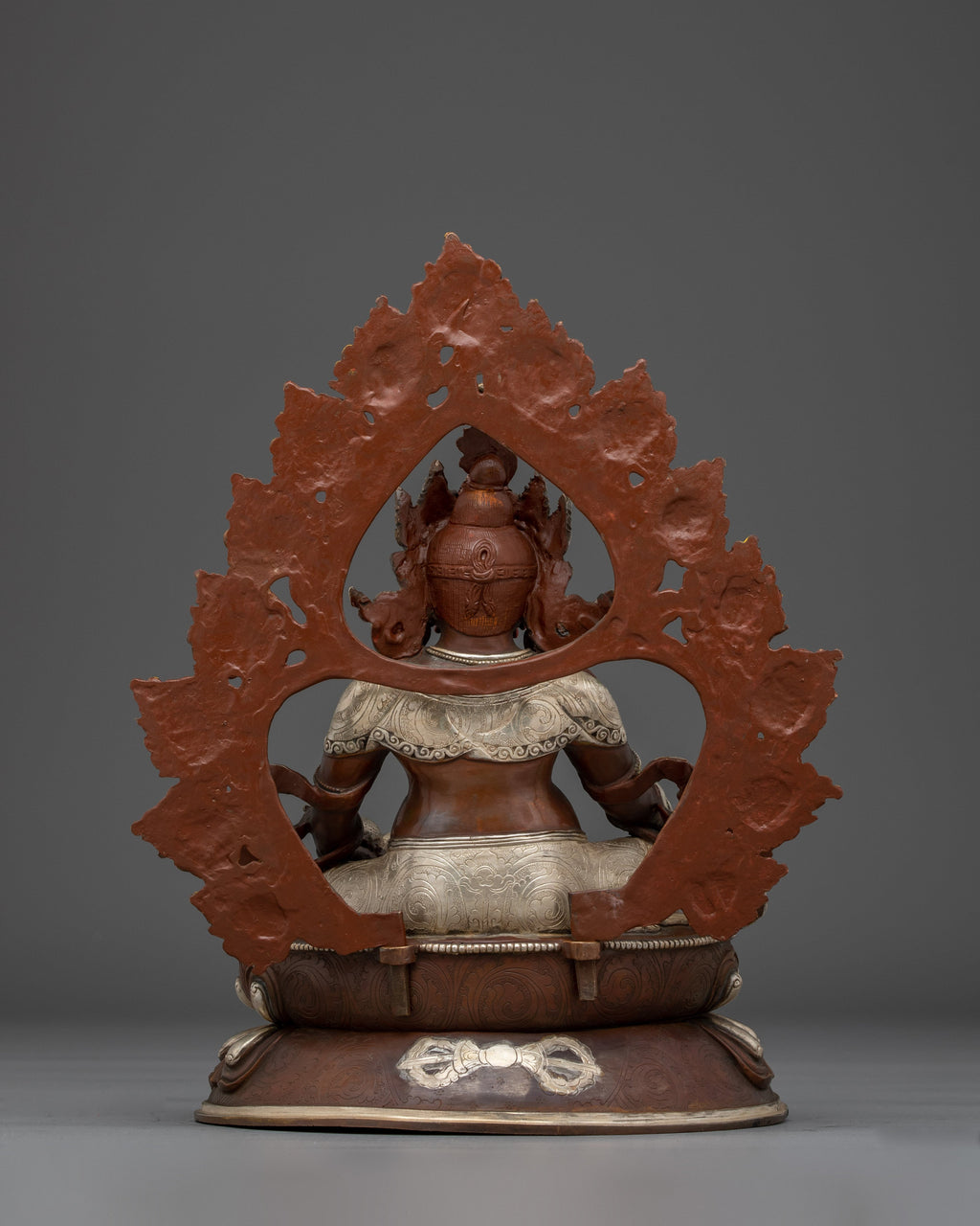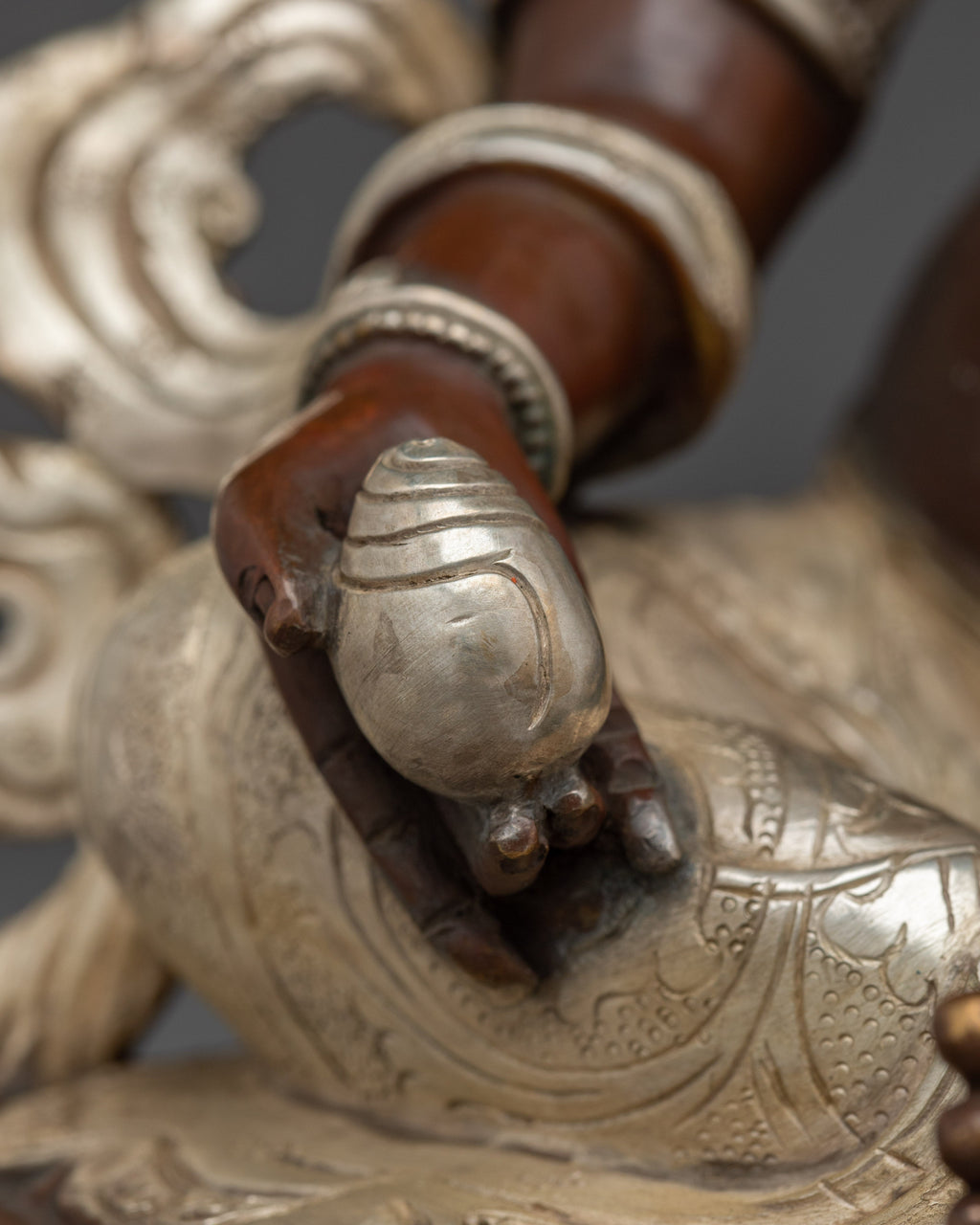 Buddhist Abundance Deity Dzambhala statue is crafted from an oxidized copper body, silver plating, and detailed acrylic paintings. Measuring 11.6”/29.5cm in height and 9.4”/24cm at the base, it weighs 2.82 kg. Revered as the Buddhist deity of wealth and prosperity, Dzambhala is believed to attract abundance and remove financial obstacles. This beautifully detailed statue is a meaningful addition to any altar or spiritual space seeking blessings of prosperity and good fortune.