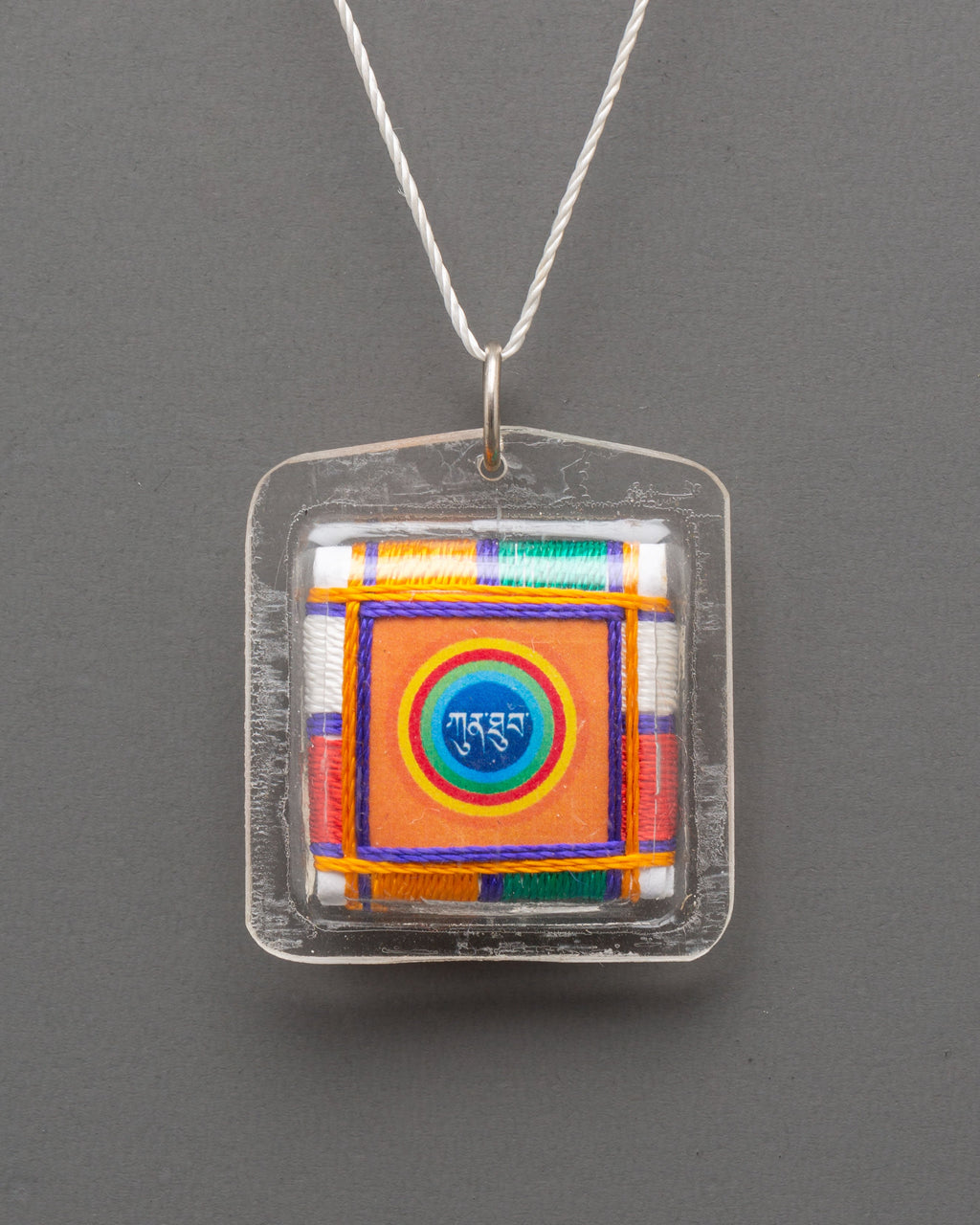 Skilled artisans wrap colorful threads around a blessed image and seal it in a plastic cover for everyday use. Compact and lightweight at 4.5cm (H) x 4cm (W) and 0.006kg, the charm slips into a pocket, rests on a home altar, or hangs on a car mirror—materials: Plastic Cover, Canvas, Thread—made to accompany you wherever you go.