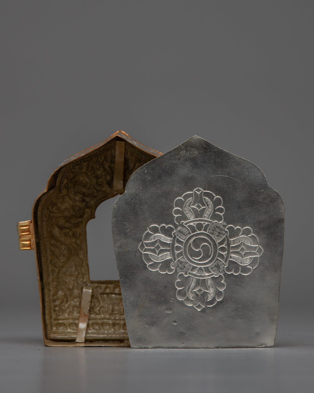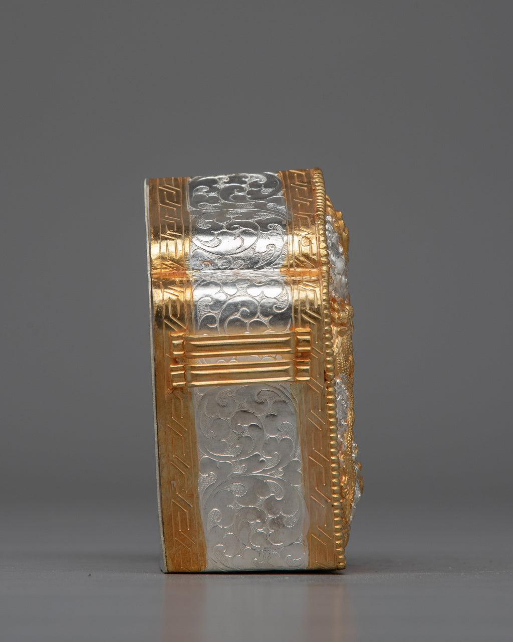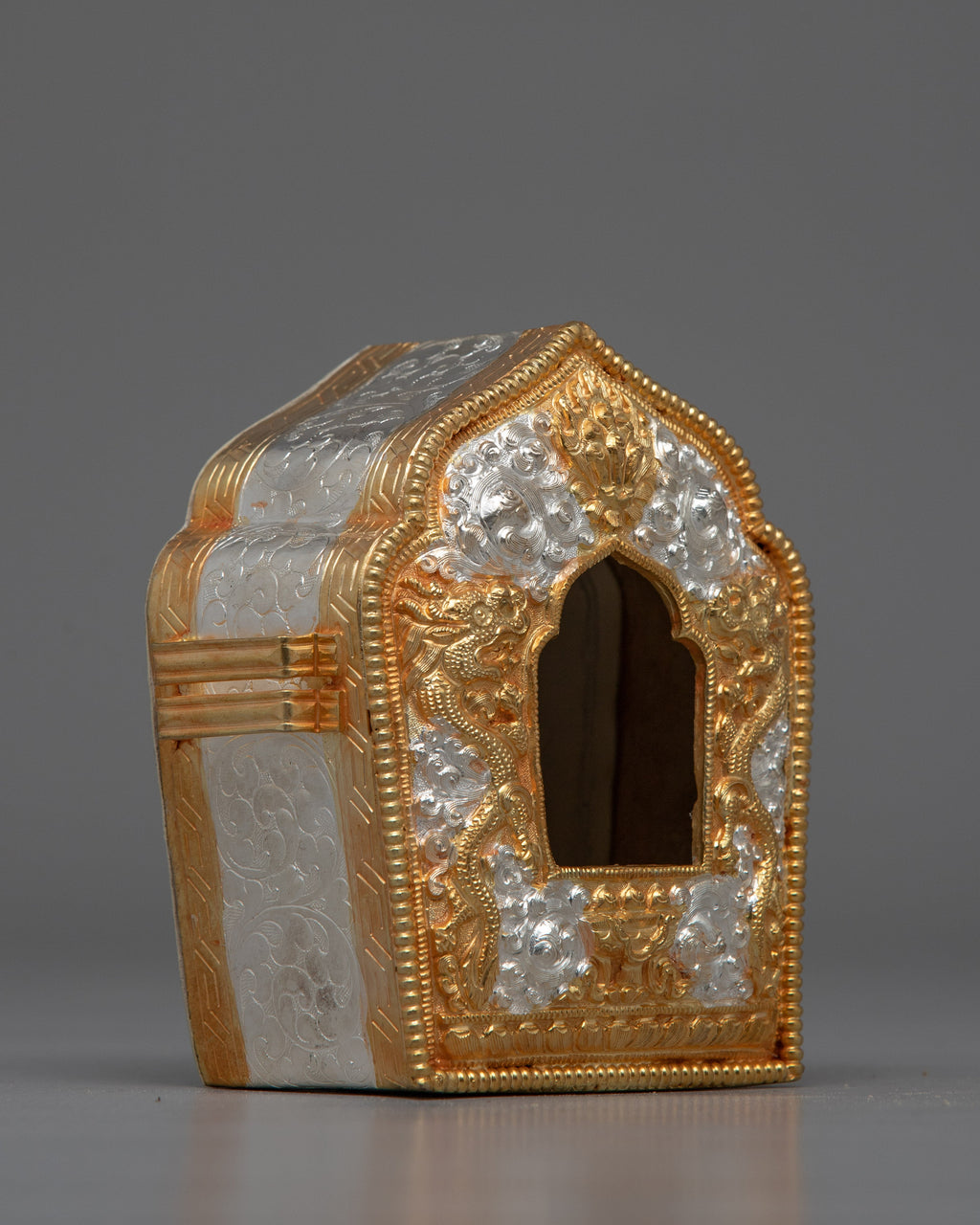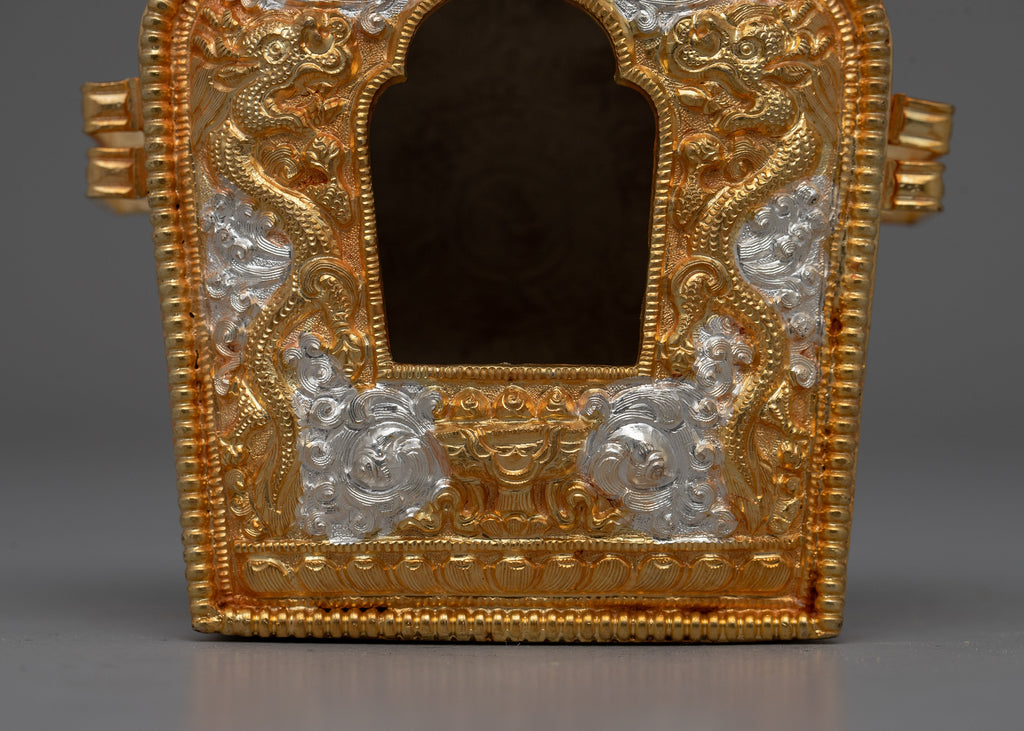 The iconography on this Ghau Box is rich in meaning, with elaborate engravings of fortunate symbols and sacred motifs. The front is frequently decorated with the Ashtamangala (Eight Auspicious Symbols), which include the Pair of Dragons, Endless Knot, Lotus, and Dharma Wheel, each representing interconnectivity, purity, and the path to enlightenment. Delicate floral patterns and geometric shapes add to its artistic splendor, suggesting growth and equilibrium. The use of gold and silver plating not only creates a bright beauty, but it also represents the dual nature of knowledge and compassion in Buddhist teachings. This amulet box is more than just a container; it is a spiritual talisman symbolizing protection, devotion, and divine favors.