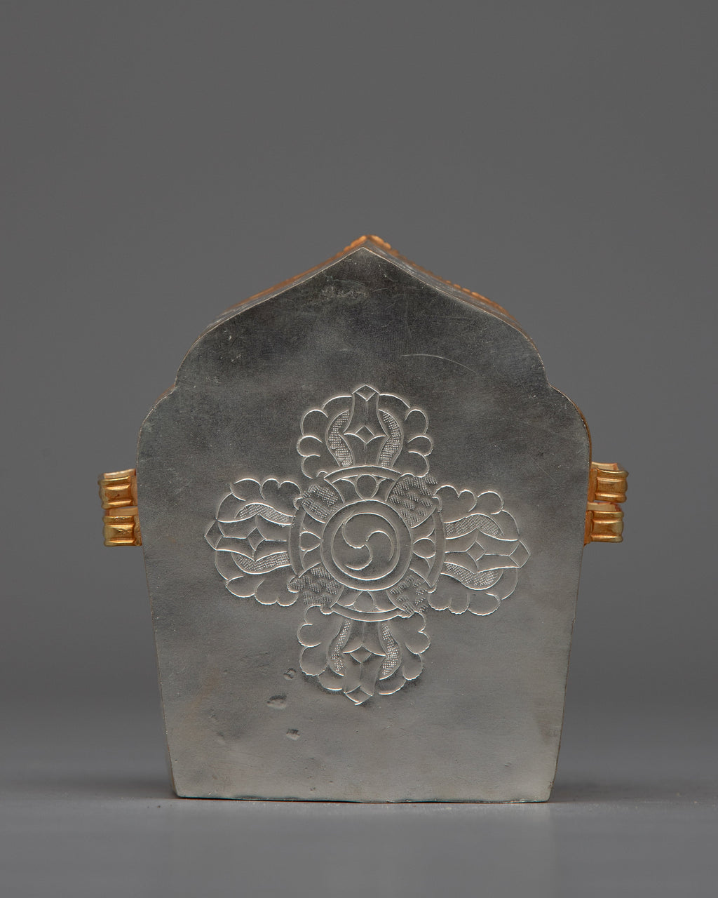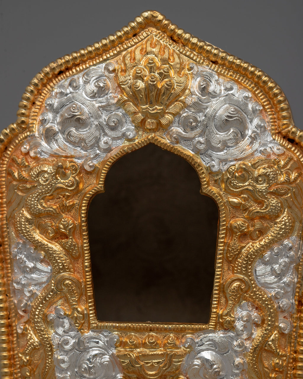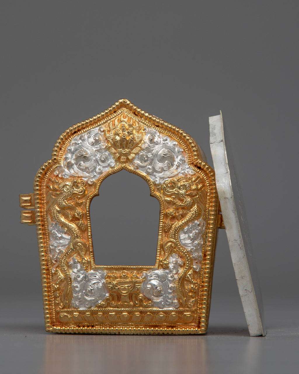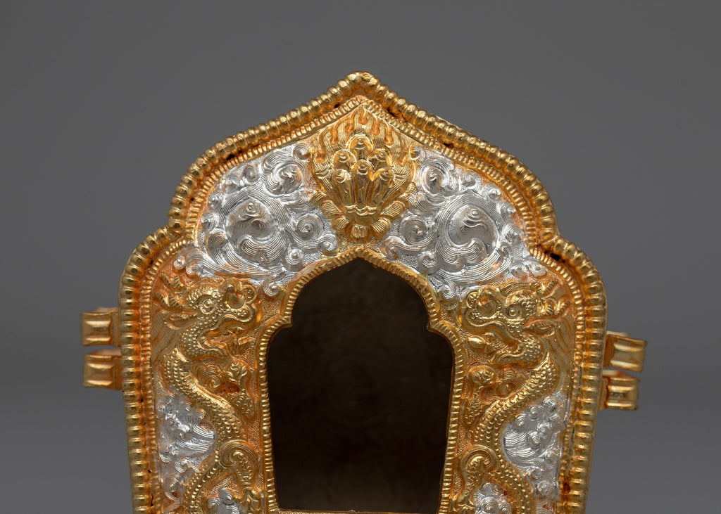 The iconography on this Ghau Box is rich in meaning, with elaborate engravings of fortunate symbols and sacred motifs. The front is frequently decorated with the Ashtamangala (Eight Auspicious Symbols), which include the Pair of Dragons, Endless Knot, Lotus, and Dharma Wheel, each representing interconnectivity, purity, and the path to enlightenment. Delicate floral patterns and geometric shapes add to its artistic splendor, suggesting growth and equilibrium. The use of gold and silver plating not only creates a bright beauty, but it also represents the dual nature of knowledge and compassion in Buddhist teachings. This amulet box is more than just a container; it is a spiritual talisman symbolizing protection, devotion, and divine favors.