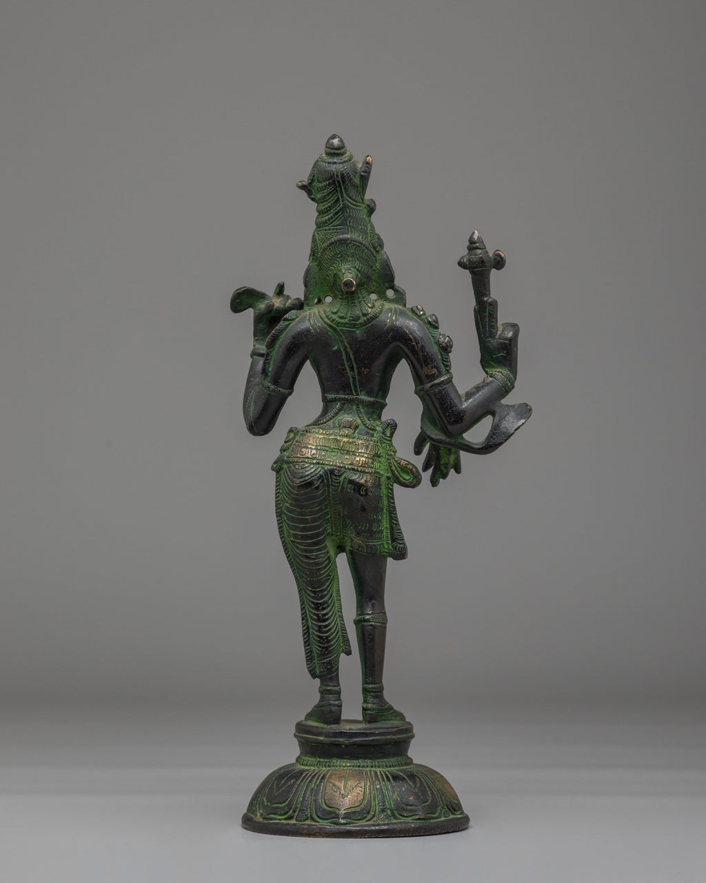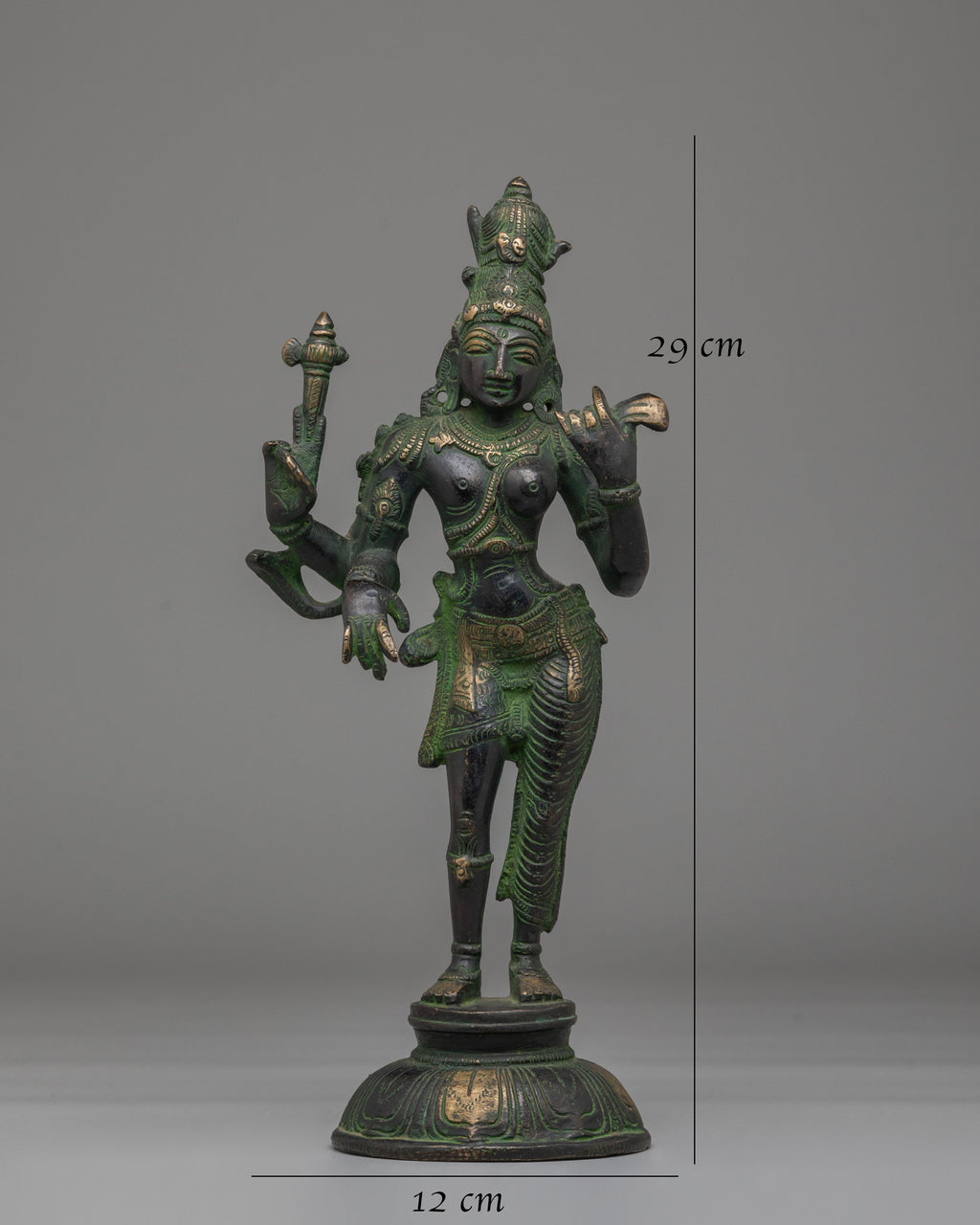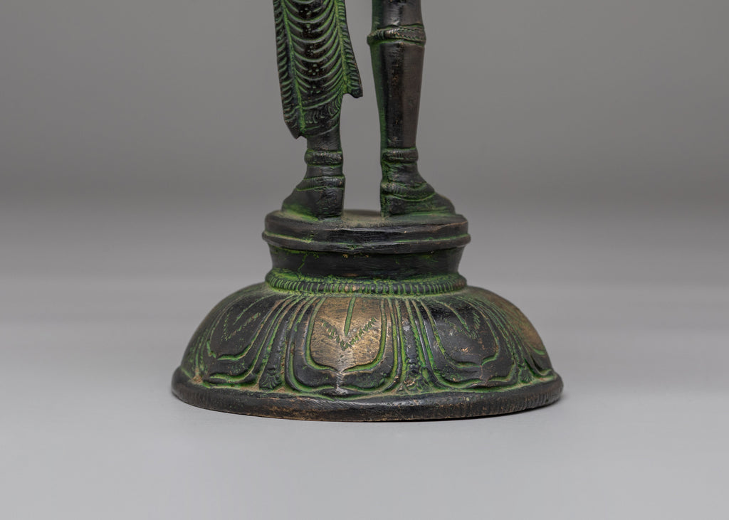 This Handcrafted Bronze Buddhist Ardhanarishvara Statue measures 29 cm in height and 12 cm in width, with a weight of 2.01 kg. Made of bronze, the statue has a stable and balanced structure, making it suitable for placement on a home altar, meditation space, or as a decorative spiritual centerpiece. Its compact yet prominent size allows it to be a focal point in both personal and sacred spaces.