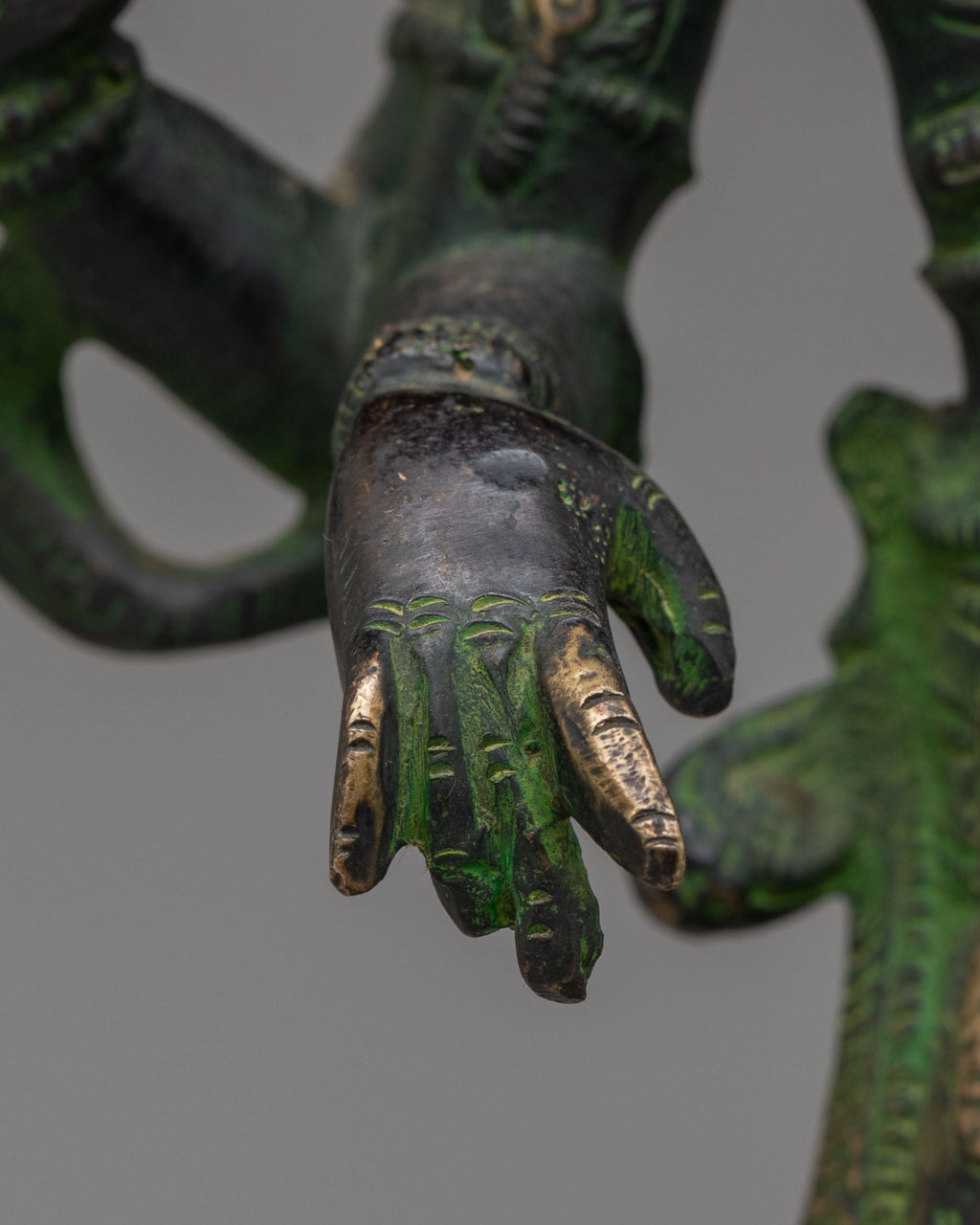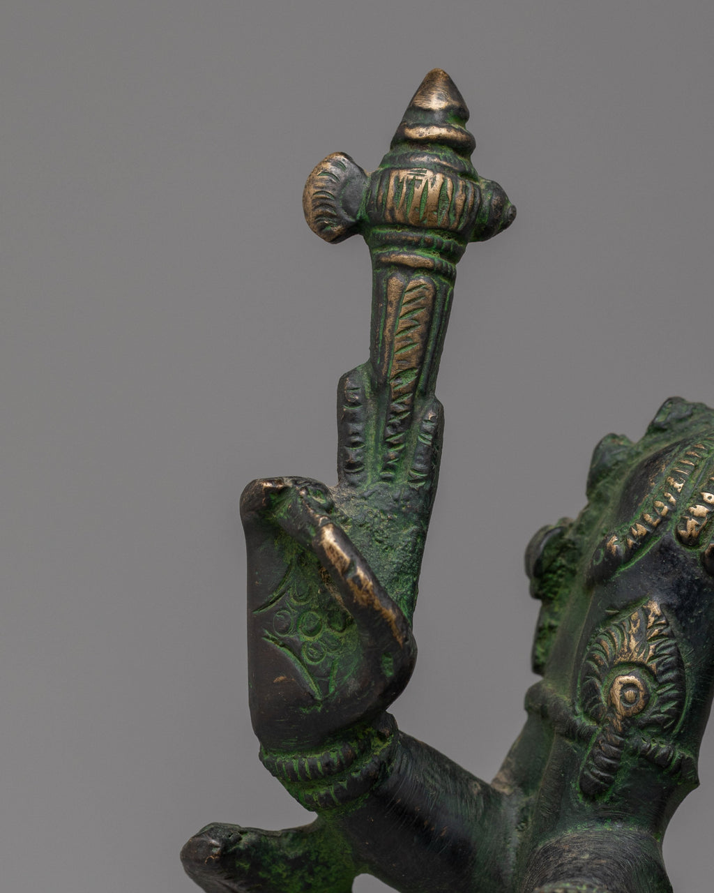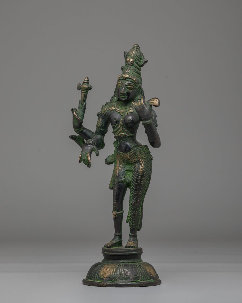 Ardhanarishvara represents the combined form of Lord Shiva and Goddess Parvati, symbolizing the union of masculine and feminine energies. The sculpture is divided vertically, with one half depicting Shiva and the other Parvati. Traditional iconographic details such as contrasting attire, ornaments, and posture highlight the dual yet unified nature of the form. This representation reflects harmony, balance, and the interdependence of creation.