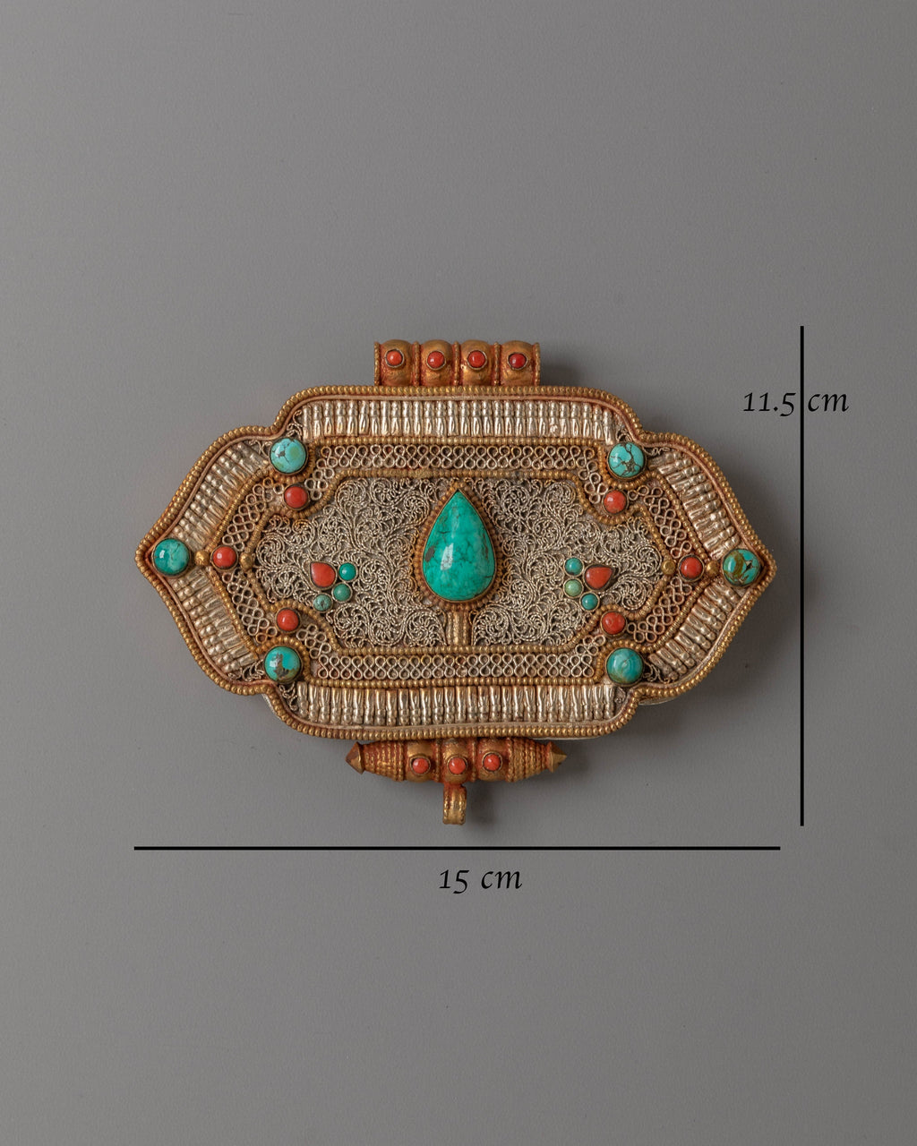 The surface of the locket is richly decorated with natural turquoise and coral stones that carry deep cultural meaning in Tibetan tradition. Turquoise is associated with spiritual grounding, while coral is linked to vitality and courage. Their placement across the piece highlights traditional motifs that echo blessings, compassion, and spiritual guardianship. These symbolic elements give the Ghau box a meaningful connection to Buddhist practice and protective energy.