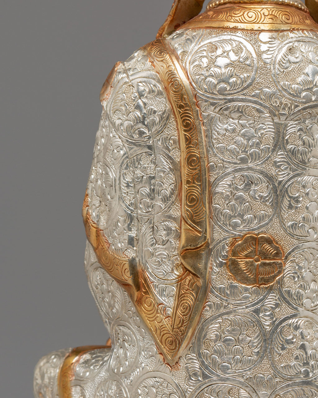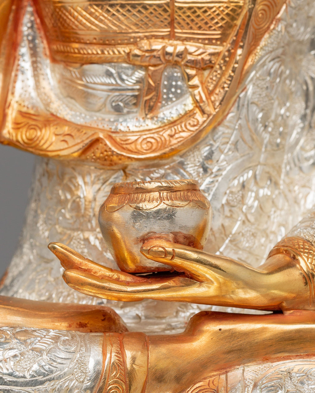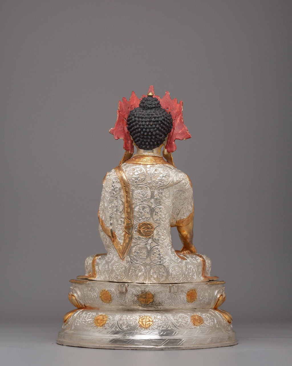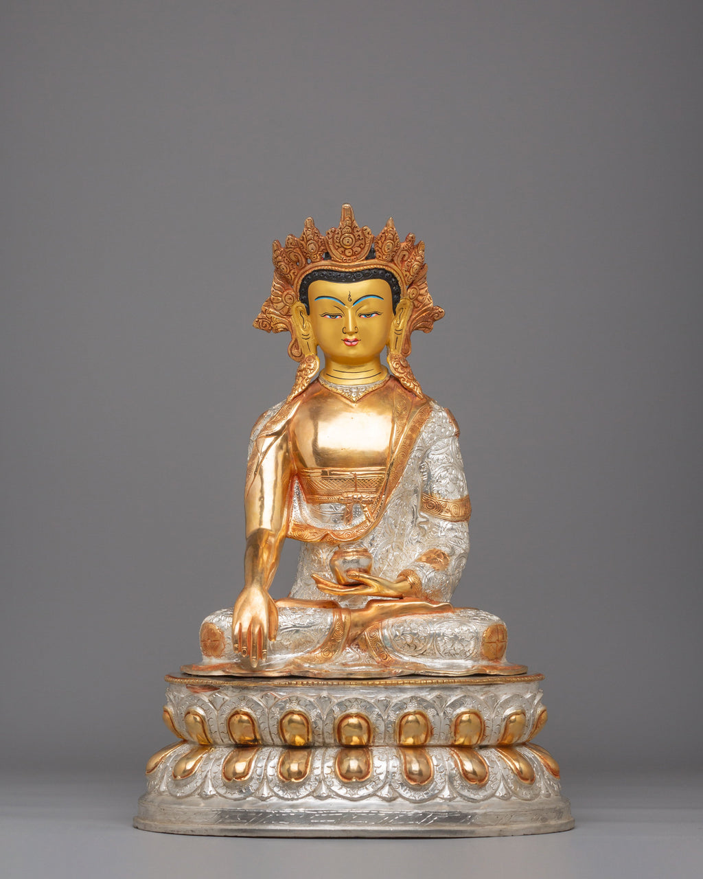 This Buddhist Crown Shakyamuni Buddha Statue, crafted from copper and plated in 24K gold, electro-gold, and silver, is a beautiful and spiritual piece of art. It measures 55.5 cm in height and 38 cm in width, weighing 9.81 kg. The intricate detailing and craftsmanship make it an ideal addition to any sacred space or meditation altar. This statue serves as a powerful symbol of enlightenment and peace, bringing tranquility and positivity to your surroundings.