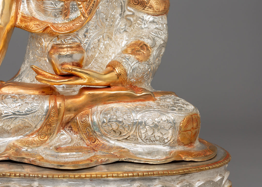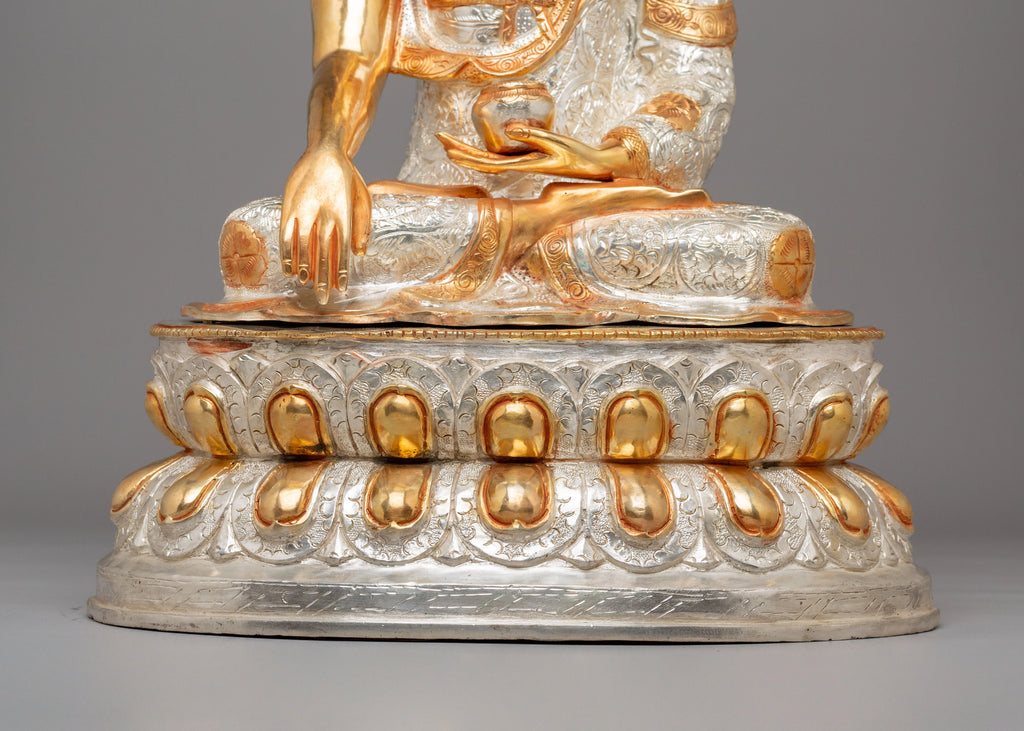This Shakyamuni Buddha statue, known as the "Sage of the Shakya Clan," portrays the historical Buddha in a moment of serene enlightenment beneath the Bodhi tree. He represents purity and spiritual awakening in the Vajra posture (Padmasana) on a lotus base. His right hand is extended toward the earth in the Bhumisparsha Mudra, inviting the world to witness his enlightenment. His left hand holds an alms bowl in his lap, symbolising renunciation. The ushnisha atop his head signifies wisdom, and the spiral curls covering his head are said to represent the snails that protected him from the scorching sun during his meditation—an emblem of selfless devotion and nature’s reverence. His serene face reflects inner peace and deep meditation.