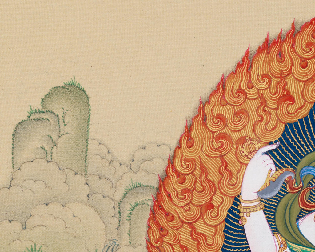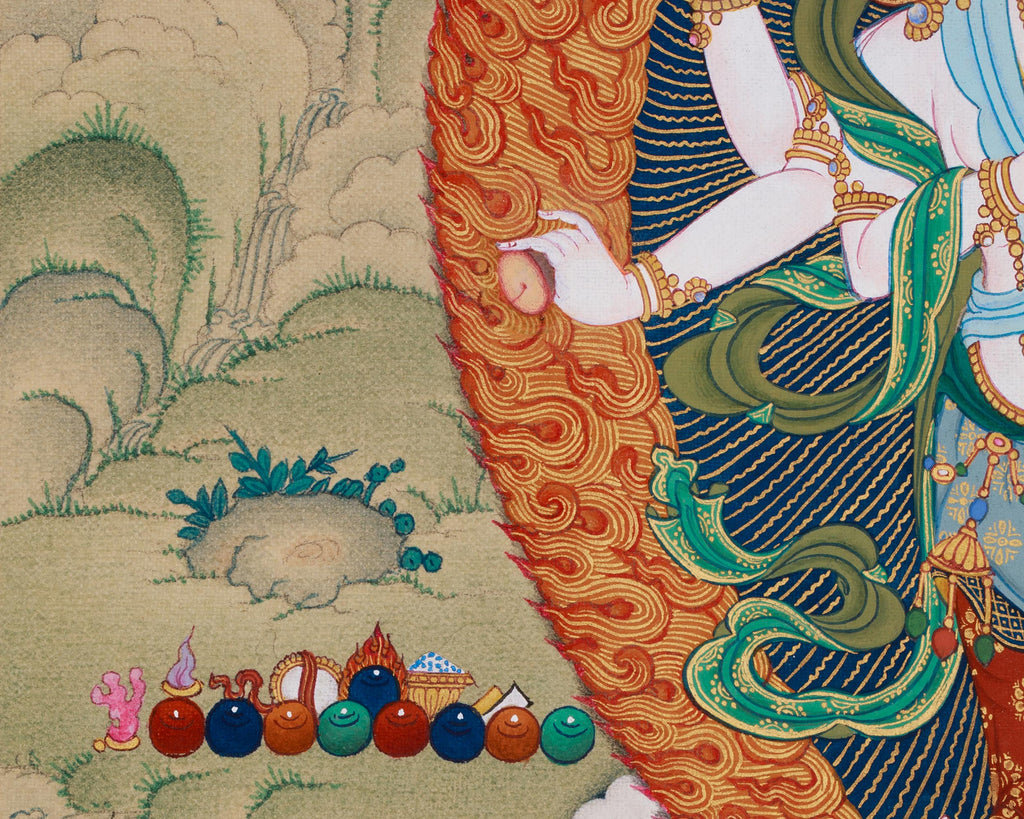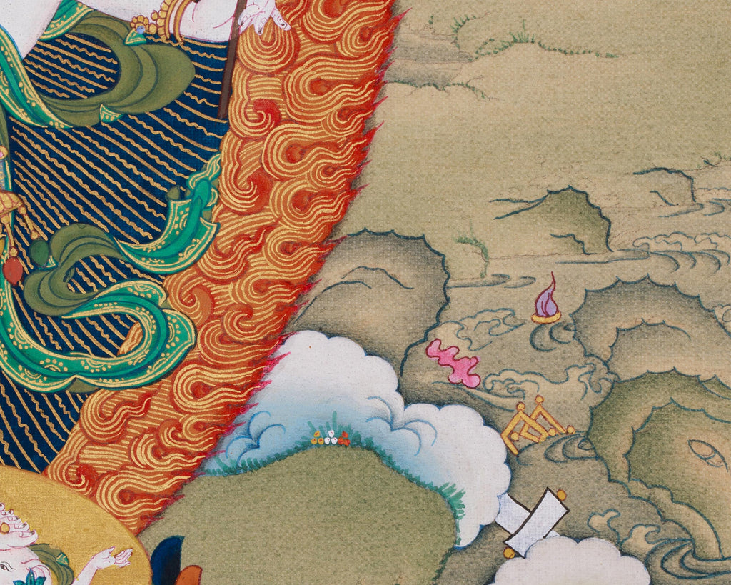 In Vajrayana Buddhism, White Mahakala is regarded as a compassionate protector and an embodiment of Avalokiteshvara, the Bodhisattva of Compassion. Unlike the intimidating black form, White Mahakala symbolizes calming and nurturing qualities—bringing prosperity, removing obstacles, and fostering spiritual and material growth. In this thangka, he stands nobly on a lotus and sun disc, encircled by a vivid halo of sacred flames representing transformation. His white figure symbolizes purity and strength, with six arms holding tools that represent his divine roles of protecting, nurturing, and blessing. The surrounding landscape, painted in the Karma Gadri style, enhances his fierce yet compassionate presence.